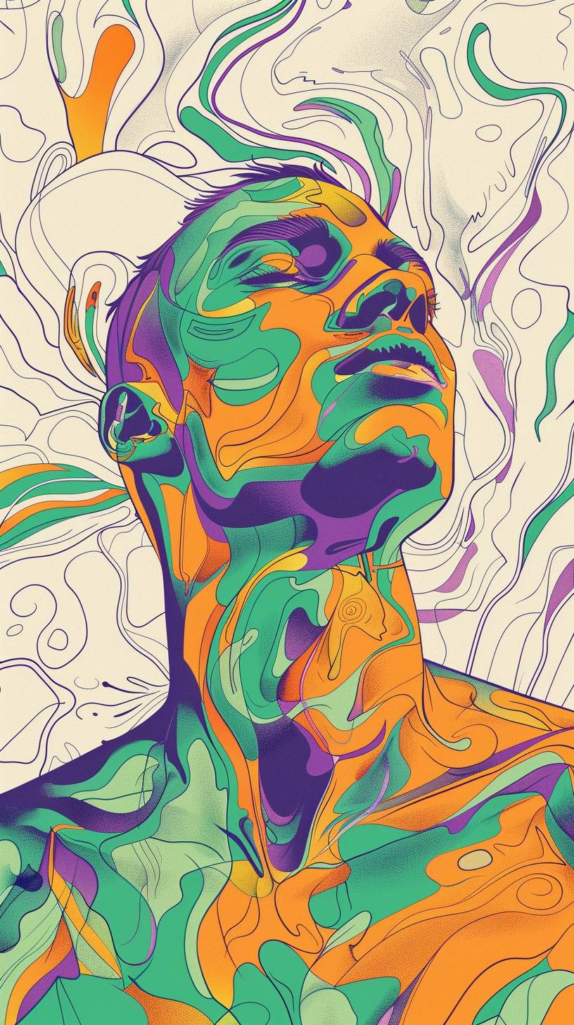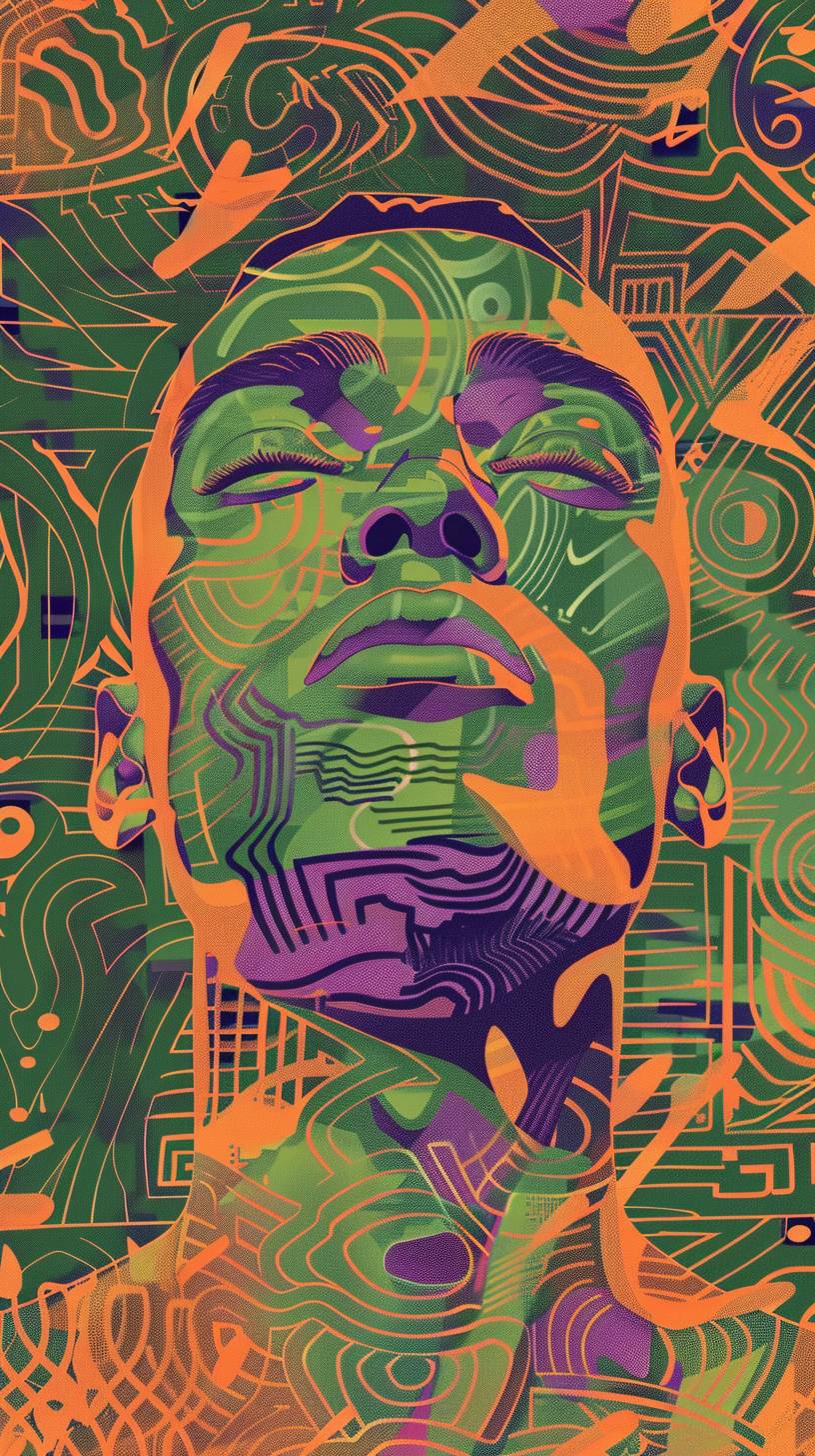 illustration, upper-body, man, front, simplify, consisting of orange and green with purple limit colors, artistic stylish pattern background, masterpiece --ar 9:16 --v 6.0