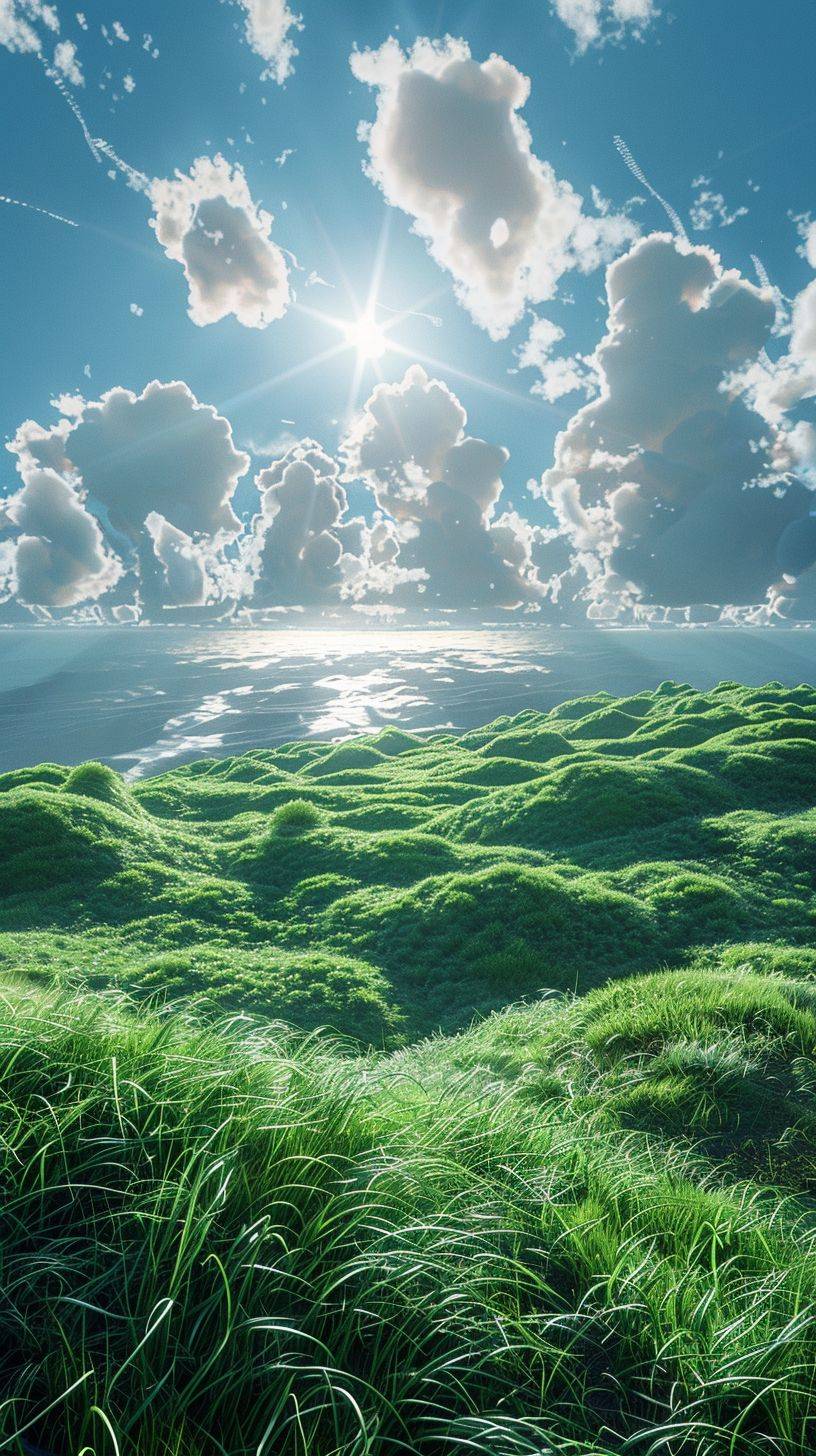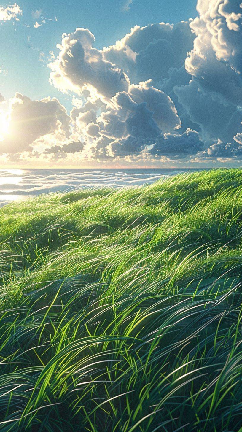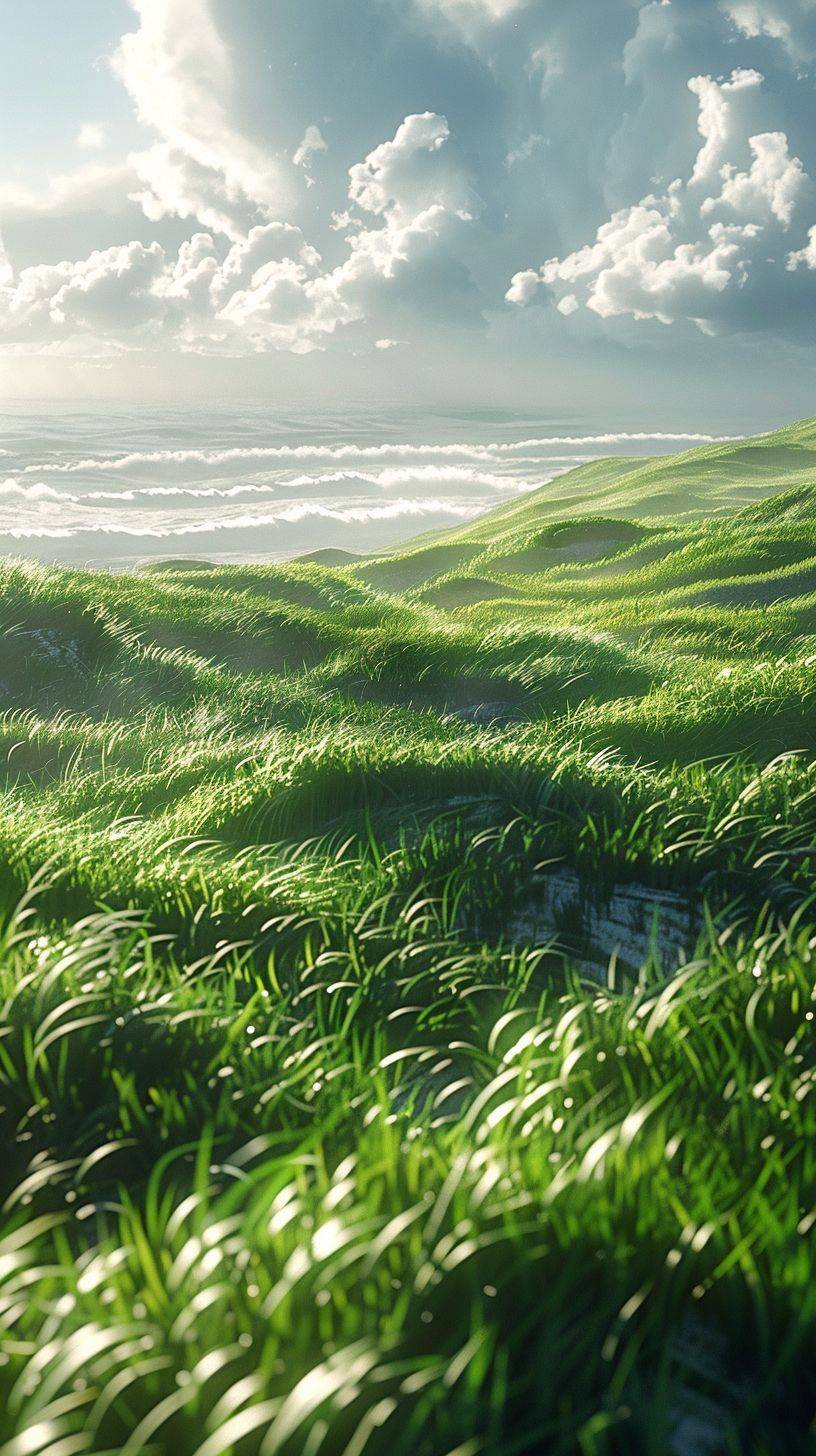 in Realistic anime style, top view grassland, Tall green grass, the wind blows the grass into waves, rolling up and down, the endless sea of grass, Sunlight penetrates through the clouds, On the hillside by the sea,A patchwork of light and shadow,thick clouds, vivid,shadows,saturated,Bottom view,rendered in cinema4d,wide view,environment, vibrant, colourful, imaginative,full details,high definition image,photography,realistic,photorealistic,film photography,cinematic,highly detailed --ar 9:16 --stylize 250