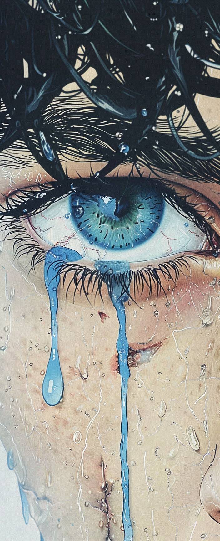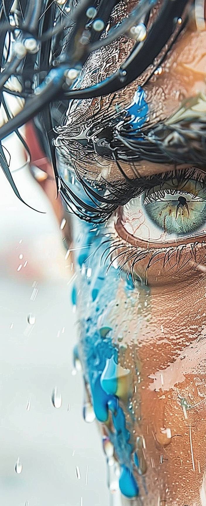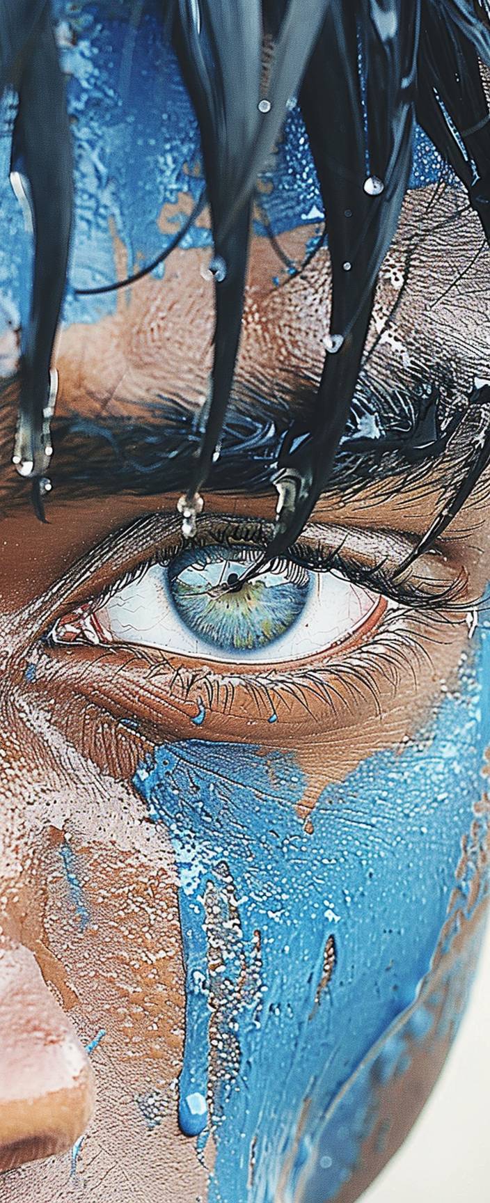 Gros plan extrême, œil vert, peau bleue et noire contusionnée
