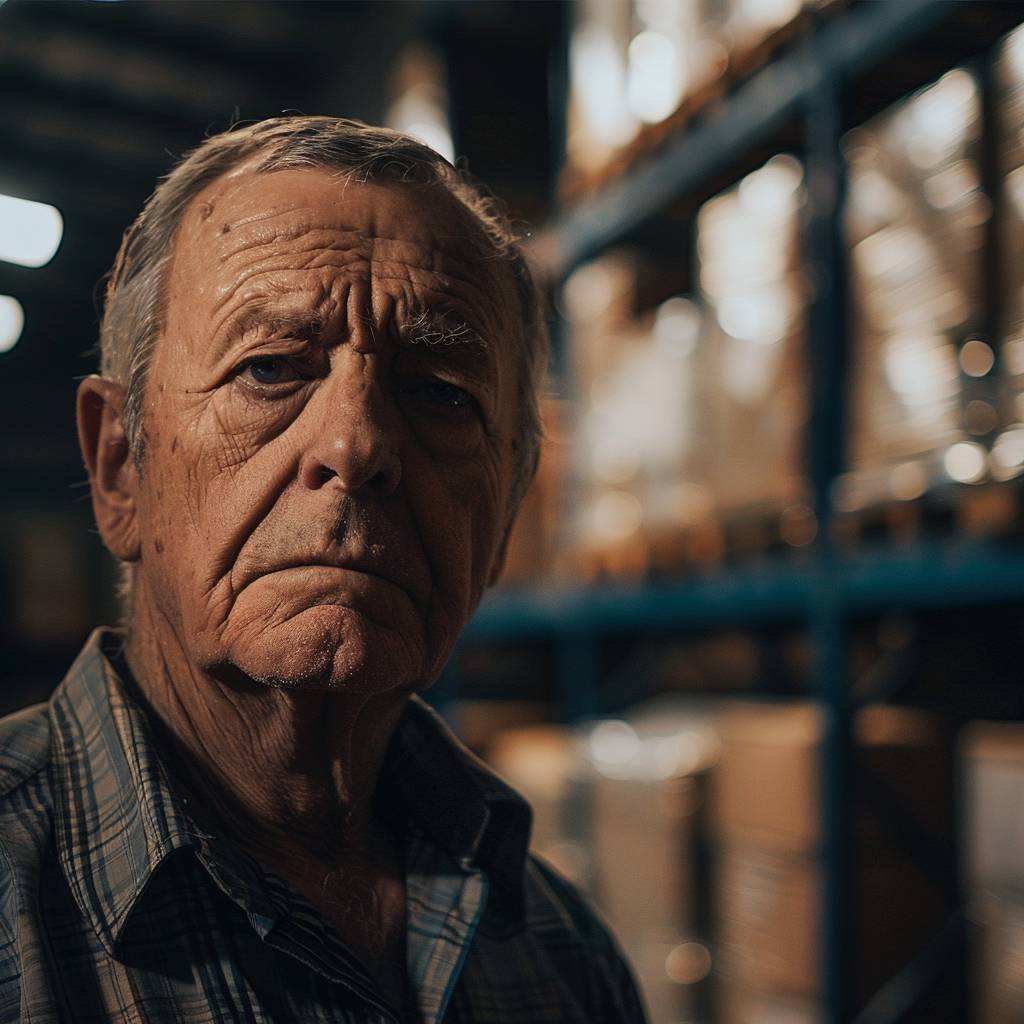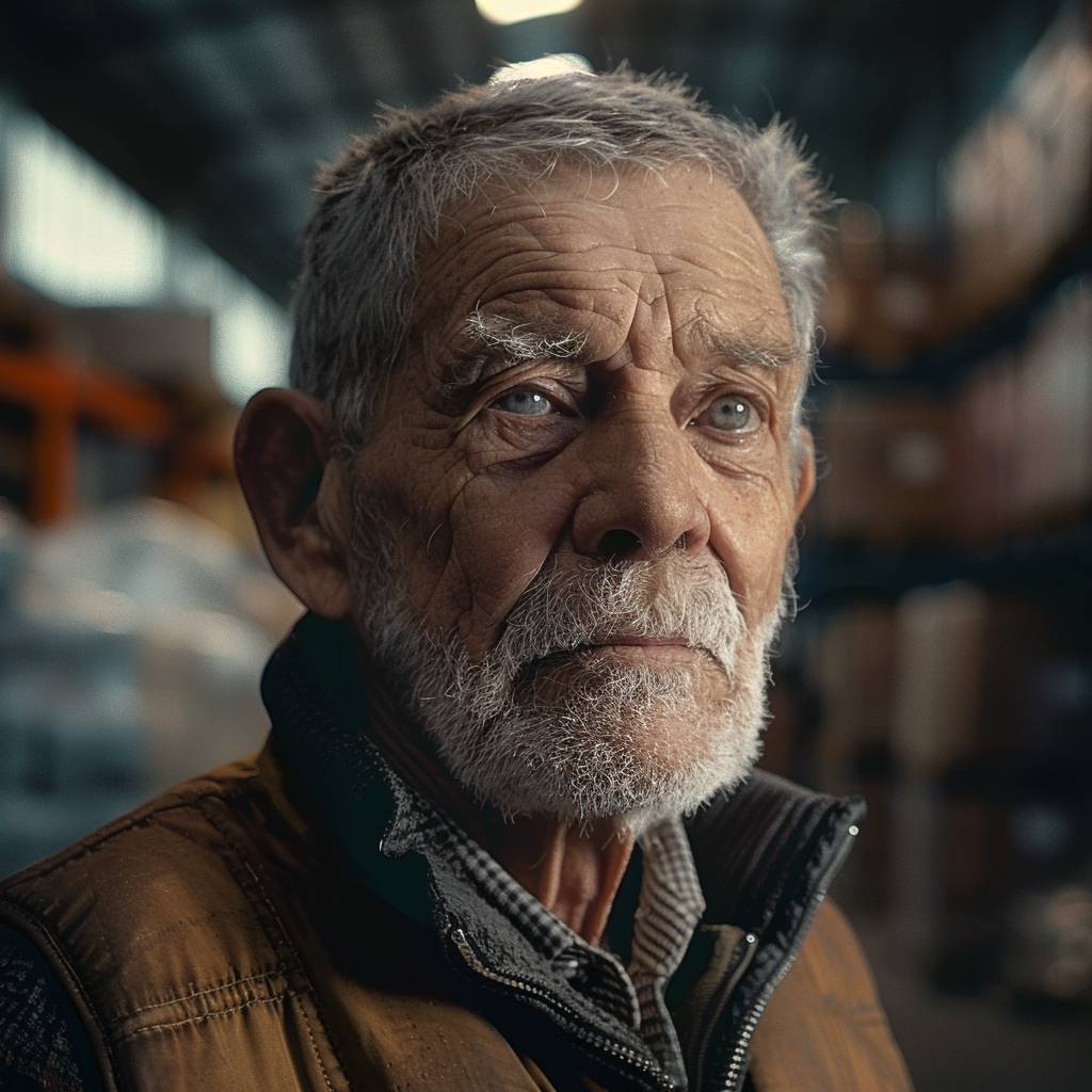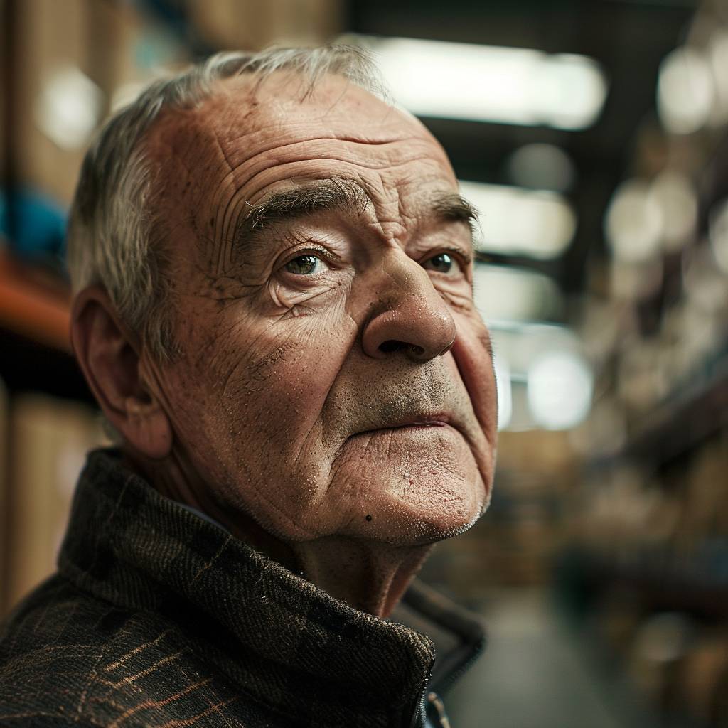 Gros plan d'un homme âgé dans un entrepôt, la caméra se dézoome.