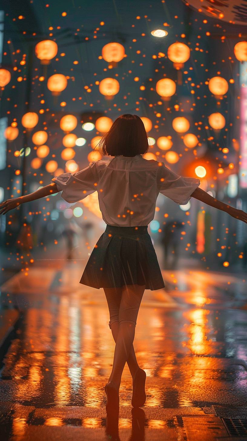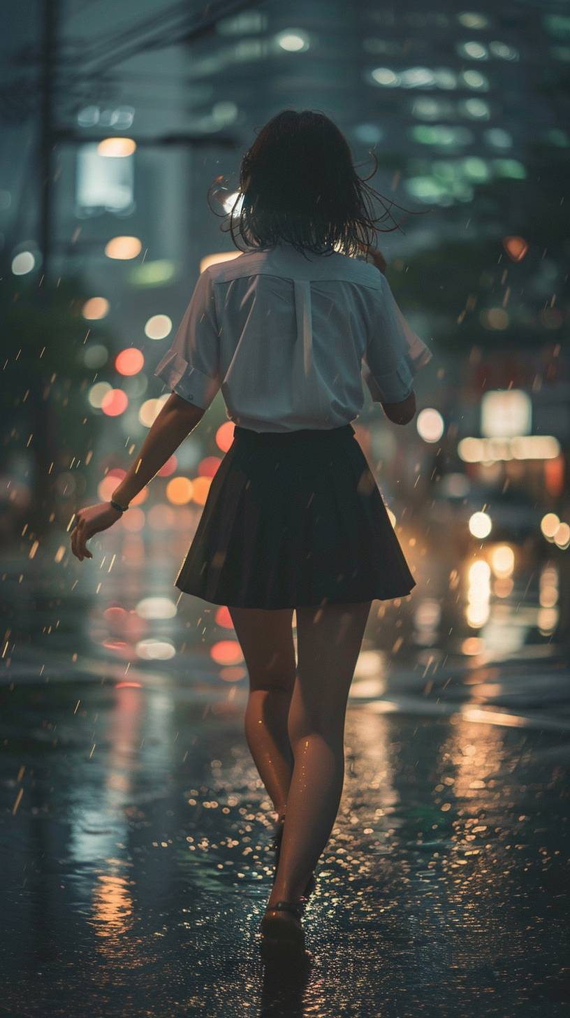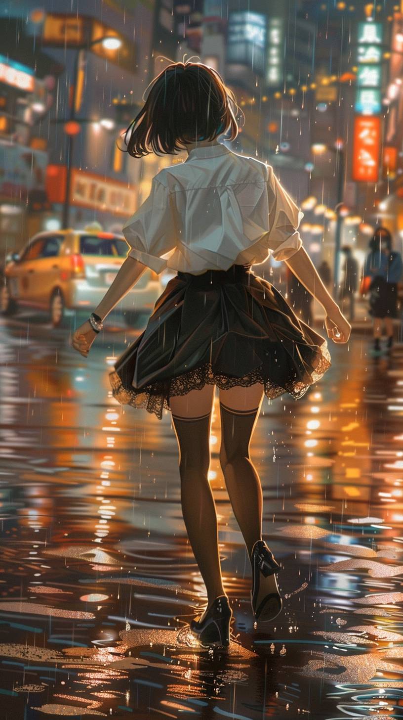 warm-toned,cute style,evening ,japanese middle-aged woman,short hair,white shirt ,Black short skirt,stockings,Roadside in the city,rain,Back body,the reverse side,She walked happily, as if dancing --ar 9:16 --iw 1.2 --v 6.0