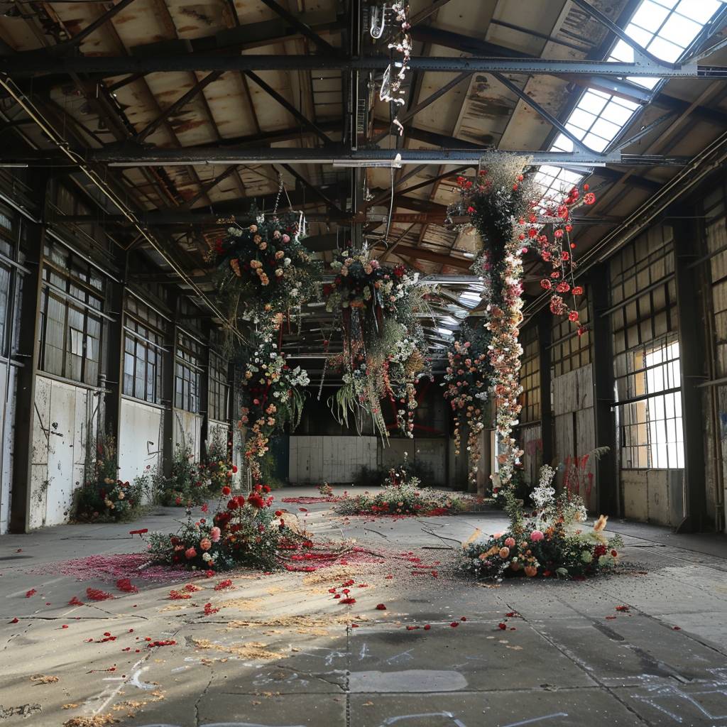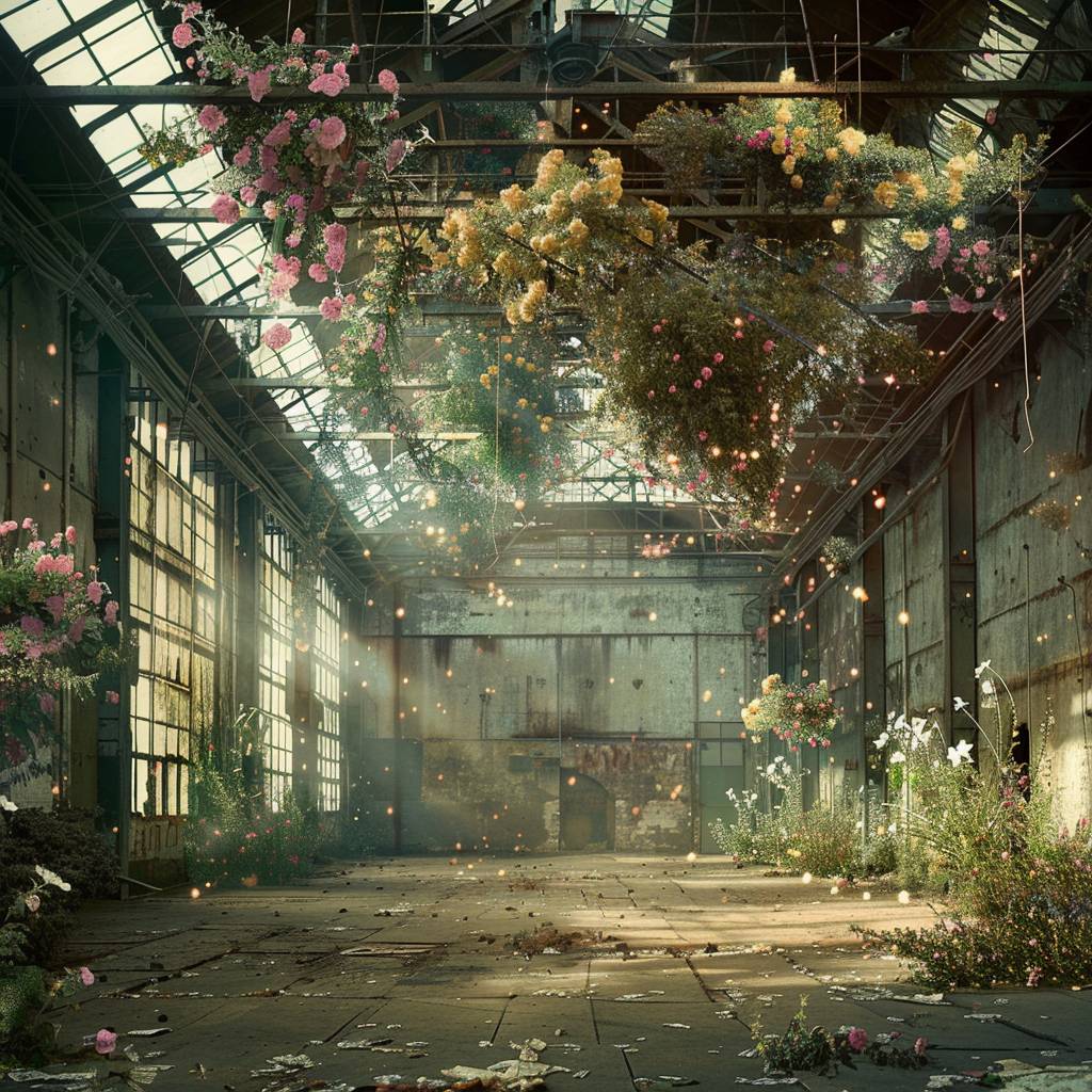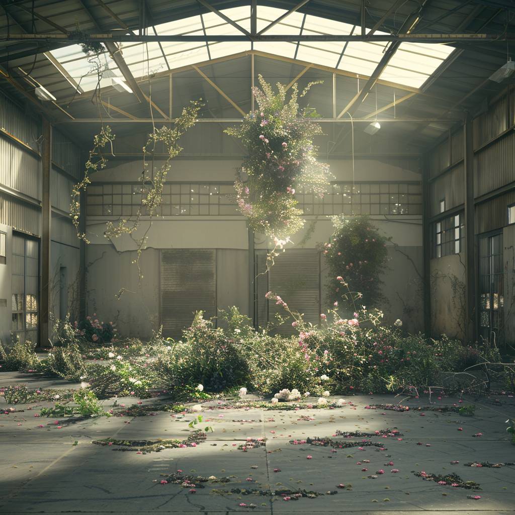 Un entrepôt vide transformé dynamiquement par la flore qui explose du sol.
