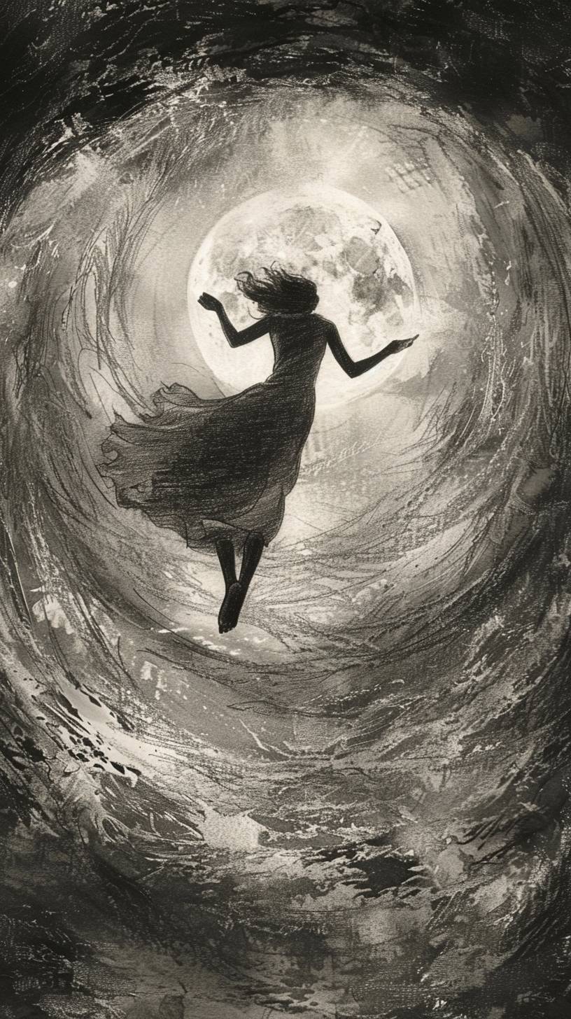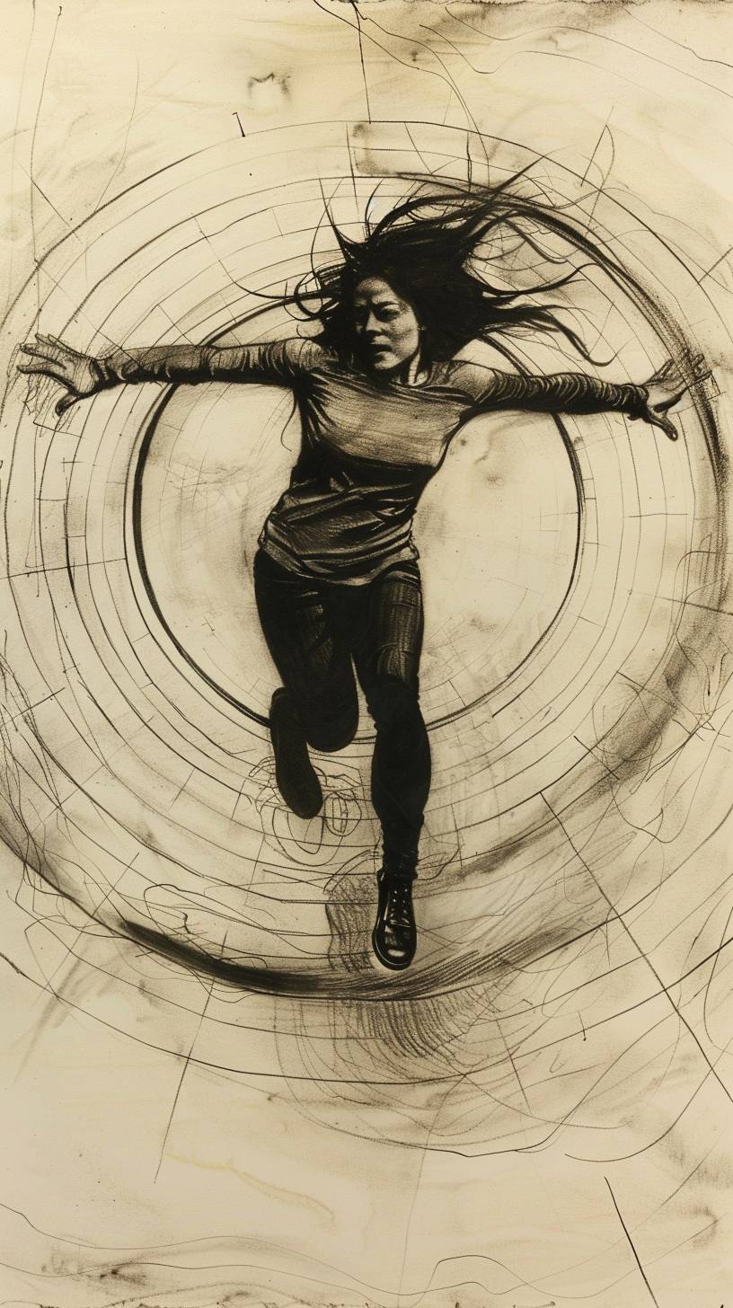 Un dessin d'une femme volant dans un tunnel circulaire