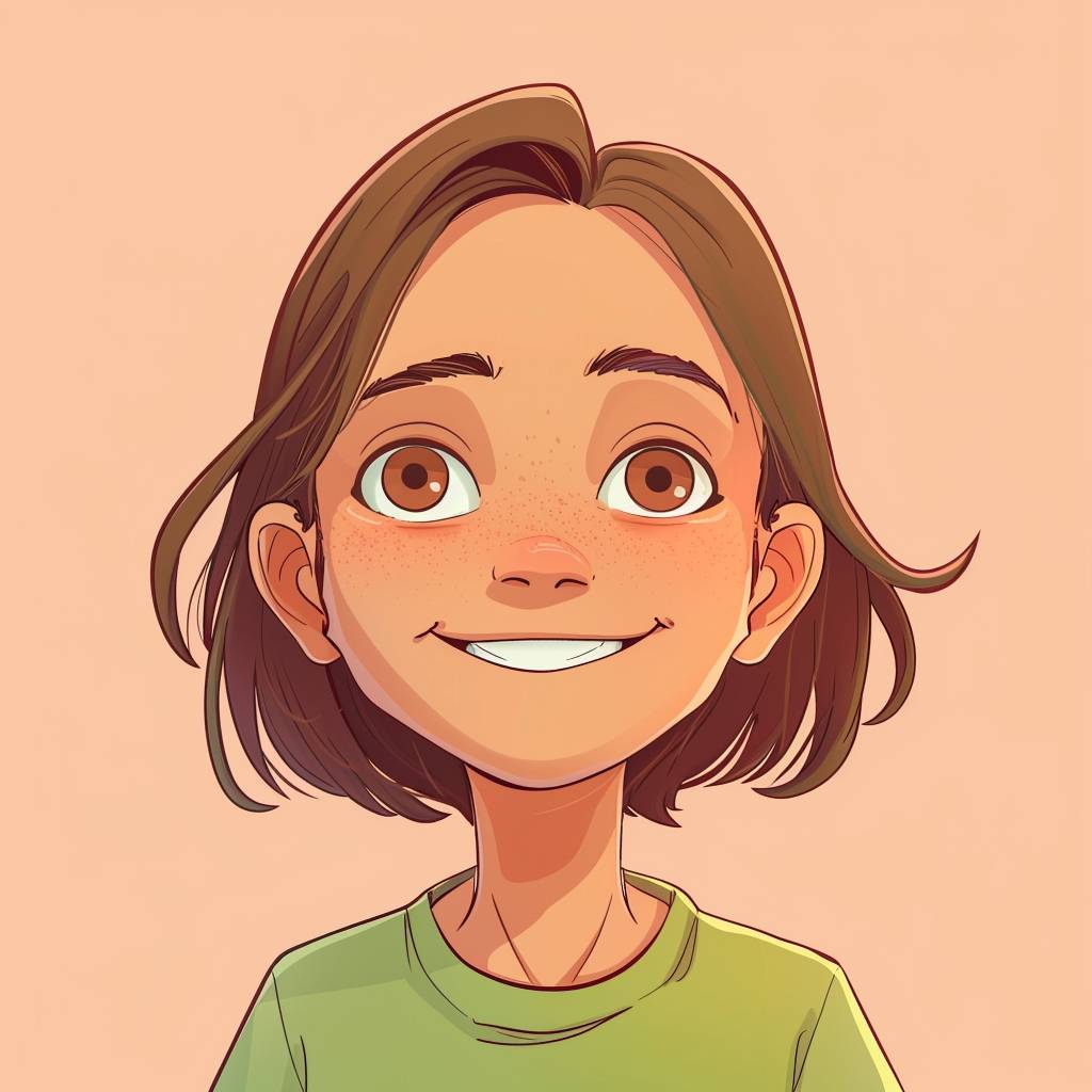 Un portrait d'un enfant souriant regardant directement vers l'appareil photo, dans le style artistique de Raina Telgemeier. Expression lumineuse et joyeuse, lignes nettes, couleurs vives. Fond simple, style de bande dessinée, caractéristiques faciales détaillées, design plat.