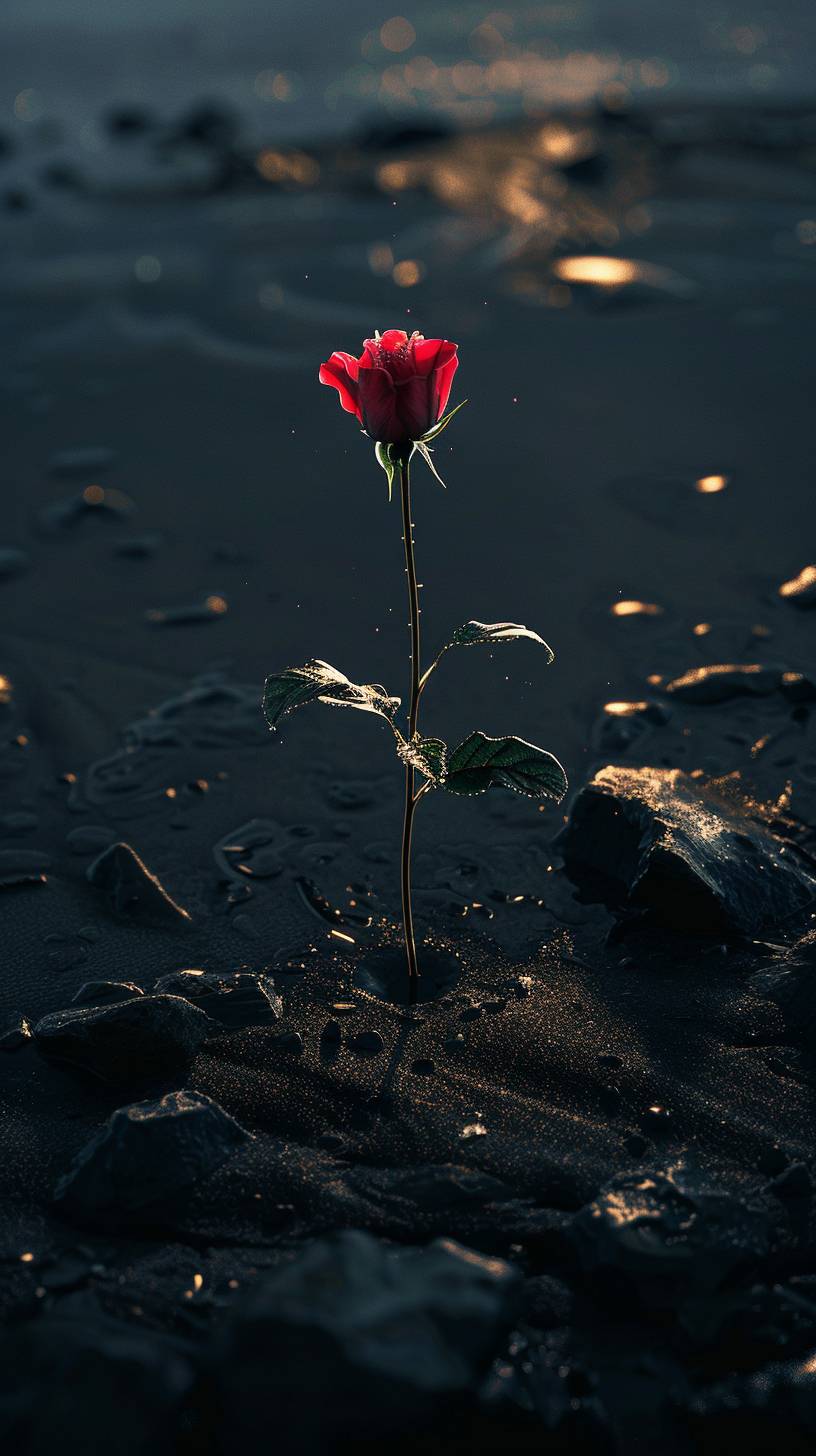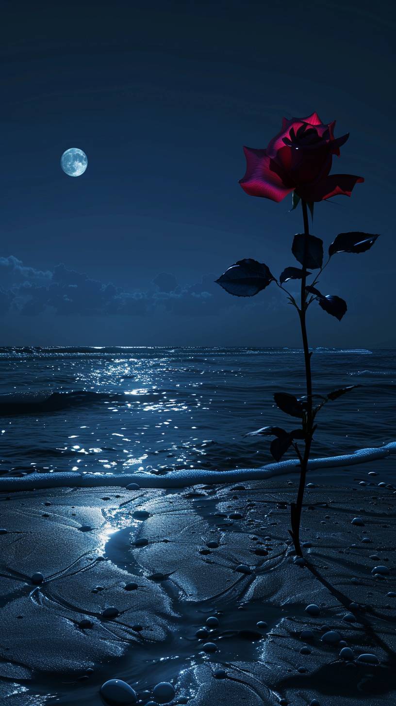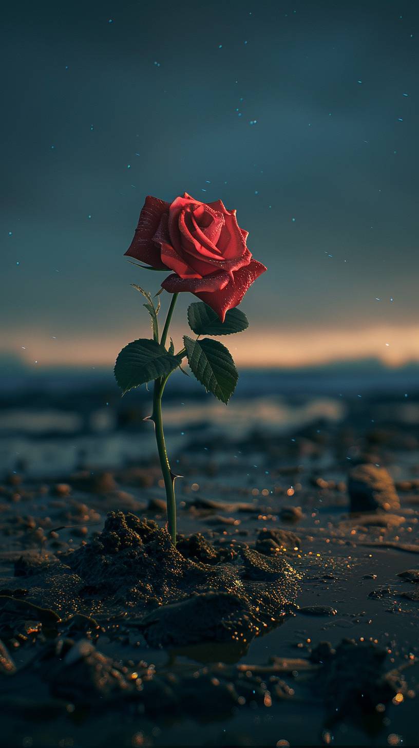 Une rose est plantée sur la plage la nuit.