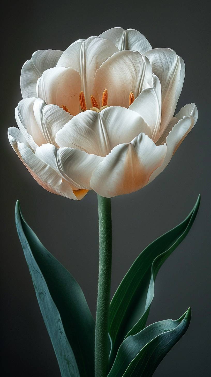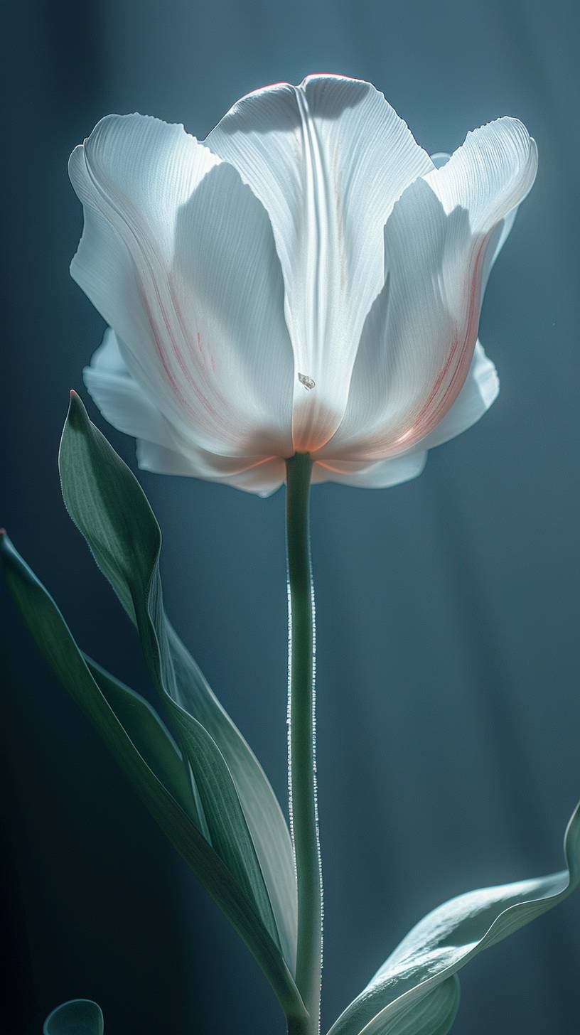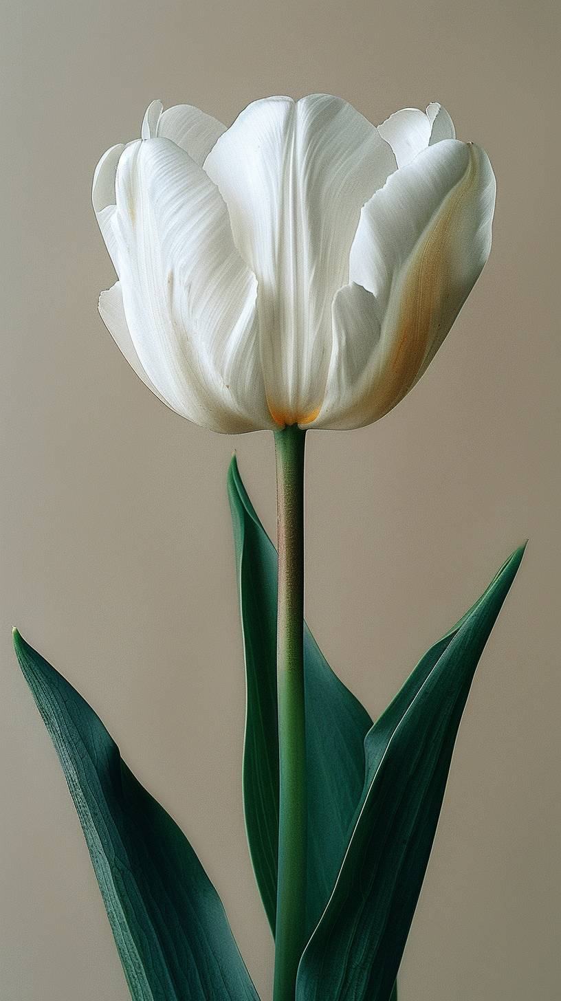 A captivating still life photograph showcasing a single white tulip in full bloom, gracefully curving towards the light. The image should emphasize the smoothness of the petals and the intricate details of the flower's center. Shot with a Fujifilm X-T4 mirrorless camera, using a 35mm lens, aperture f/1.8, against a pristine white backdrop to create a minimalist and elegant composition. --ar 9:16 --style raw --stylize 750 --v 6.0