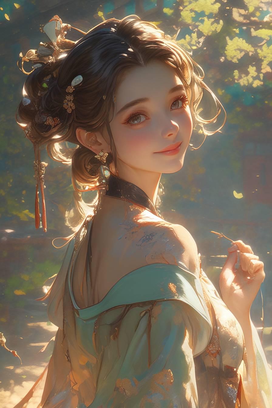 Une fille chinoise élégante portant un magnifique Hanfu, tenant une délicate tasse en céramique contenant une tasse de bon thé, se tient dans un jardin traditionnel chinois. Ses cheveux sont enroulés en un chignon délicat, orné de délicates épingles à cheveux et bijoux. Ses vêtements sont en soie, avec des couleurs vives et des motifs exquis tissés. Elle danse légèrement, entourée d'anciens bâtiments et de briques et tuiles bleues, reflétant cette scène envoûtante.