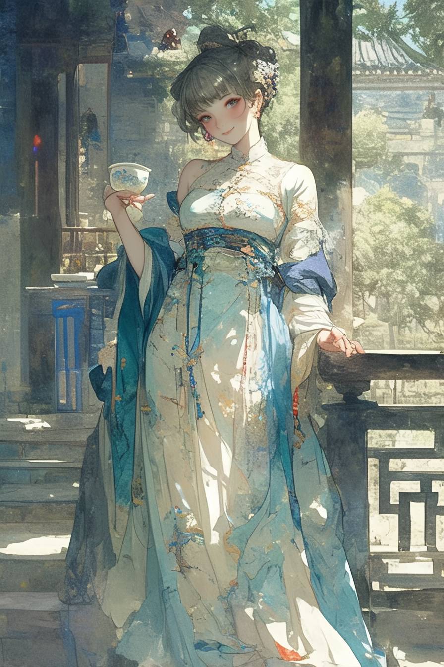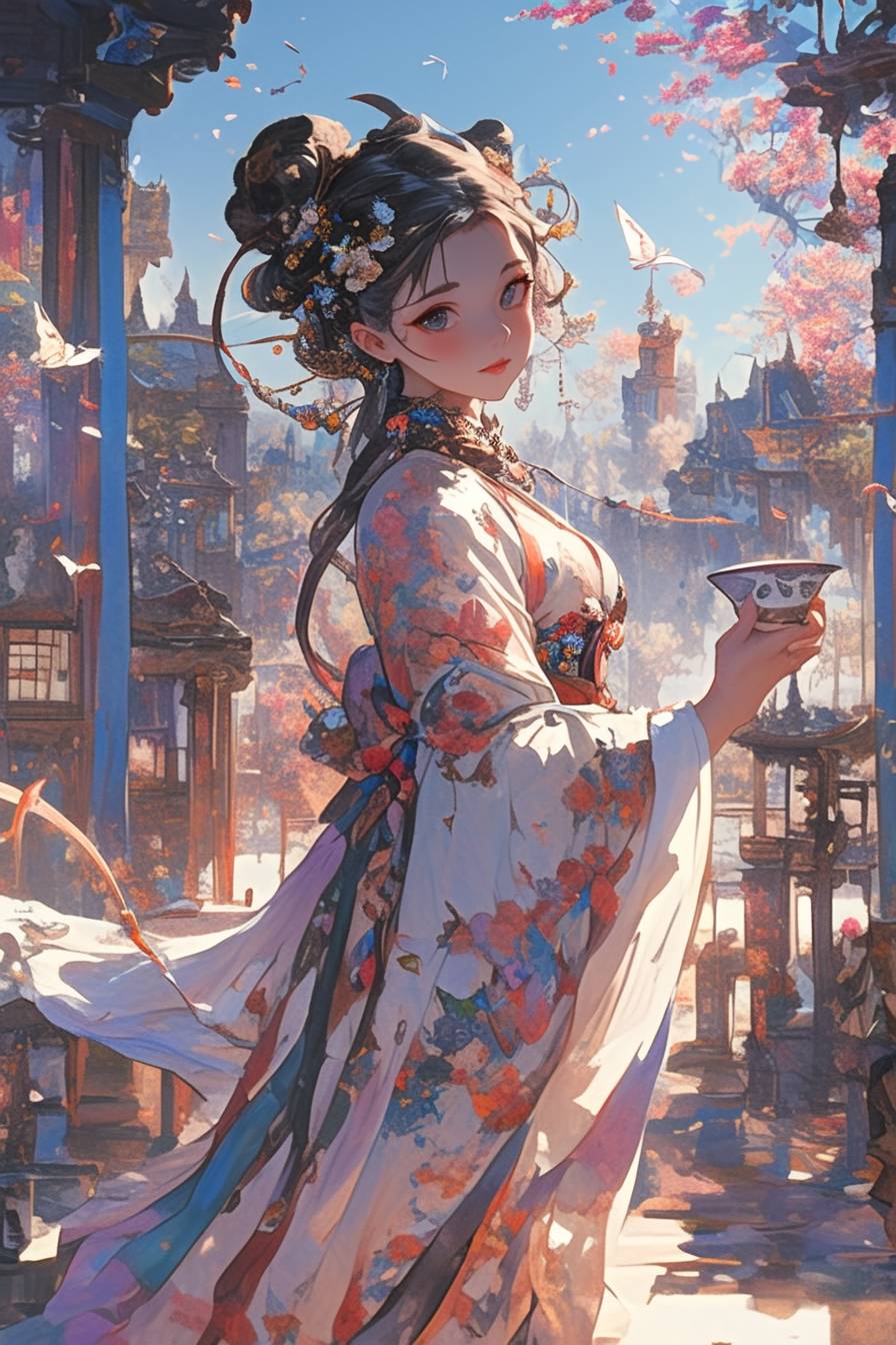 An elegant Chinese girl wearing a gorgeous Hanfu, holding a delicate ceramic tea cup containing a cup of good tea, stands in a traditional Chinese garden. Her hair is coiled in a delicate bun, adorned with delicate hairpins and jewelry. Her clothes are made of silk, with bright colors and exquisite patterns and patterns woven. She danced lightly, surrounded by ancient buildings and blue bricks and tiles, reflecting this intoxicating scene. --niji 6 --ar 2:3 --s 240