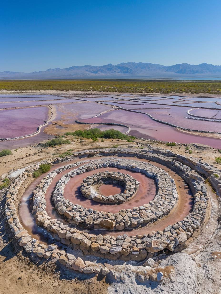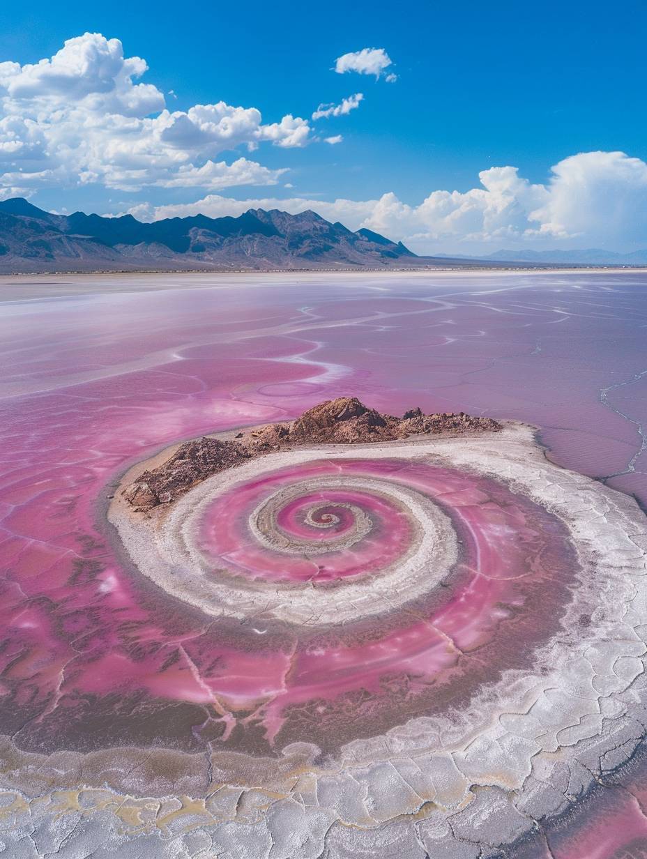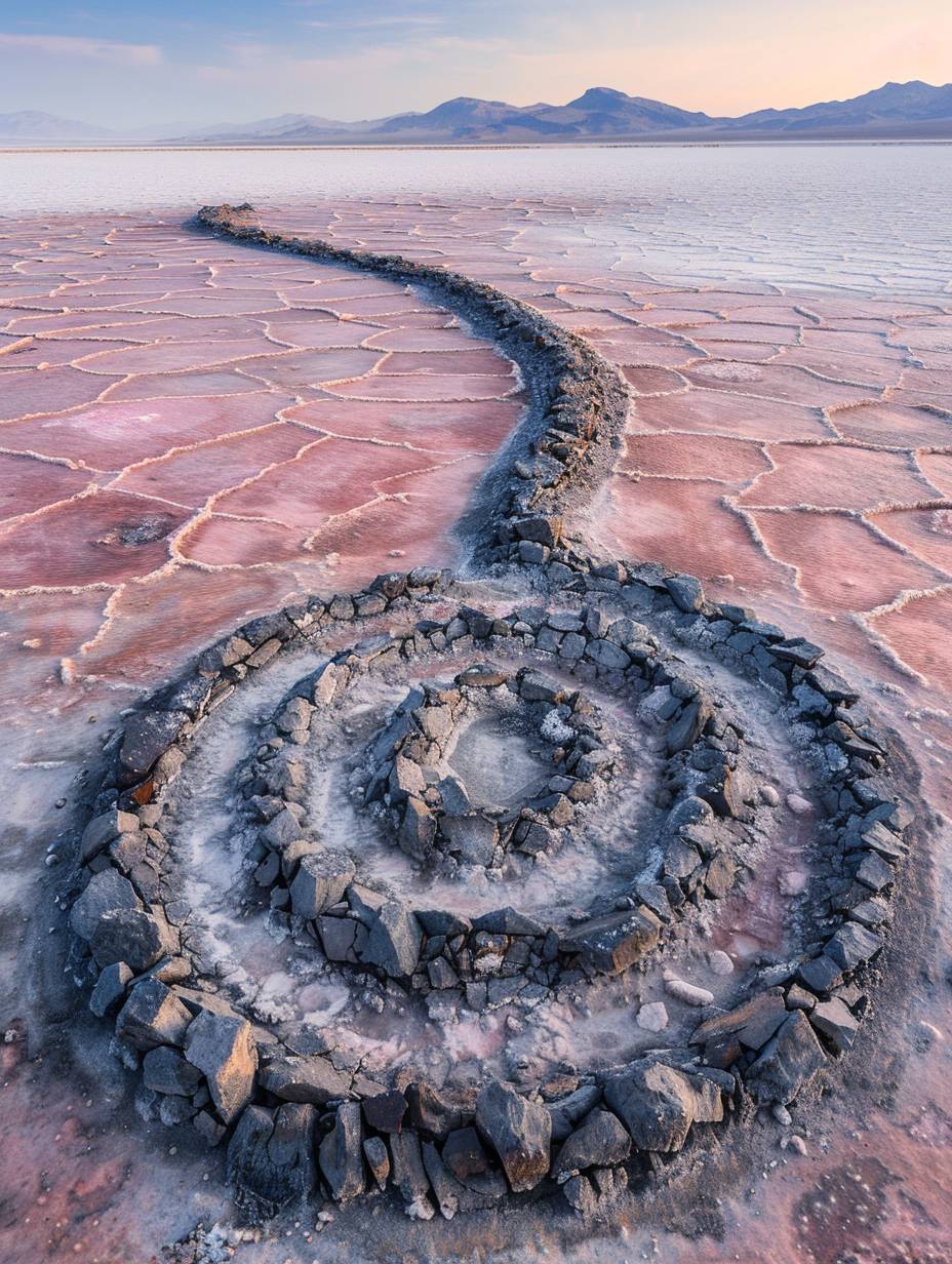 gigantic spiral pattern made of rocks on the shore, aerial view, in salt lake desert with pink water and mountains far away, --ar 3:4 --v 6.0