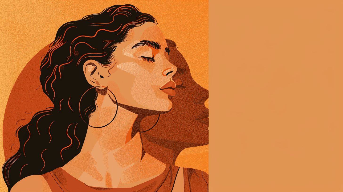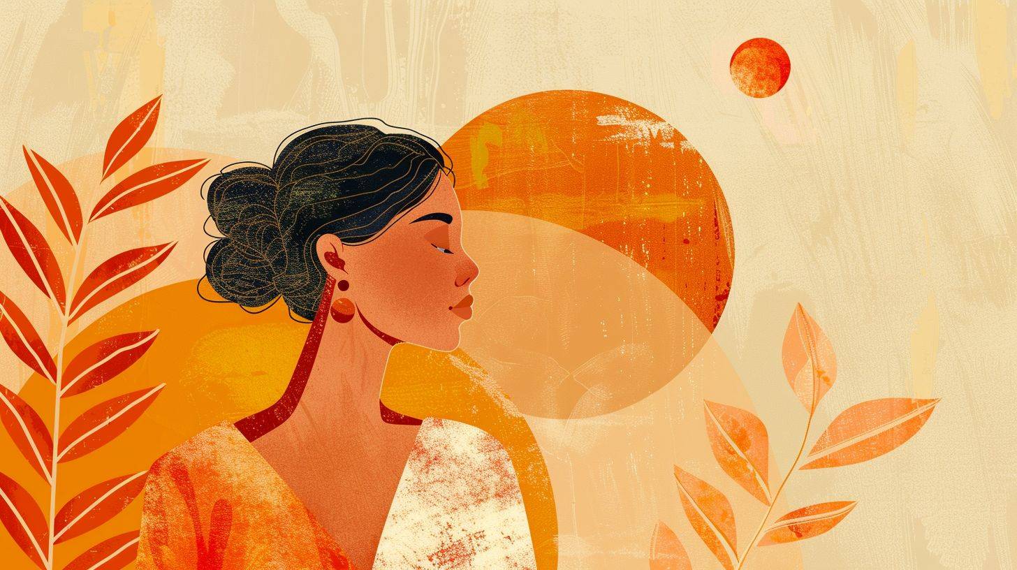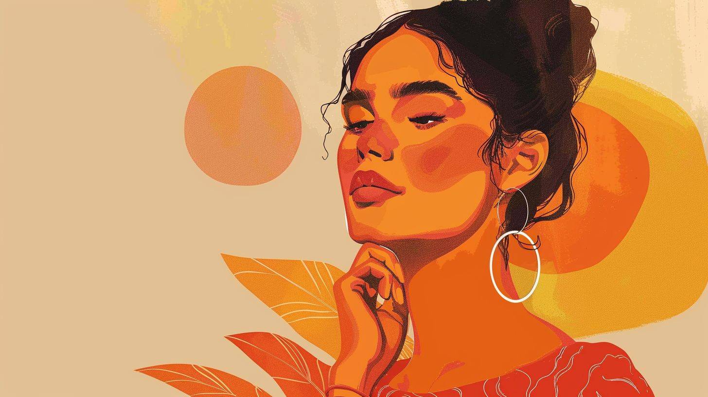 Dépeignez une jeune femme belle et séduisante avec des couleurs chaudes et des designs bohèmes, en utilisant des formes simples mais abstraites qui soulignent des lignes épurées et des compositions minimalistes.