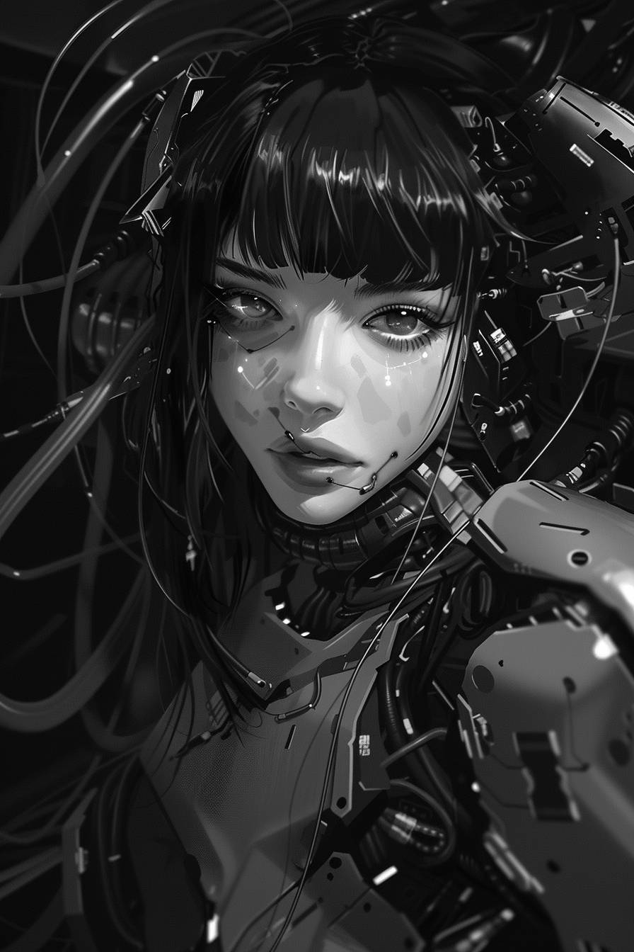 black and white illustration of an anime girl in a mech suit, in the cyberpunk style, with dark hair and bangs, looking at the camera, wires everywhere, black background, full body portrait, detailed face, concept art, artstation --ar 2:3 --v 6.0