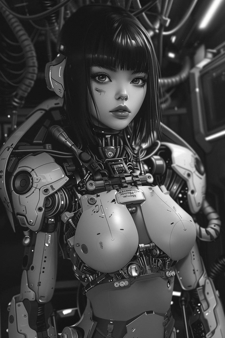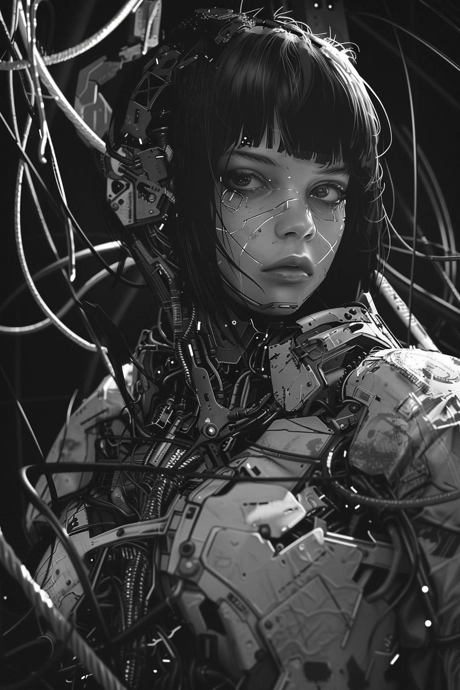 Une illustration en noir et blanc d'une fille anime dans un costume de méca, dans le style cyberpunk, avec des cheveux noirs et une frange, regardant la caméra, des fils partout, fond noir, portrait en pied, visage détaillé, art conceptuel, artstation.