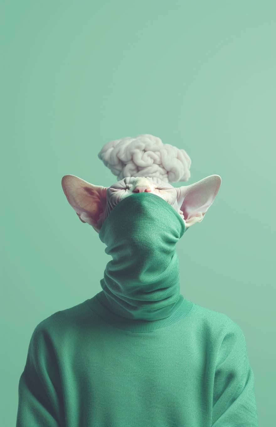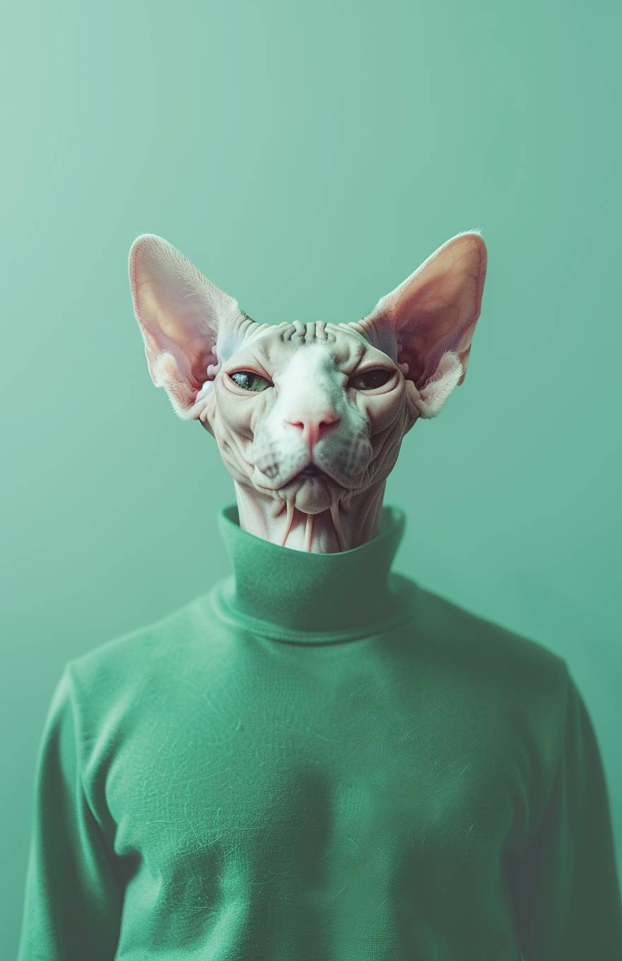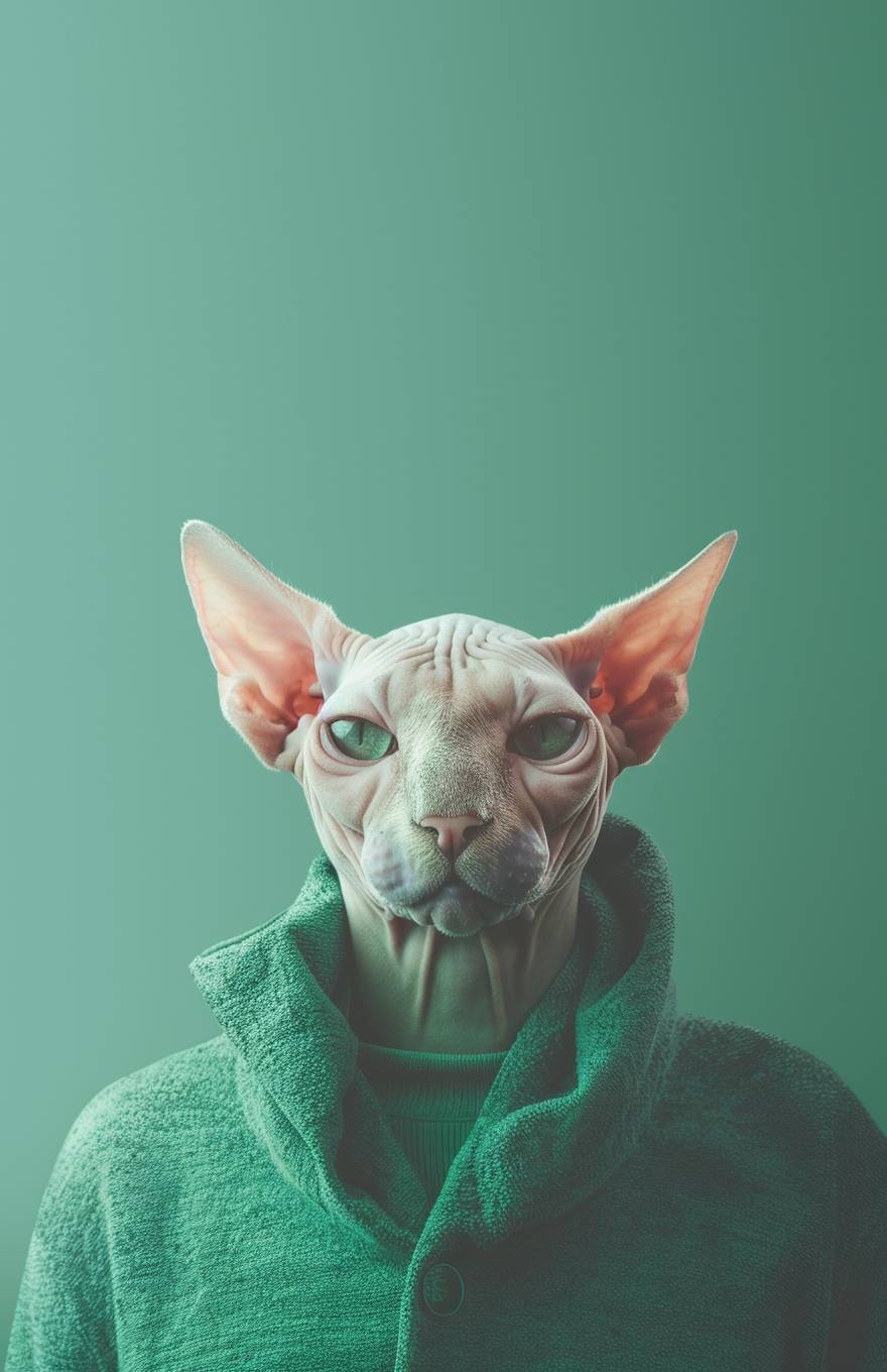 Photographie de portrait d'un chat Sphynx avec un corps et un visage humains