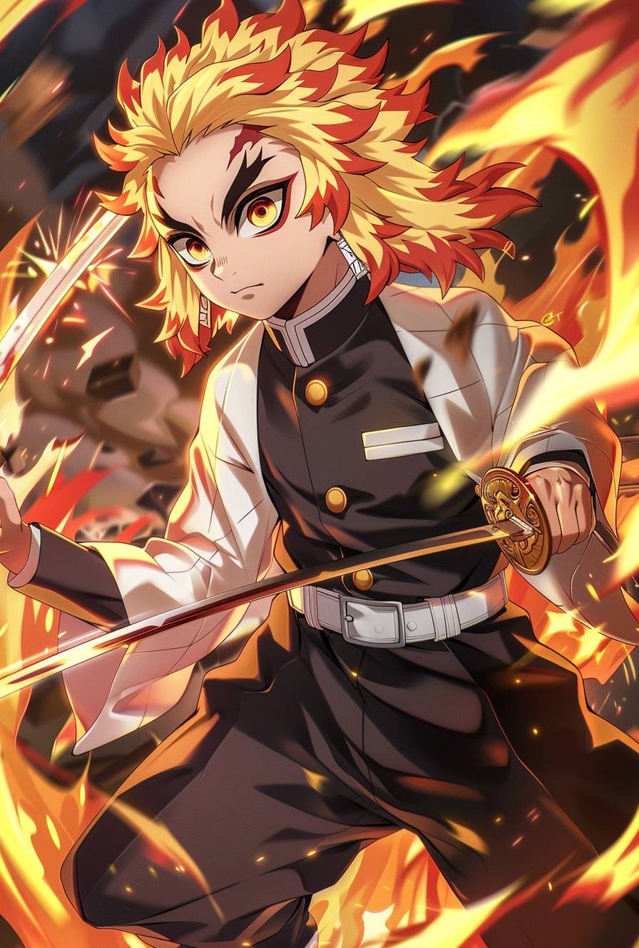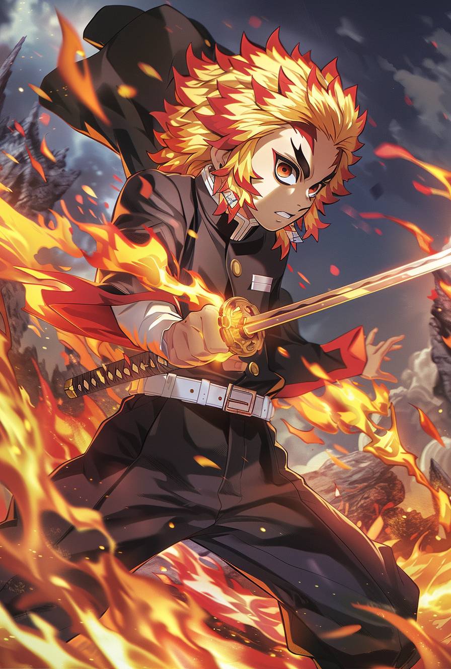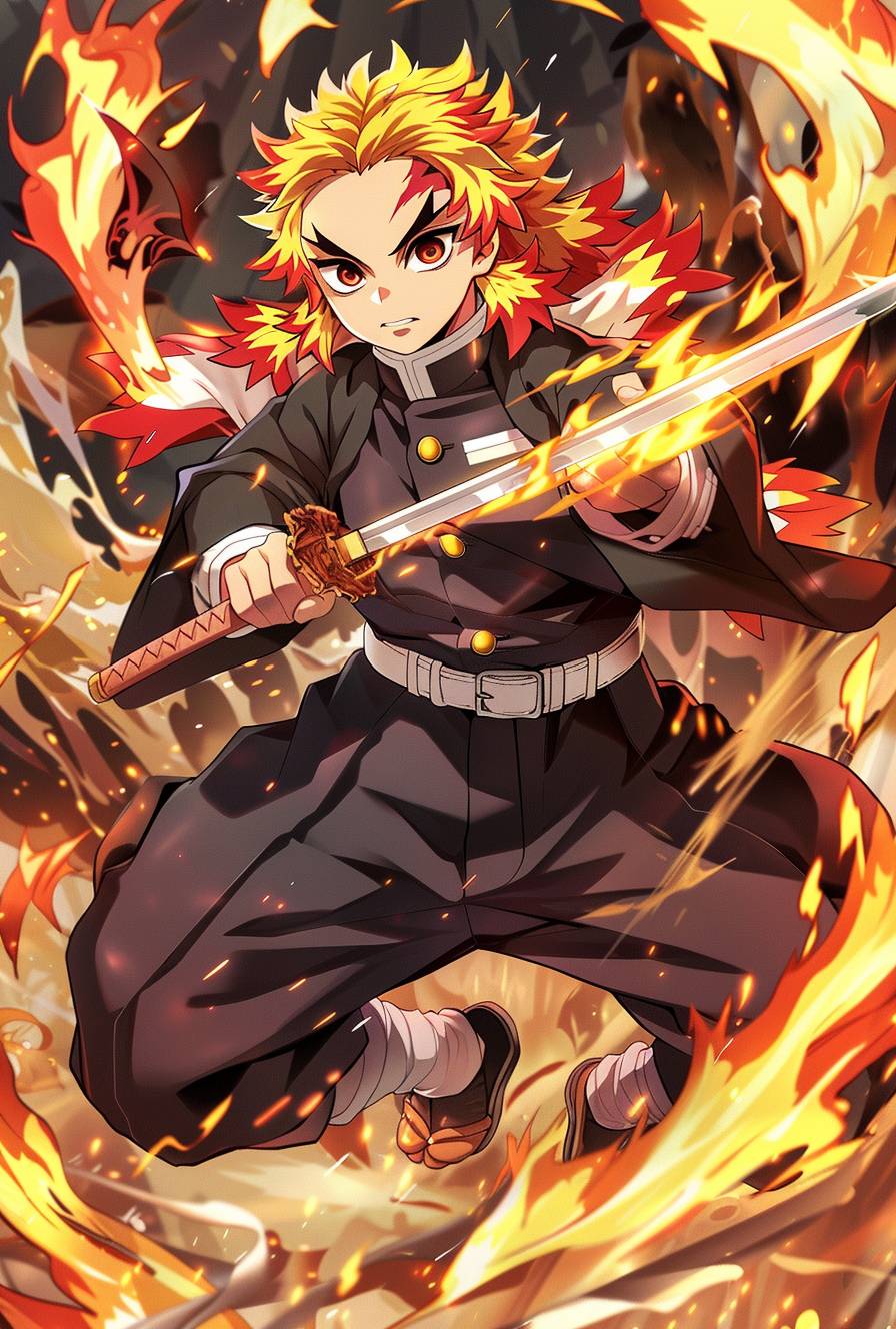 In the style of Japanese anime, Kimetsu no Yaiba, Demon Slayer manga, an extremely handsome boy with yellow hair and orange eyes is using his flame sign technique to create flames around him, holding a sword in hand, wearing a black uniform, white shirt and red pants in a full body shot at high resolution. --ar 43:64 --v 6.0
