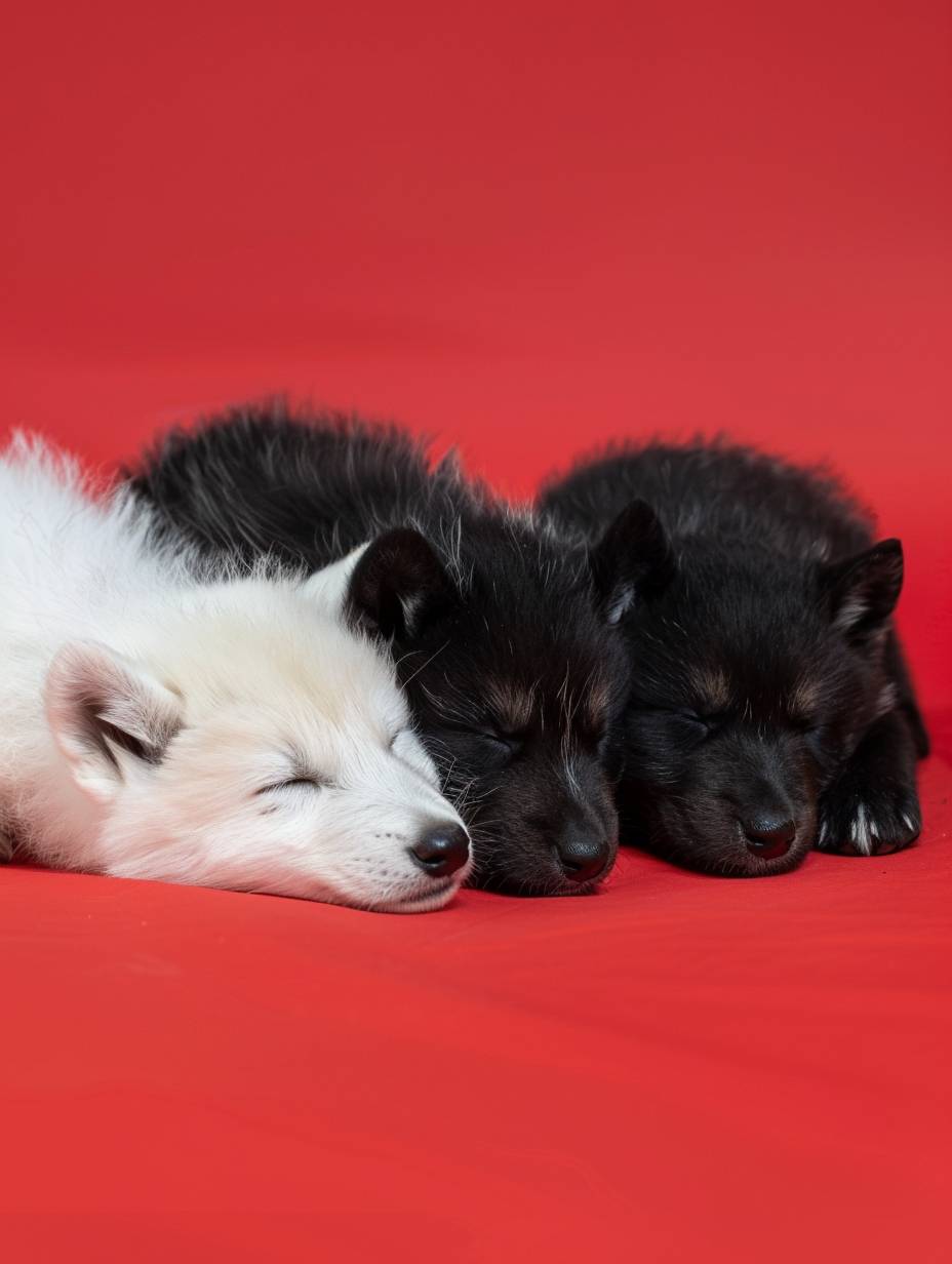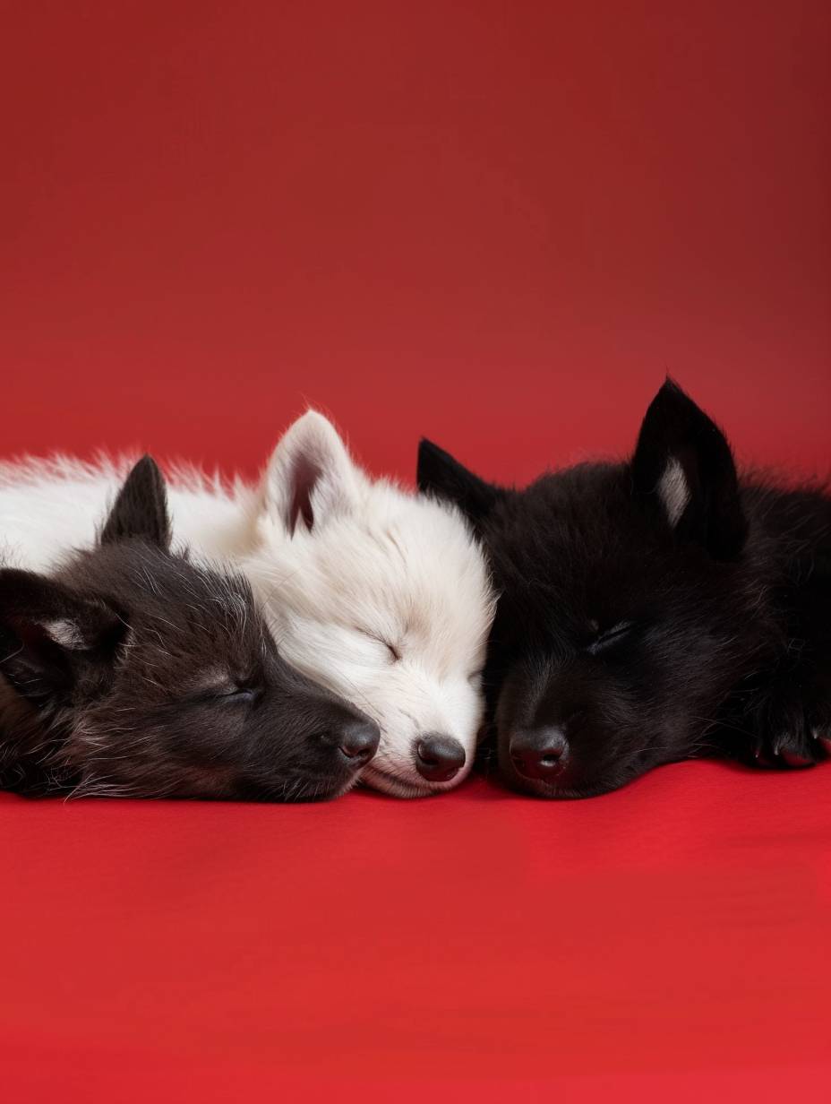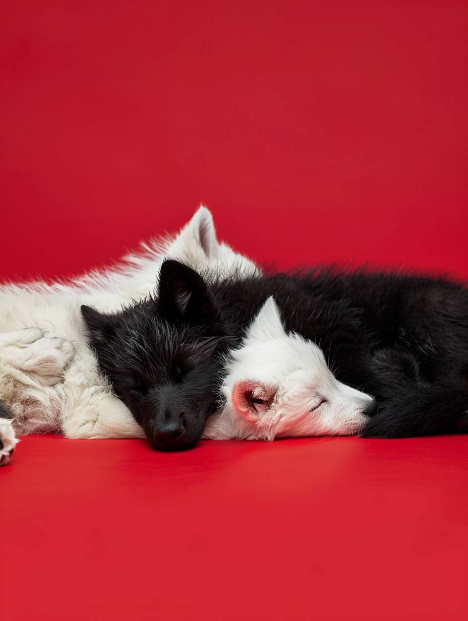 cute Little black wolf and white cubs sleeping on a solid red background in the hyper-realistic, cute style of animal photography with studio lighting and high resolution photography. The photo has professional color grading with no contrast and clean, sharp focus on the subject with a shallow depth of field. It has a smooth tone with soft shadows and no fine lines or texture details HD --ar 3:4 --style raw --v 6.0
