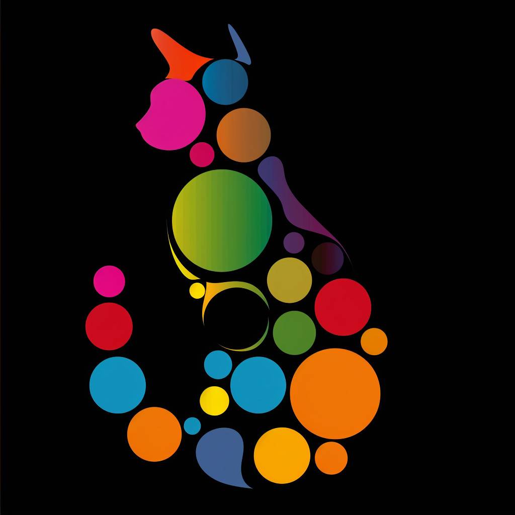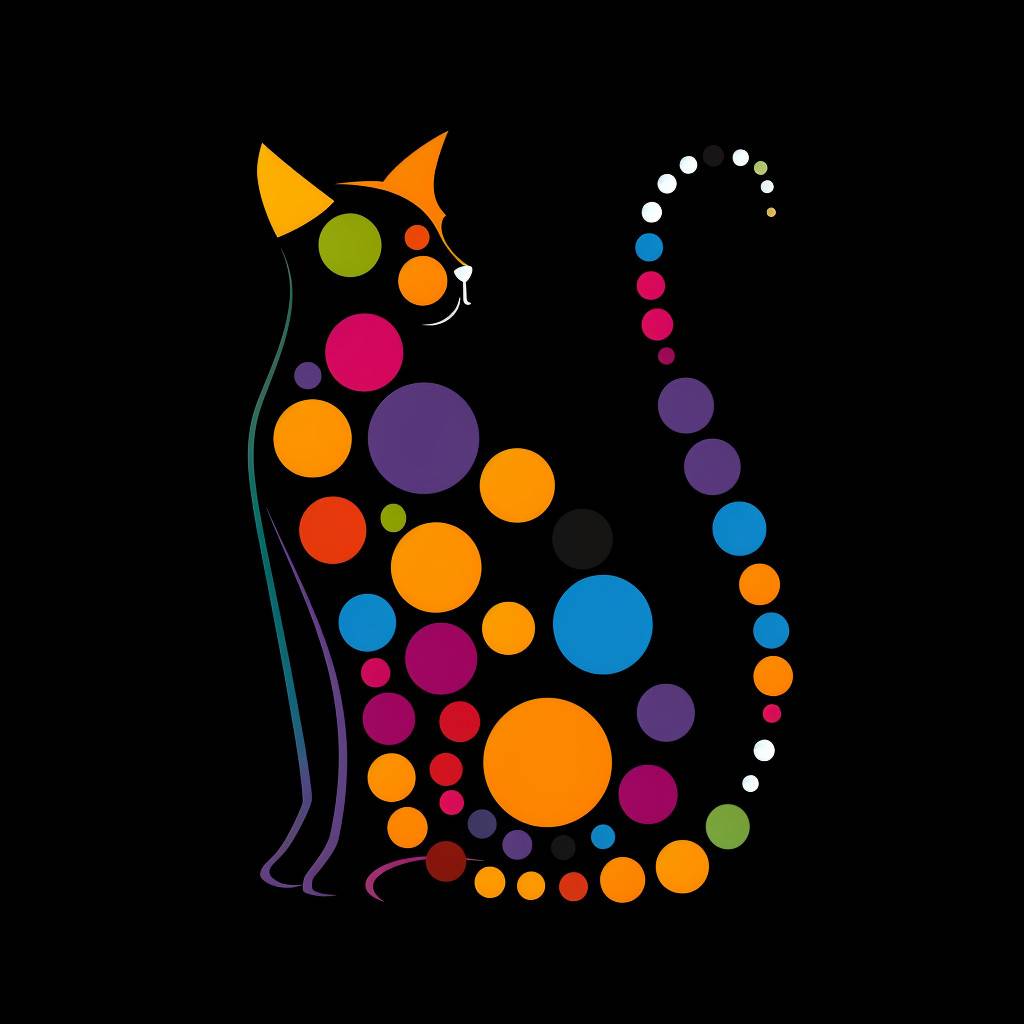 Un logo sophistiqué de chat composé de grands points colorés de taille égale sur une toile noire, présentant une palette de couleurs audacieuses et harmonieuses qui allient créativité et design professionnel.