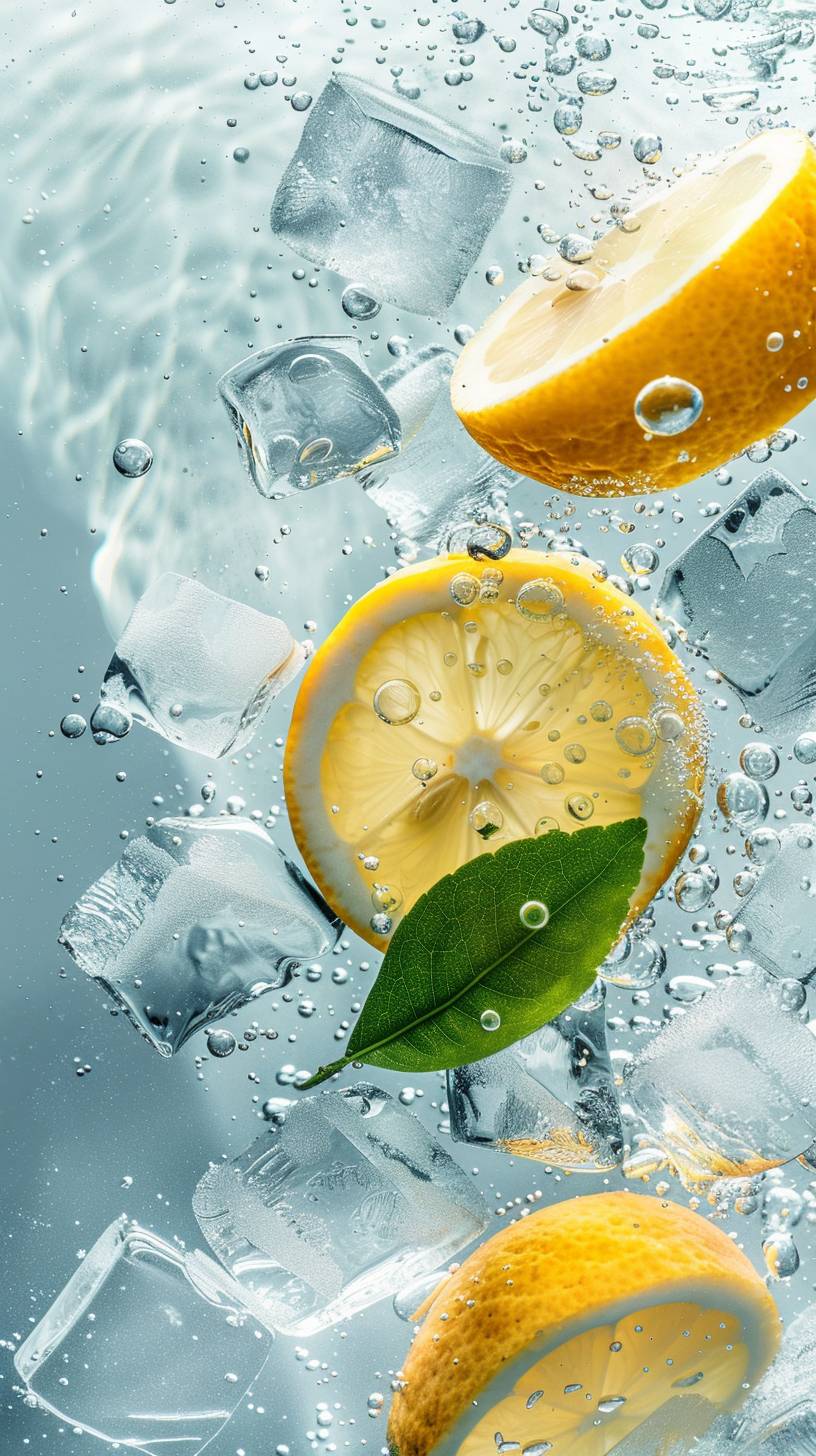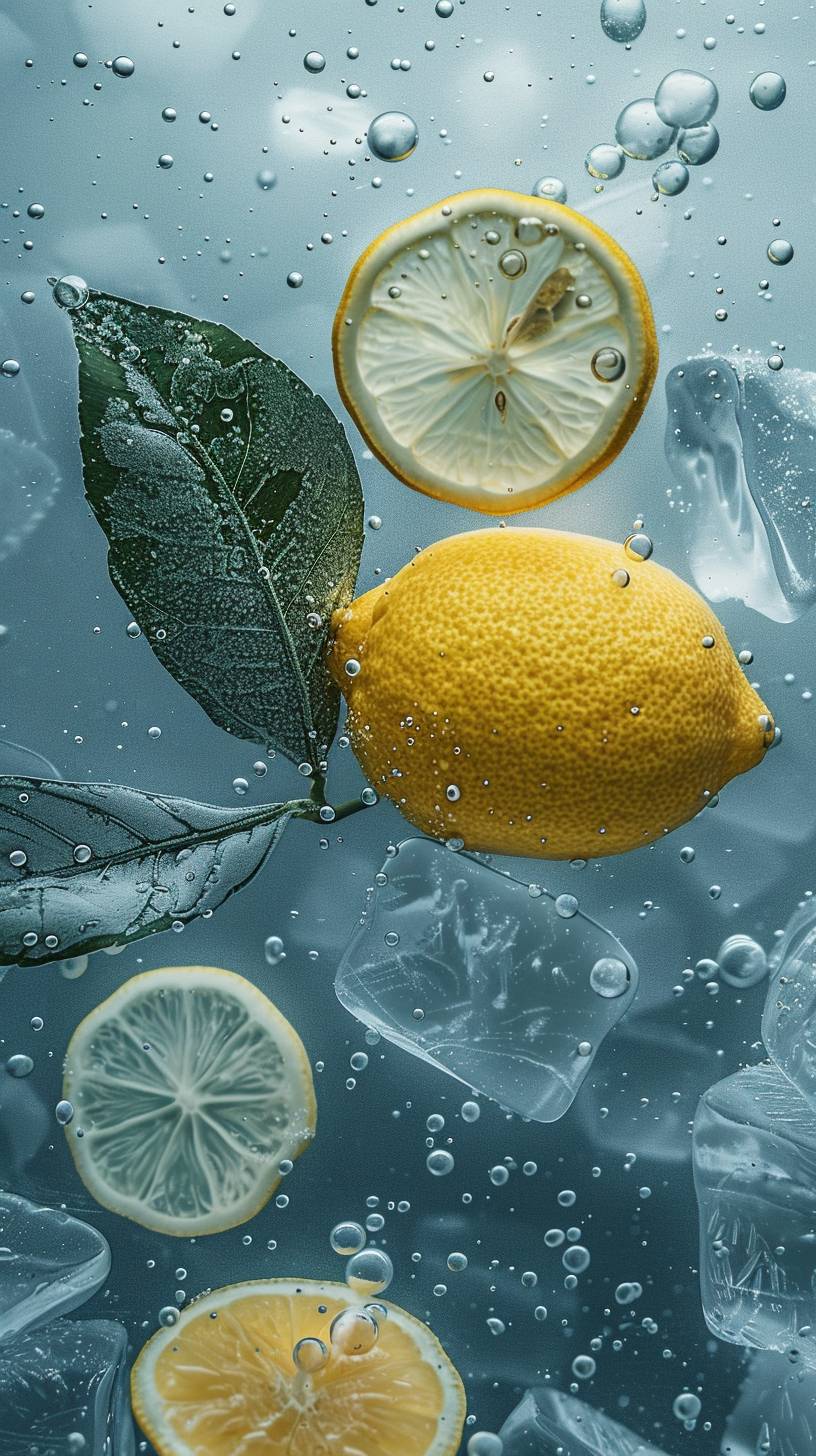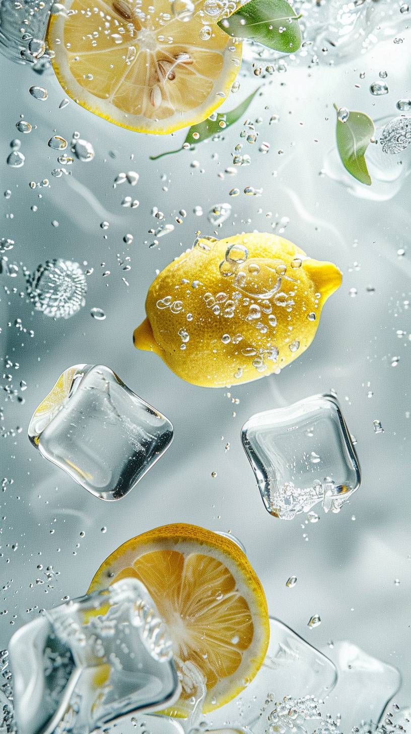 yellow lemon and cut lemon and its leaf underwater,color bubble,Cool sparkling water,bubble,clear ice,many Ice blocks,crystal clear,white background,bright tone,Clear,HD photos,beautiful,high details,best quality,32k --ar 9:16 --v 6.0