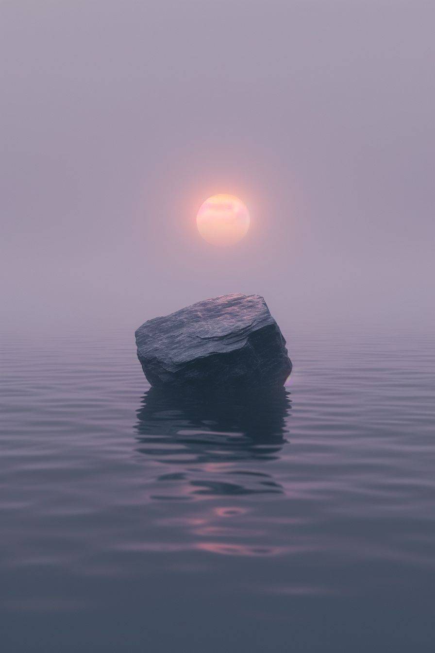 minimalist rock floating in air, aura, water waves, centered, 3d, calm, norwegian nature, minimalist night, fog, warm yellow orange moon light in fog, dark purple, dark grey, black, misty atmosphere --s 200 --ar 2:3 --c 5 --v 6