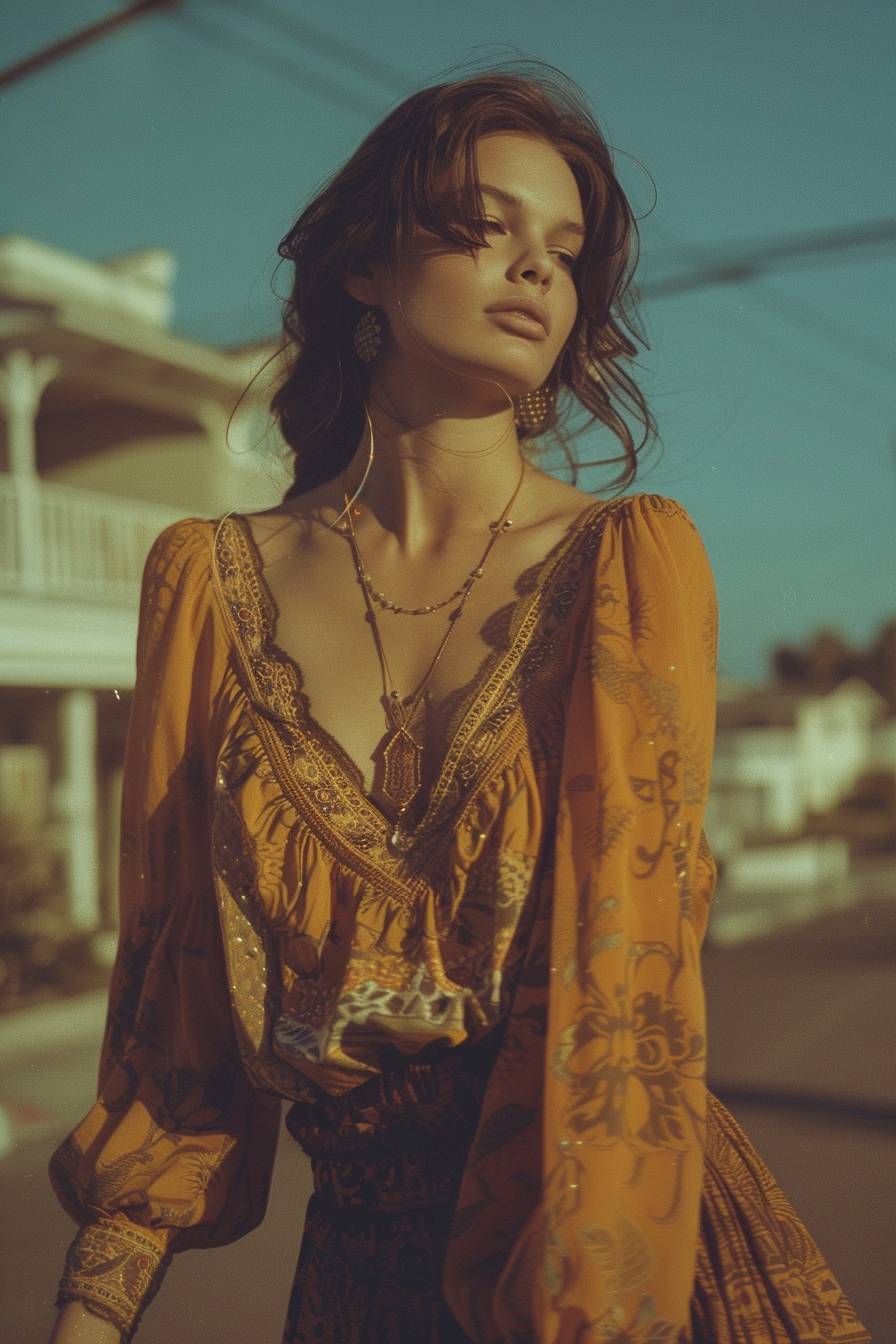 Une photographie représentant une actrice américaine des années 70, portant une jupe maxi bohème et un haut paysan, dans une ville côtière, sous un ciel clair avec une douce brise marine, gros plan, palette terreuse de marron et jaune, esthétique des années 70, atmosphère nostalgique, prise avec un appareil photo vintage 35 mm, photo réelle, très détaillée.