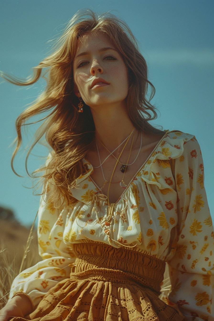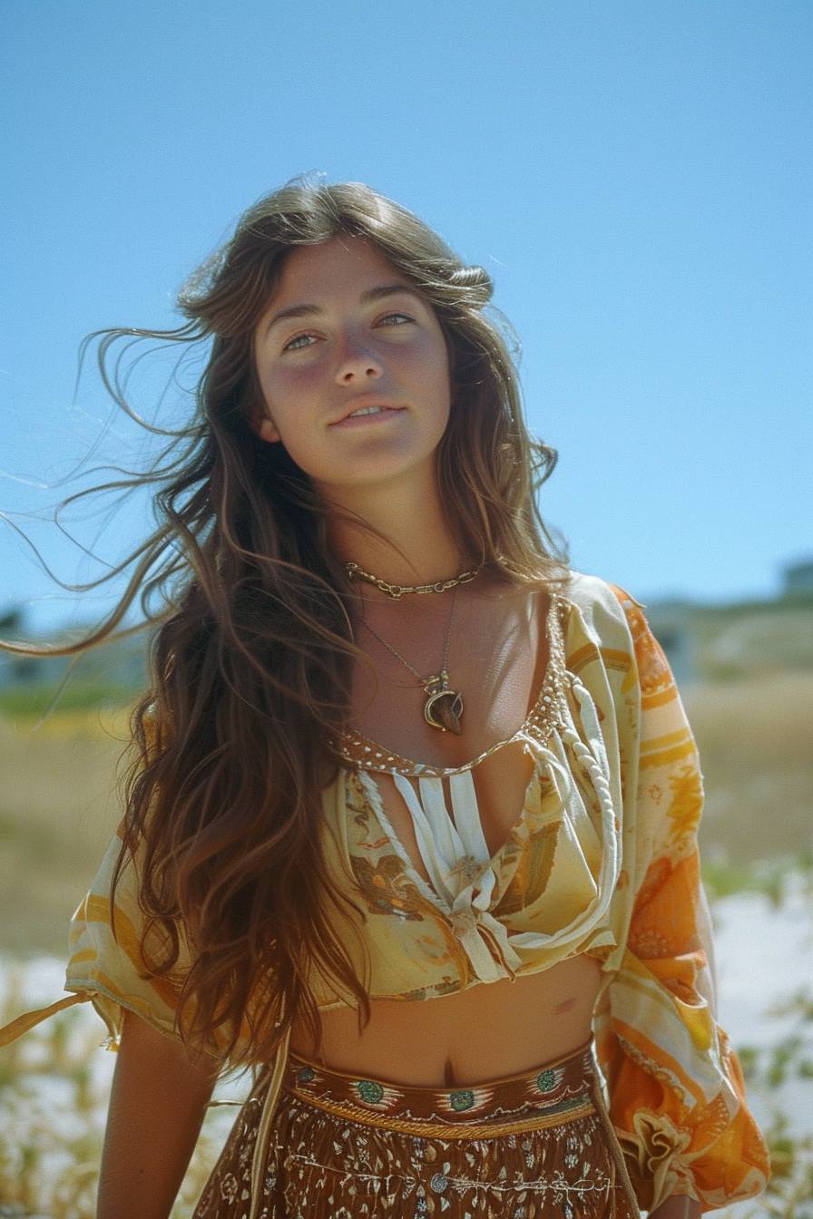 A photograph depicting a 1970s American actress, wearing a bohemian maxi skirt and peasant blouse, in a coastal town, under clear skies with soft sea breeze, close-up , earthy brown and yellow palette, 1970s aesthetic, nostalgic atmosphere, 35mm vintage camera, real photo, highly-detailed --ar 2:3 --v 6.0