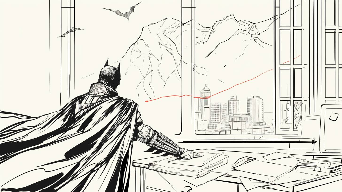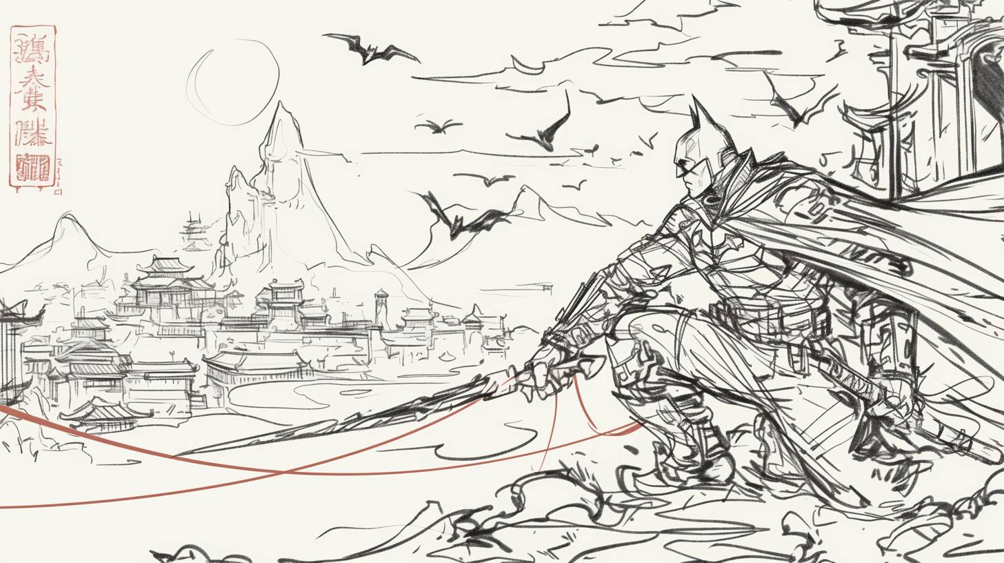 batman, in the style of bold and graphic compositions, mosaic-like collages, pop culture mashup, multiple screens, light red and light bronze, magali villeneuve, macro zoom, outlandish energy, contemporary frescoes, chaotic academia, digital as manual --ar 16:9 --style raw --sref 2272182040 --niji 6