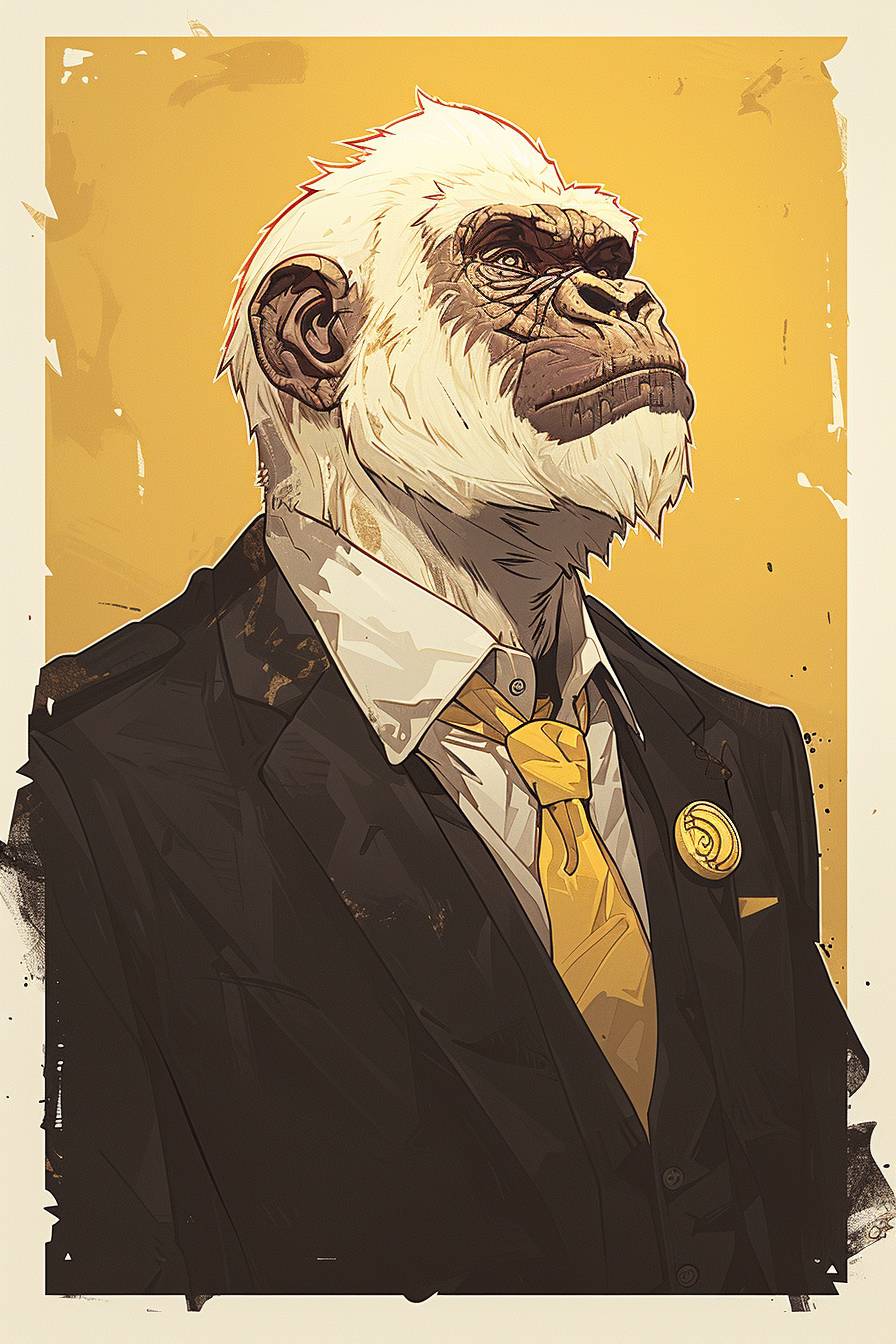 Une caricature d'un gorille albinos habillé en costume noir et cravate jaune