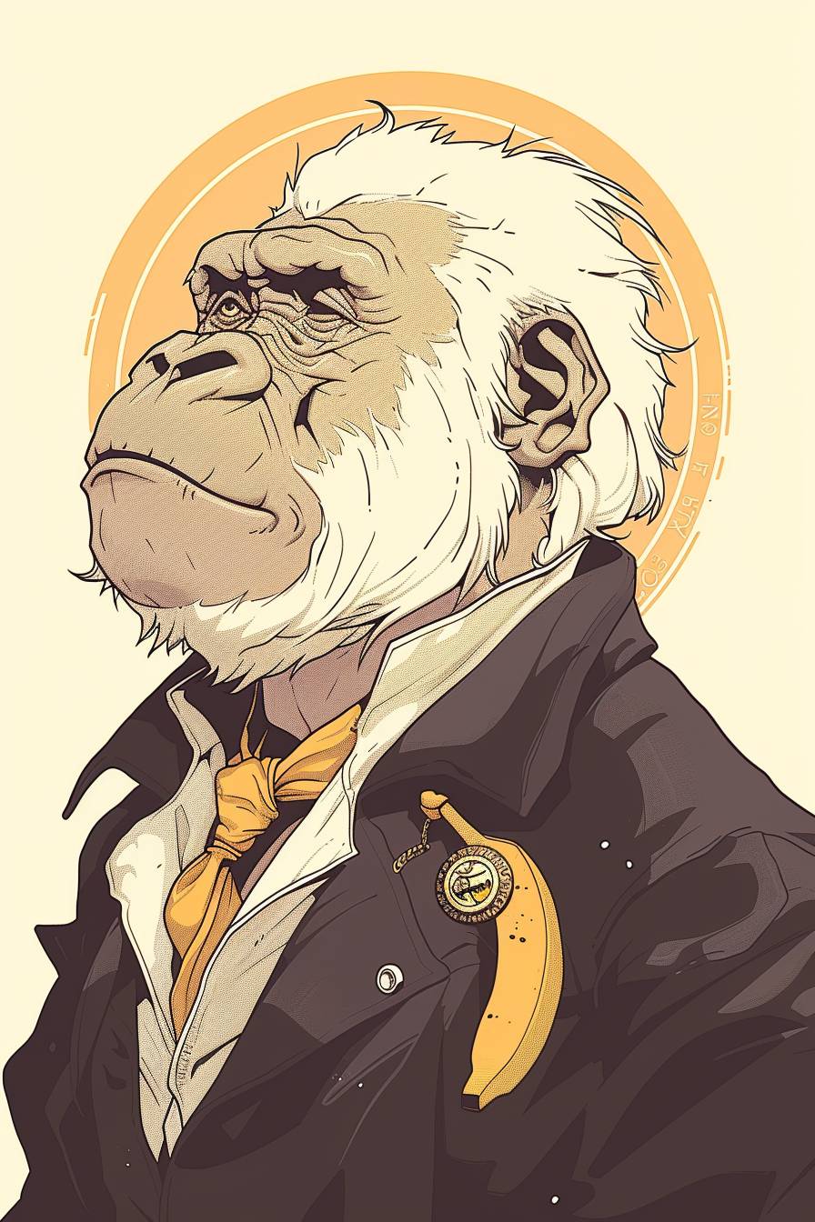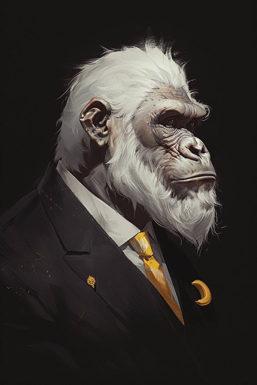 a Albino gorilla dressed in a black suit and yellow tie with a banana pin on his lapel, cartoonish caricature logo, --ar 2:3 --personalize qzxsw3a --stylize 400 --v 6.0