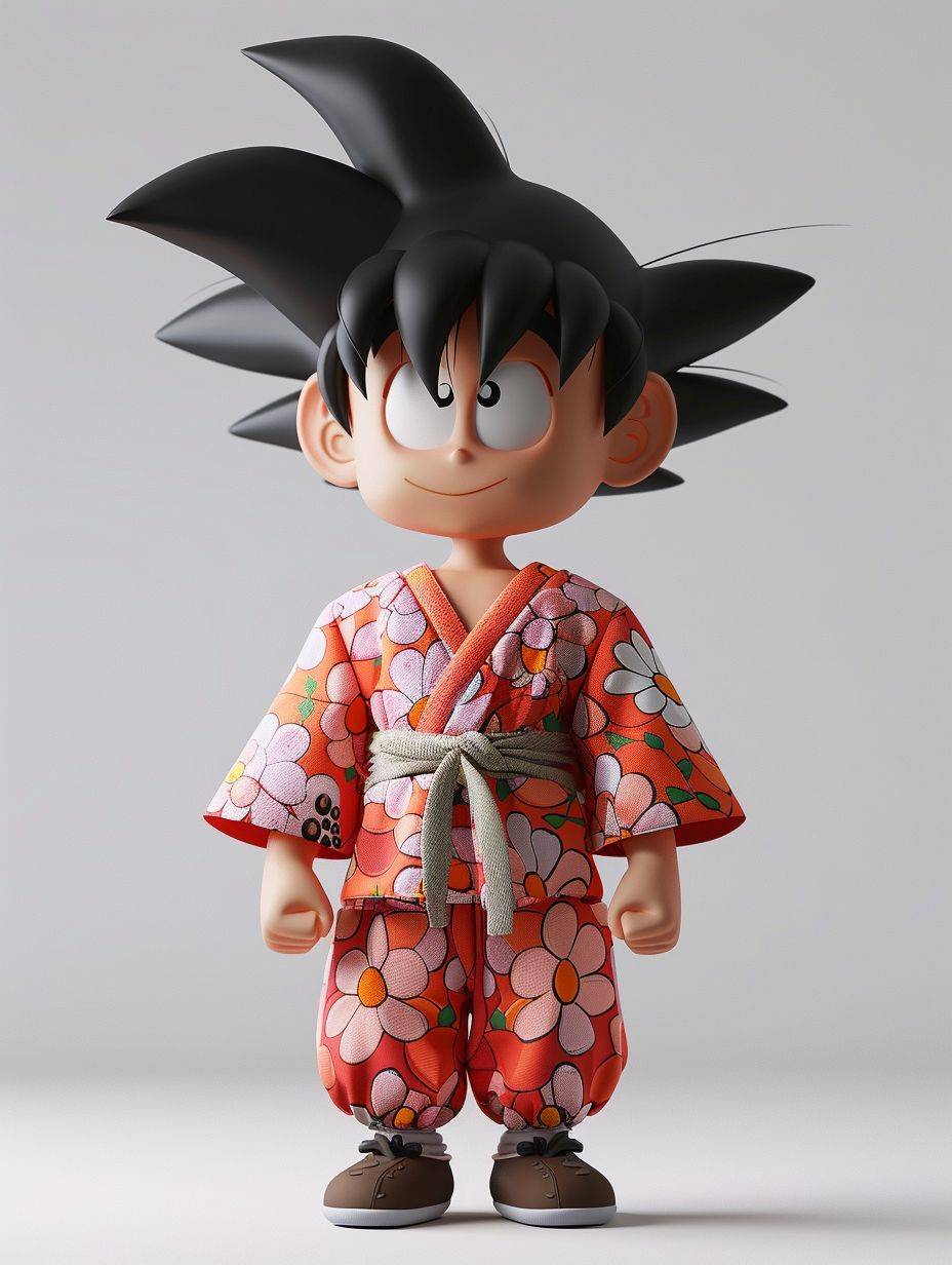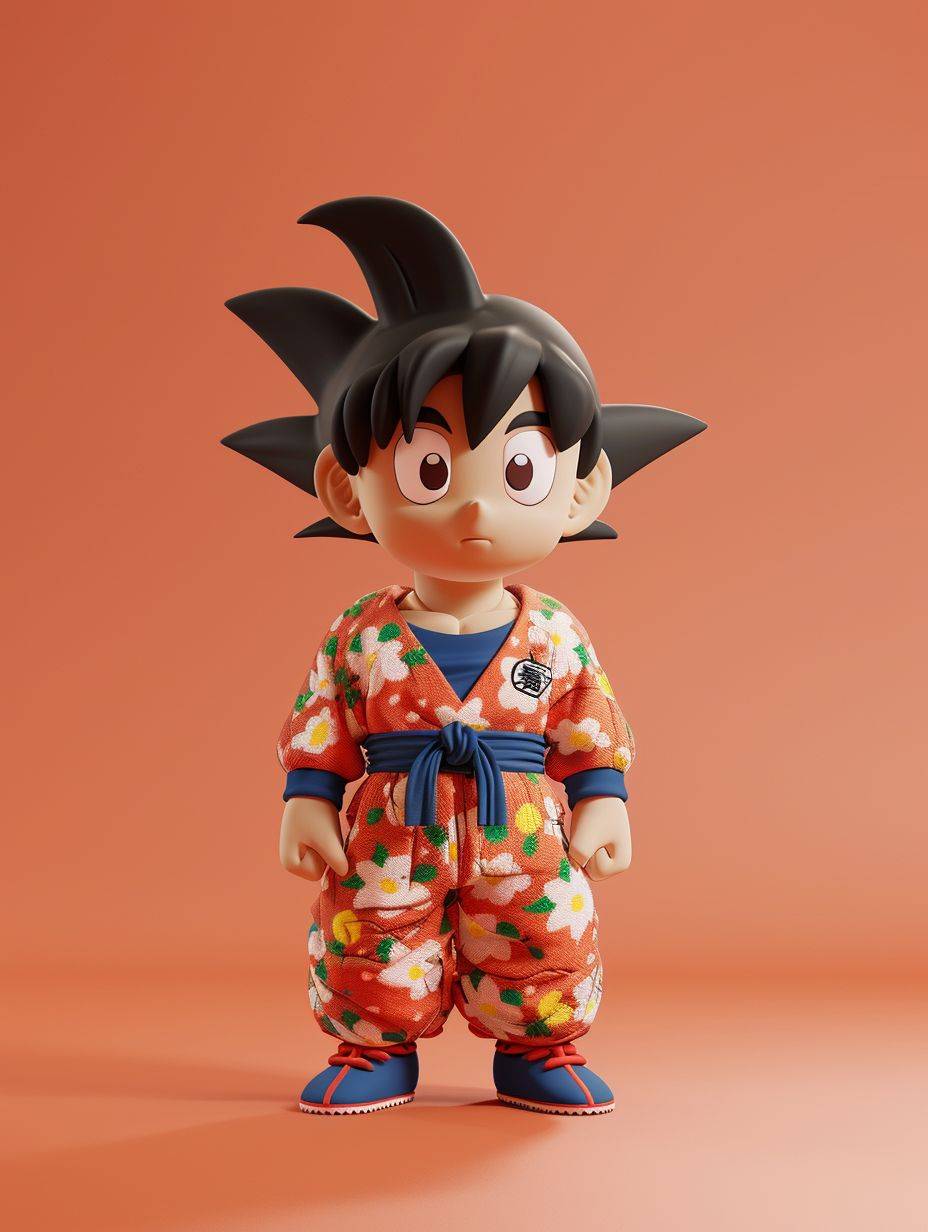 Son Goku in Dragon Ball, full body, ip by popmart blindbox style, Wearing A flower jacket, Clear eyes, chibi, minimalist color field, minimalist clean background, C4D, blender, 8k resolution, symmetrical grid, plaster, realistic details --style raw --ar 3:4