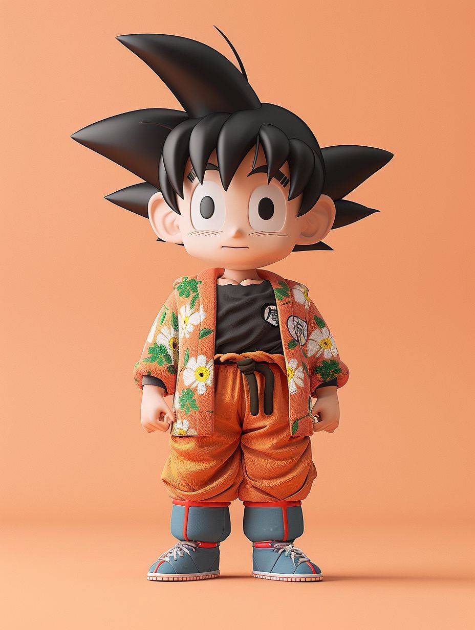 Image en corps entier de Son Goku dans une veste à fleurs, yeux clairs, style chibi, fond minimaliste, détails réalistes.