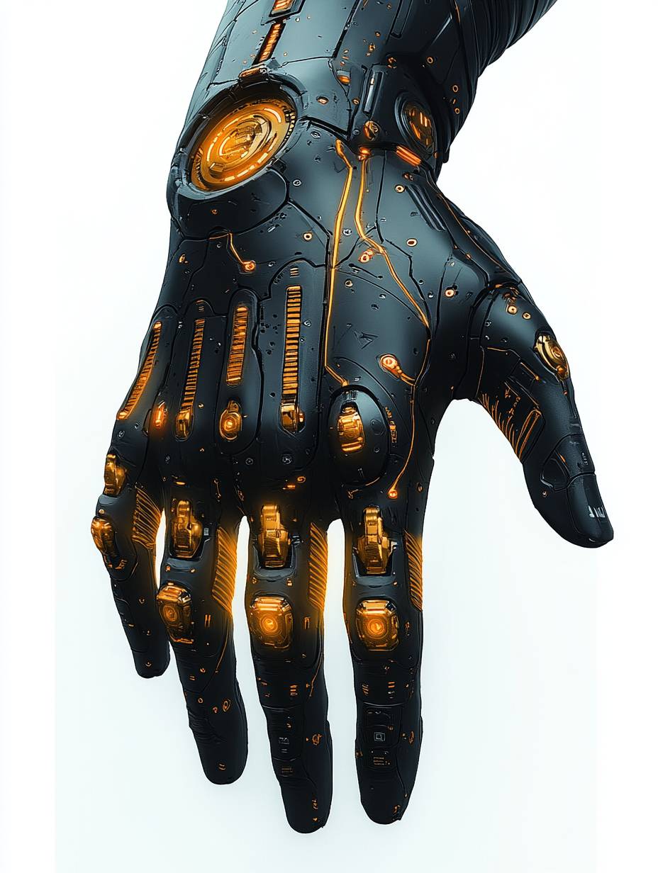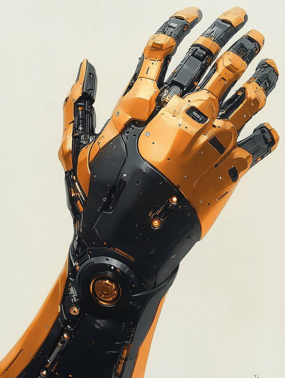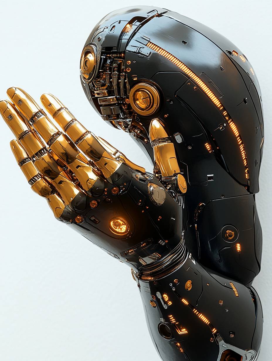 Un bras mécatronique élégant, noir et doré, avec des matériaux avancés et des éléments de design futuriste. Le rembourrage d'épaule proéminent est sur le côté gauche de son corps supérieur, tandis qu'il tend la paume ouverte pour des poses d'action dynamiques. Il présente plusieurs pièces mécaniques visibles sous la peau, ajoutant à son apparence high-tech. Cette œuvre d'art conceptuelle détaillée capture chaque détail dans un style de rendu numérique ultra-réaliste sur fond blanc.