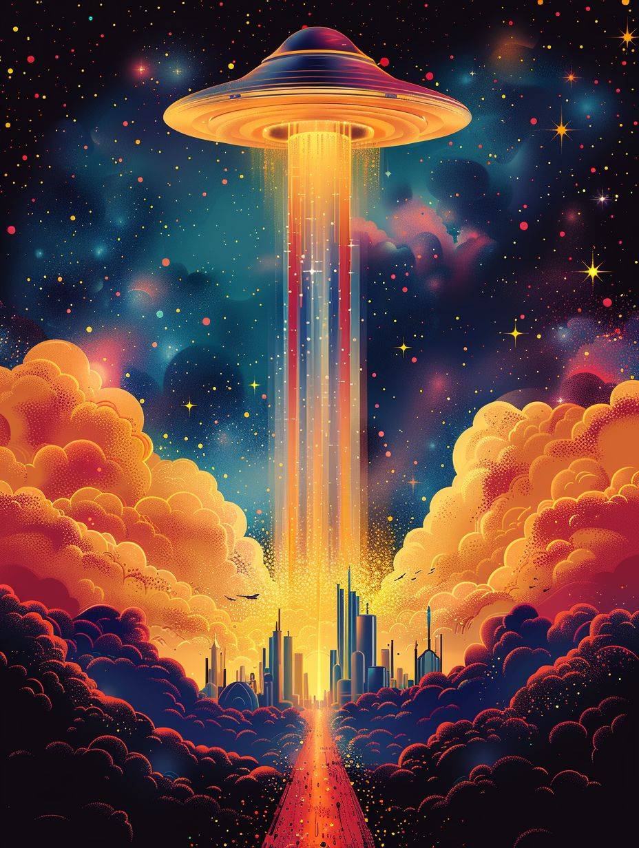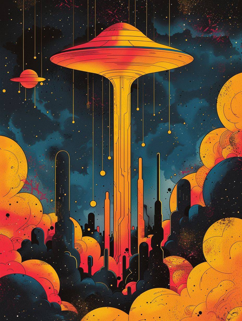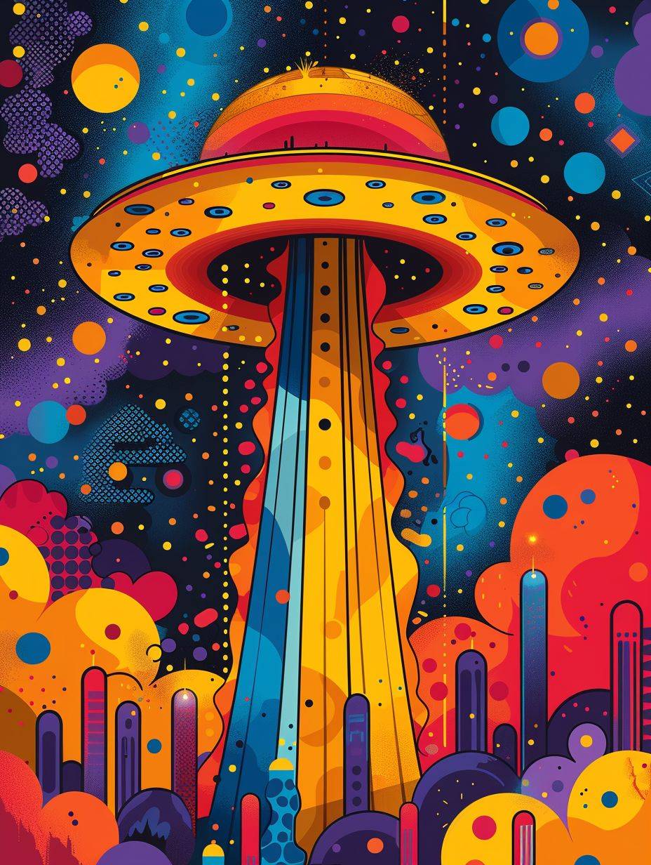 Ceci est une illustration graphique sur les OVNIs et les vaisseaux spatiaux, avec des couleurs vives et un style minimaliste.