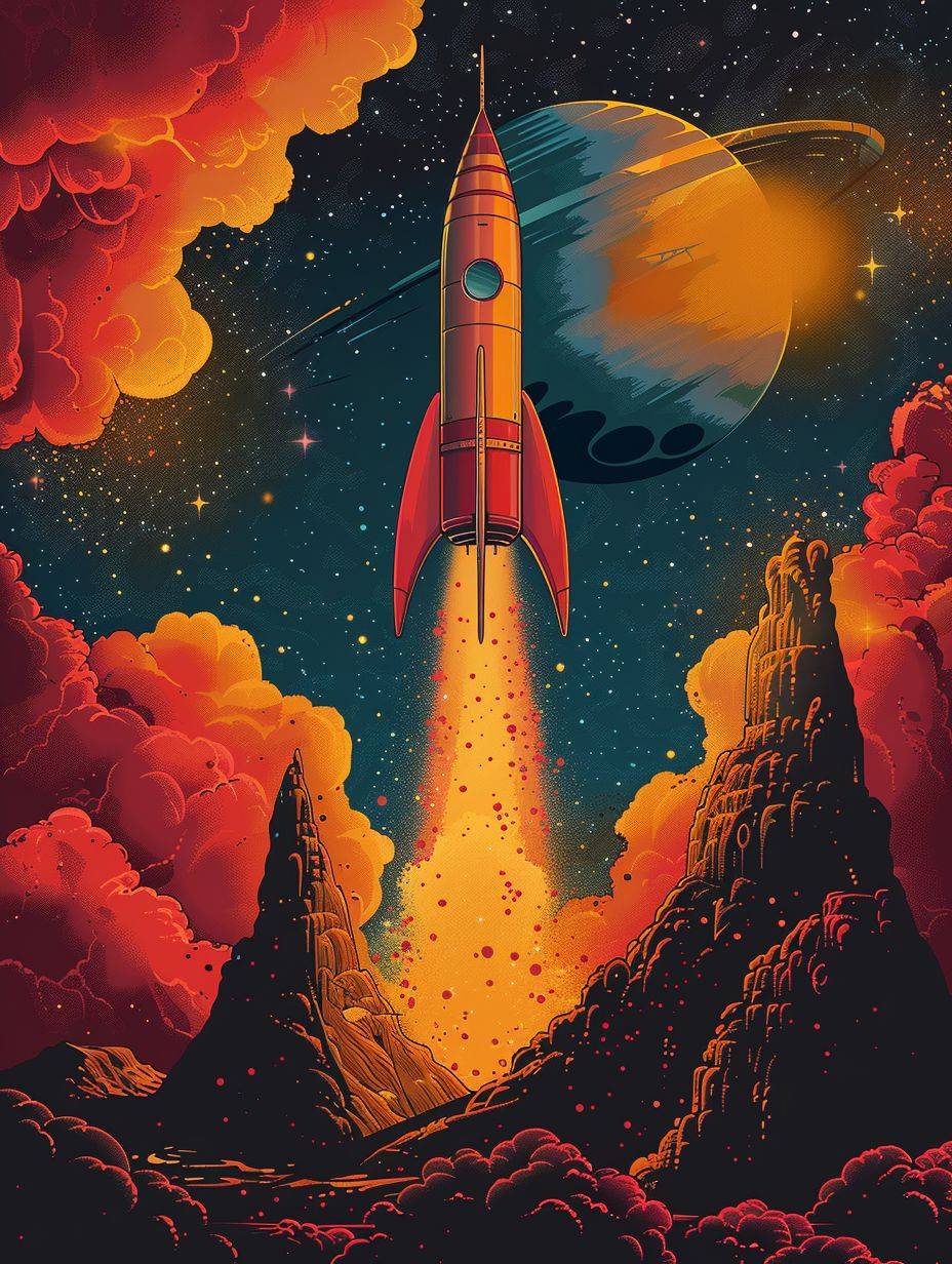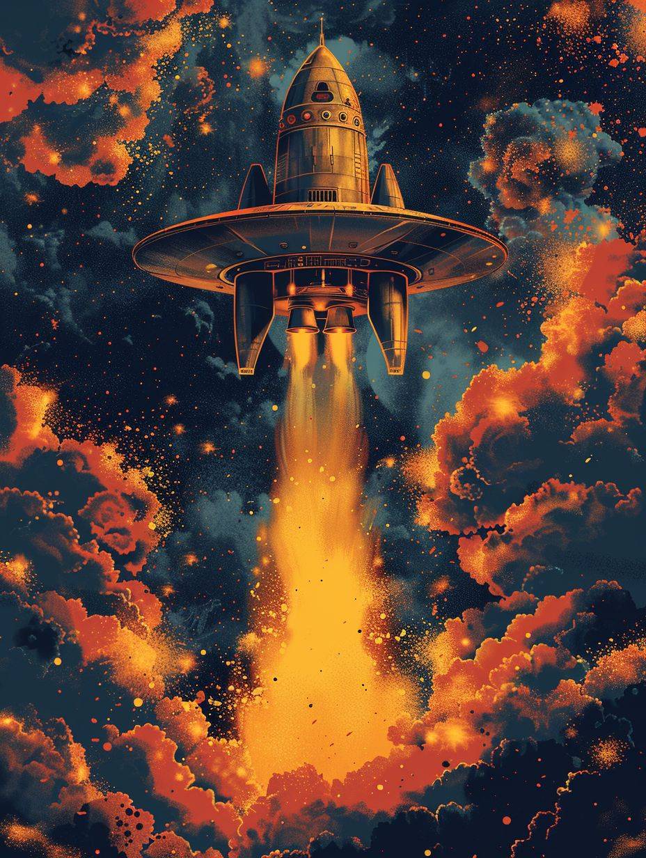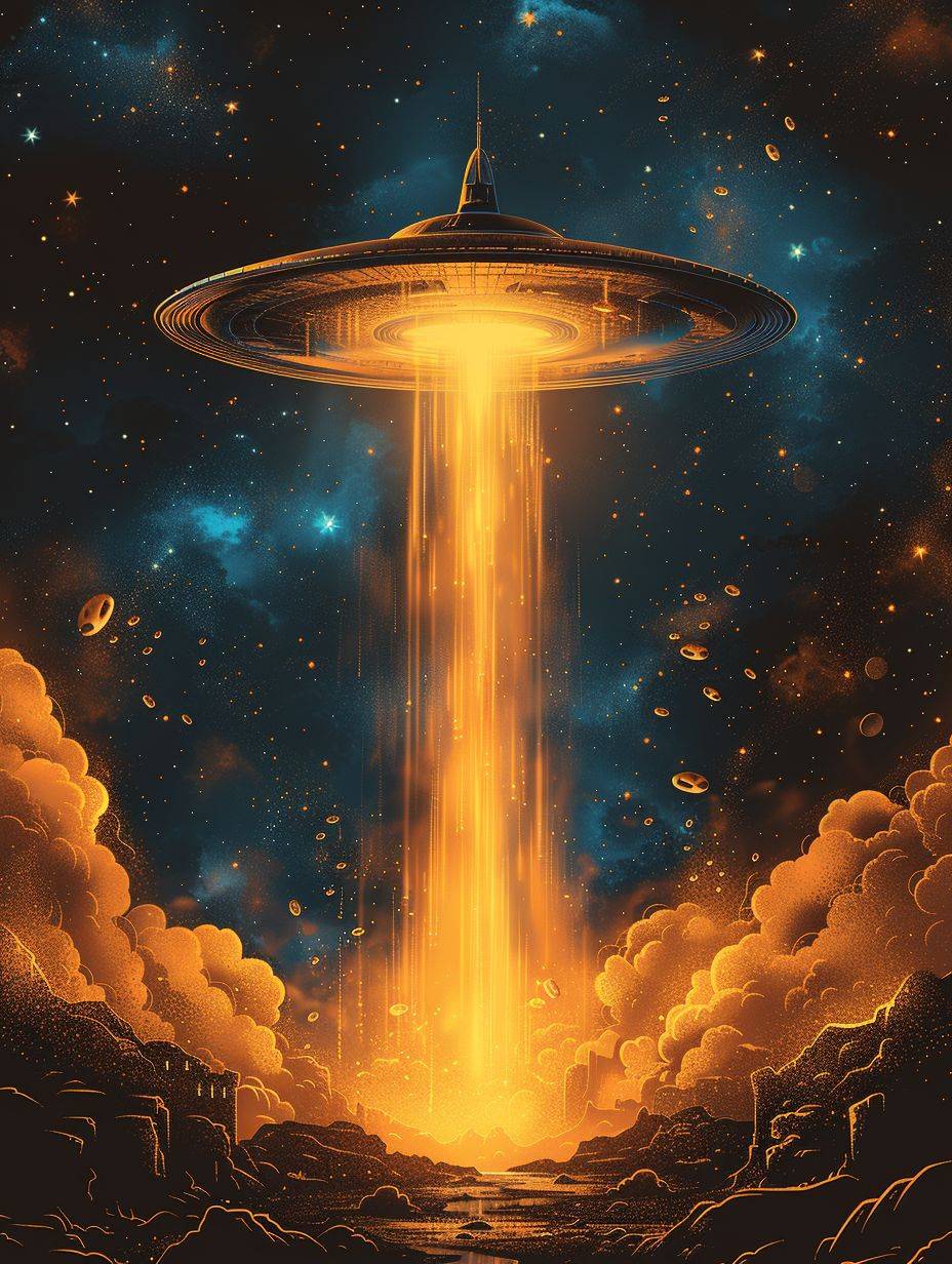 Ceci est une illustration graphique sur les OVNIs et les vaisseaux spatiaux, avec des couleurs vives et un style minimaliste.