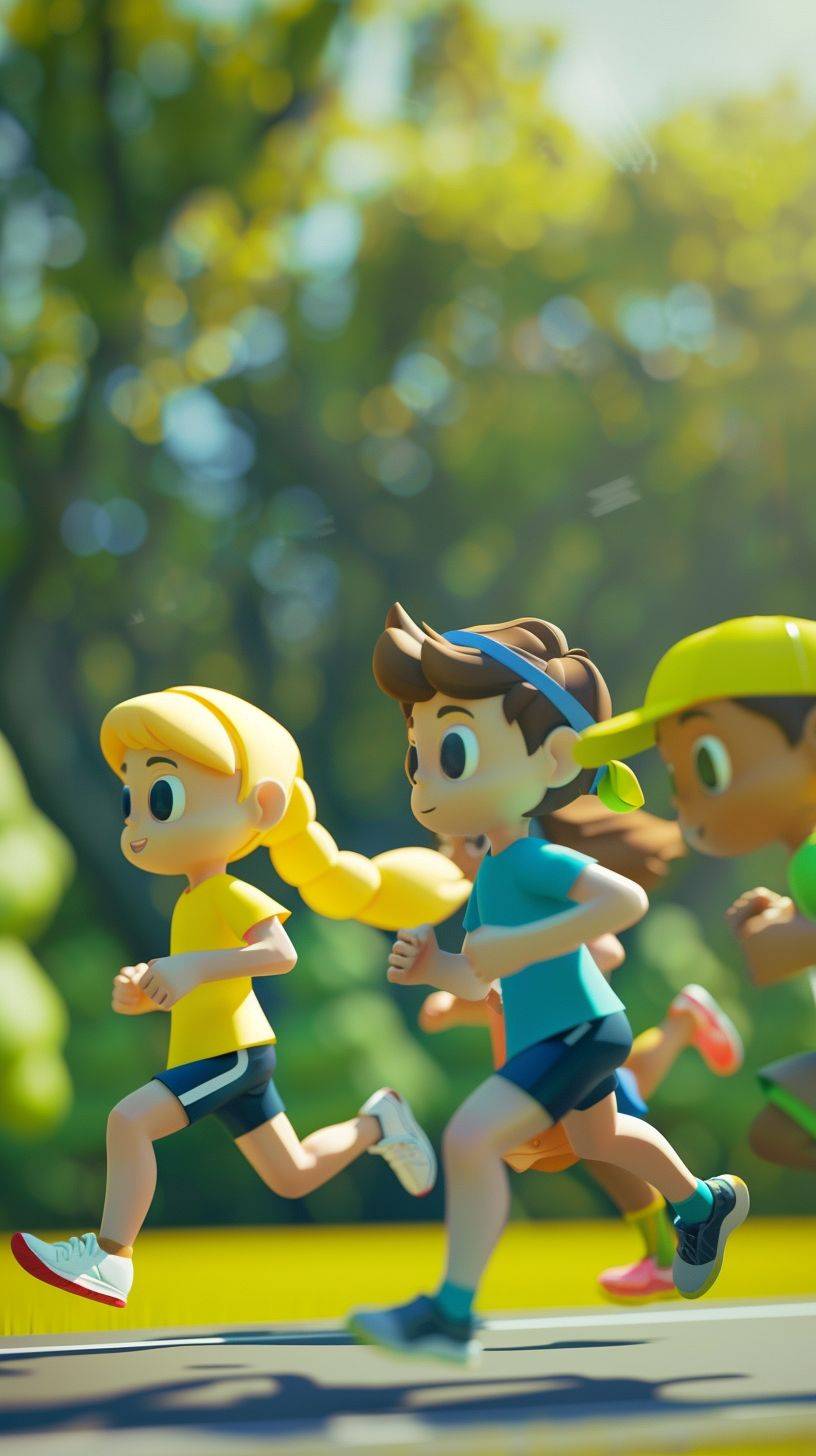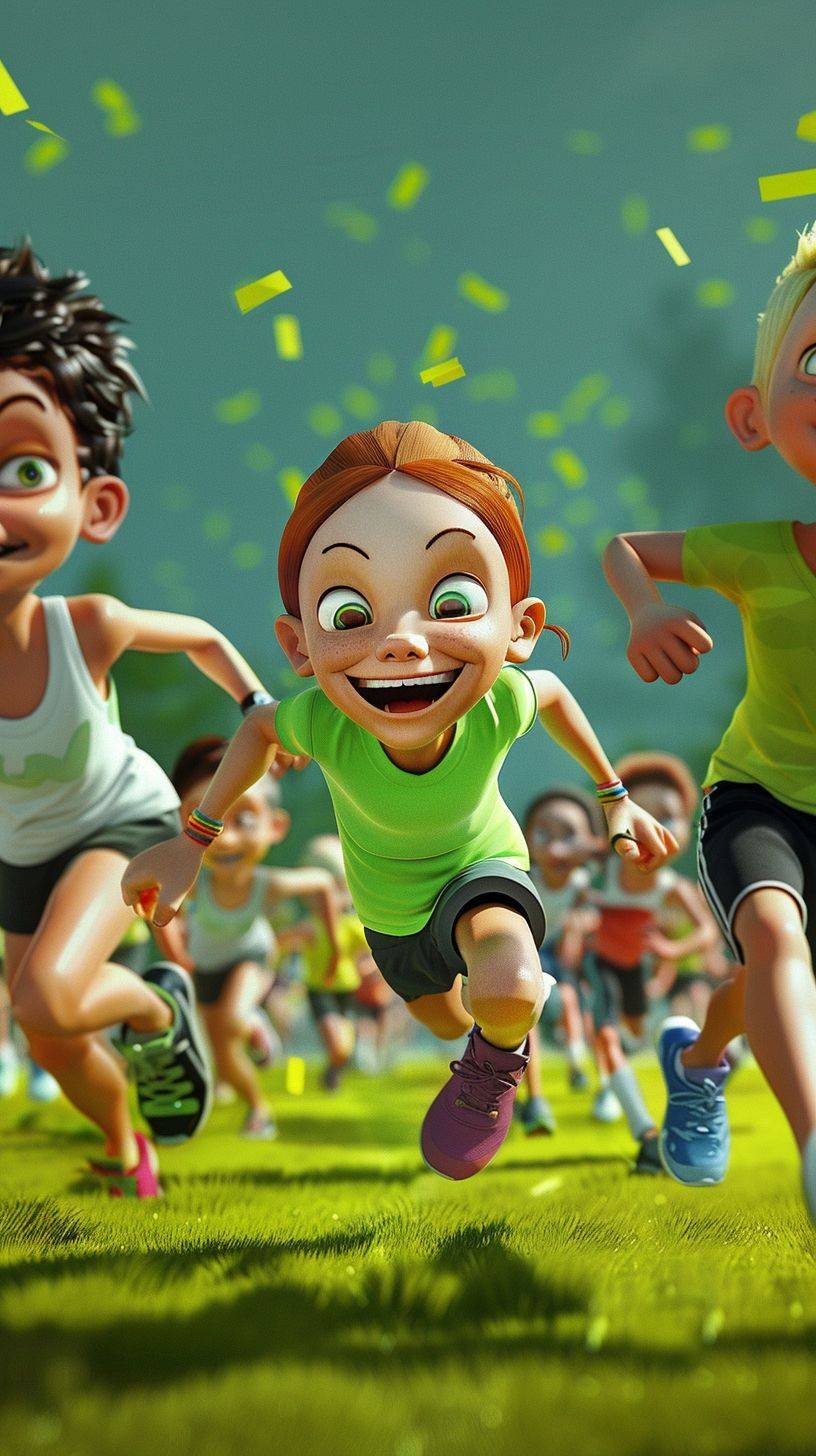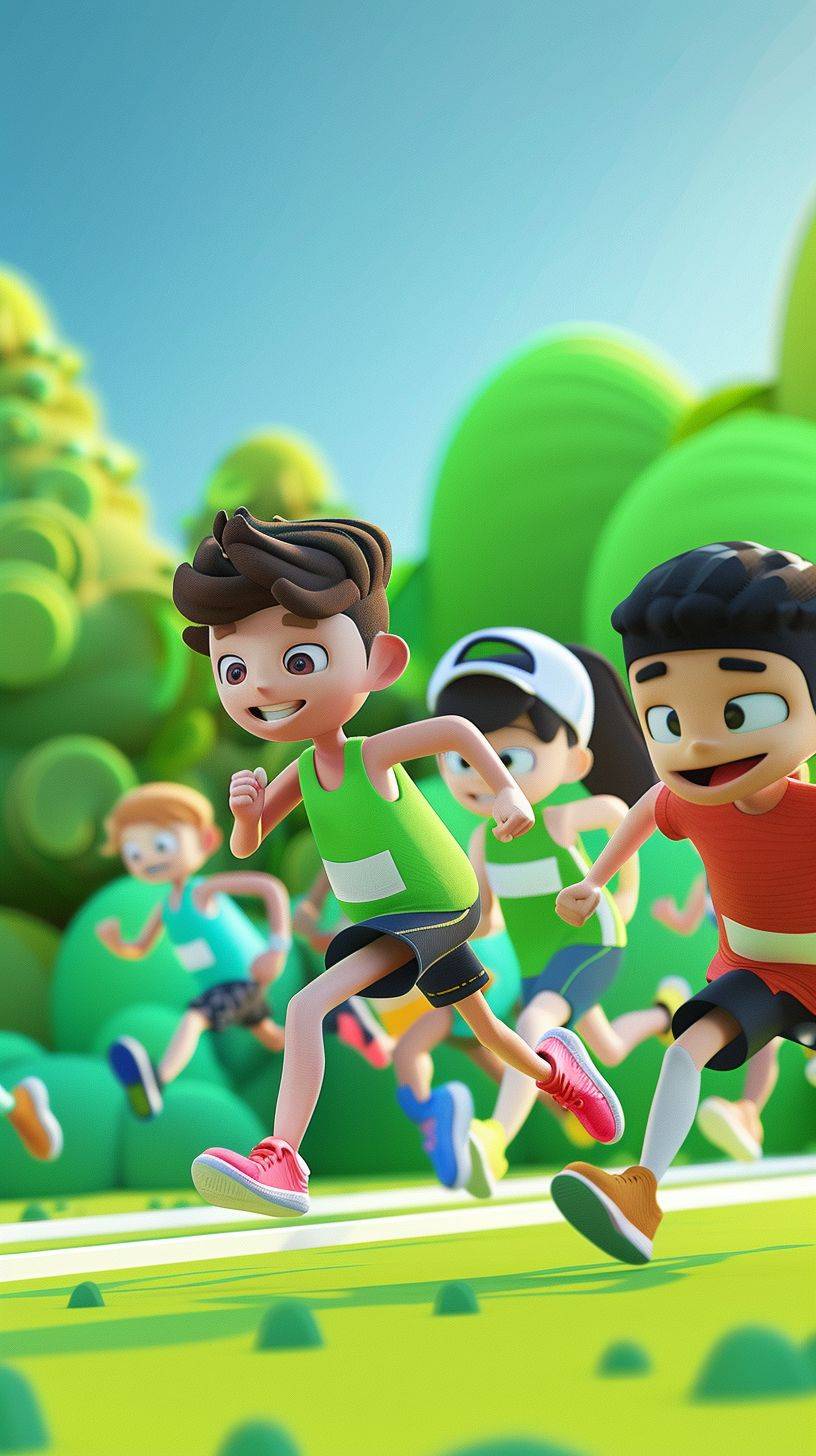 Cartoon characters in the race, boys, girls, running action, marathon, race, in cute cartoon design style, green background, fantastic visual effects, soft sculpture, webcam, bright colors, bold shapes, capture the moment --ar 9:16