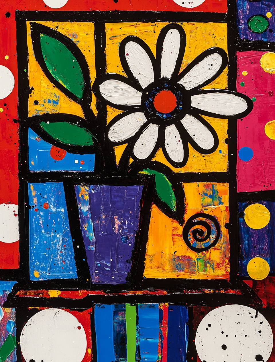 An abstract painting in the style of Romero Britto of an old Victorian window with white polka dots and blue stripes, the background is red and yellow, there's a black spiral in one corner, painted in bright primary colors, a vase on top holds a single large flower that has two green leaves at its base, splashes of paint dripping down from above into it, there are several small colored circles around all the edges of each stroke. --ar 49:64 --v 6.1