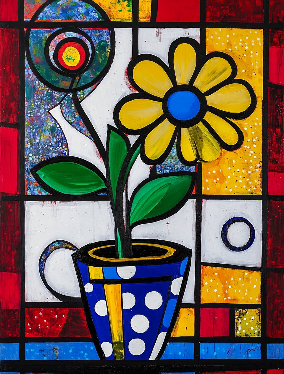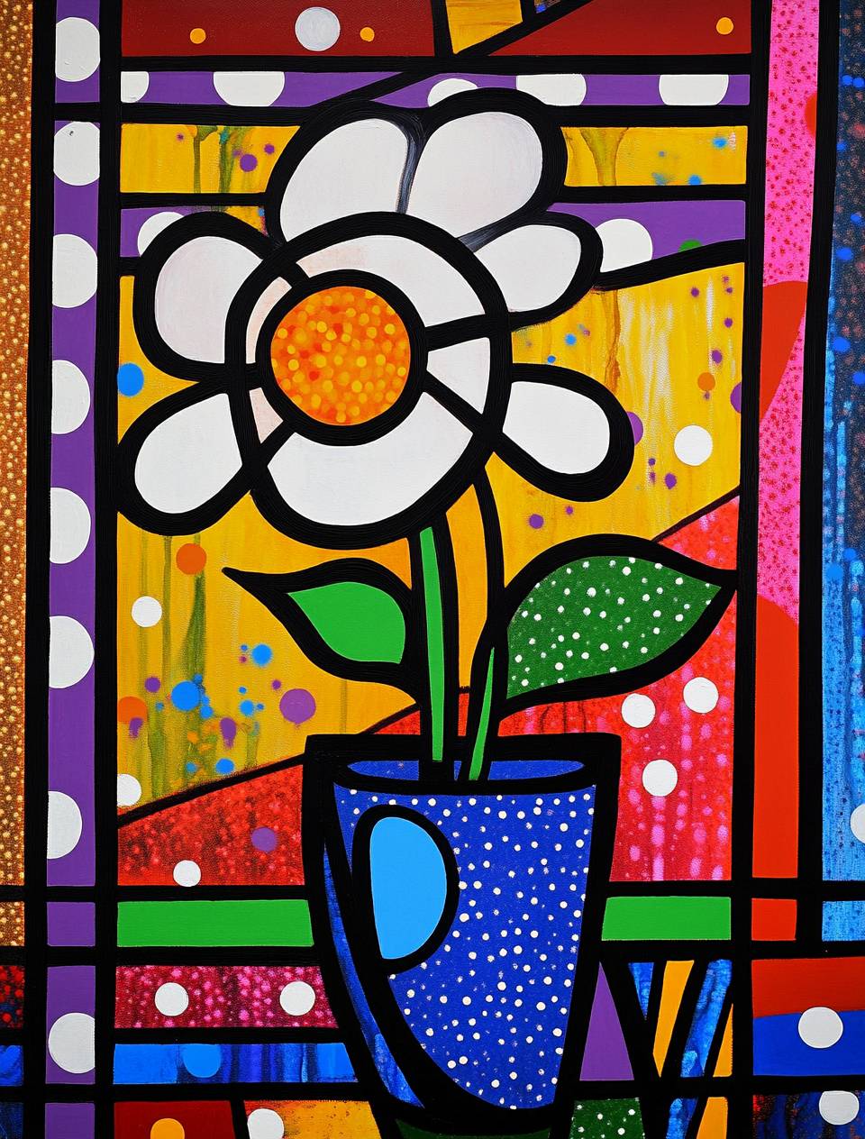 Une peinture abstraite dans le style de Romero Britto d'une vieille fenêtre victorienne avec des pois blancs et des rayures bleues, le fond est rouge et jaune, il y a une spirale noire dans un coin, peinte dans des couleurs primaires vives, un vase au-dessus contient une grande fleur unique avec deux feuilles vertes à sa base, des éclaboussures de peinture s'écoulent d'en haut, il y a plusieurs petits cercles colorés autour de chaque coup de pinceau.