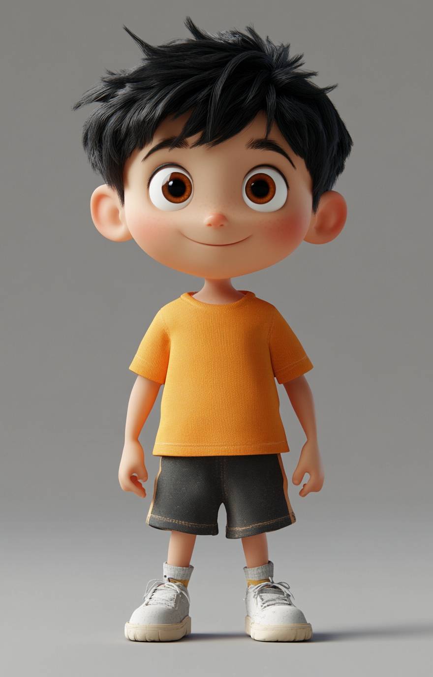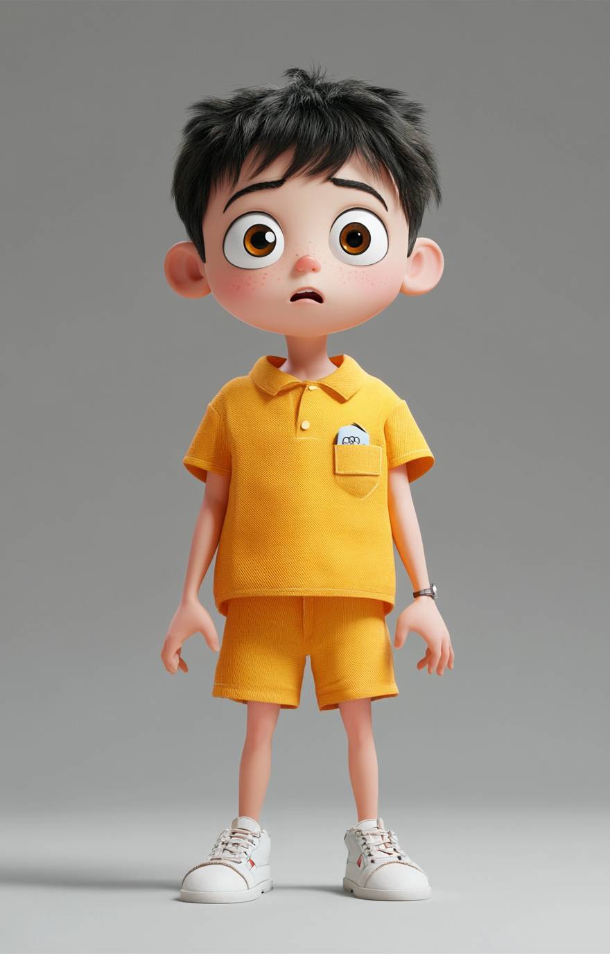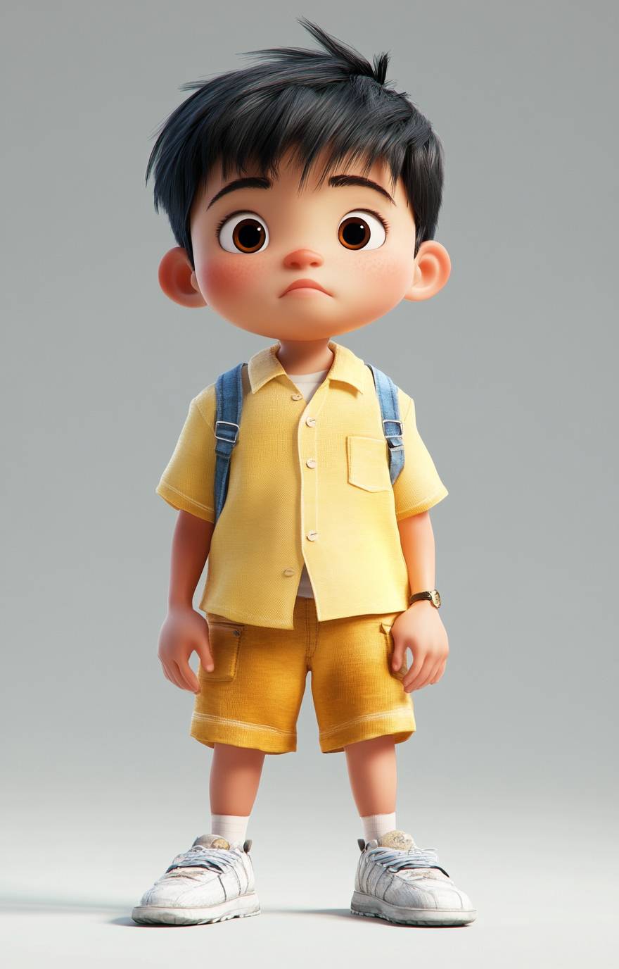 ttps://s.mj.run/5z4SSyJrT3E (Pixar: 1.5), cartoon style, summer clothes, black inch head, bean eyes, child, 1 boy, (white shoes: 1.5), (thin boy wearing yellow clothes: 1.5) (mole on the right side of the face: 1.5) Full body portrait, Q-version, super cute, cute face, gray background, 3D, model, OC rendering, 16k --ar 9:14 --v 6.1