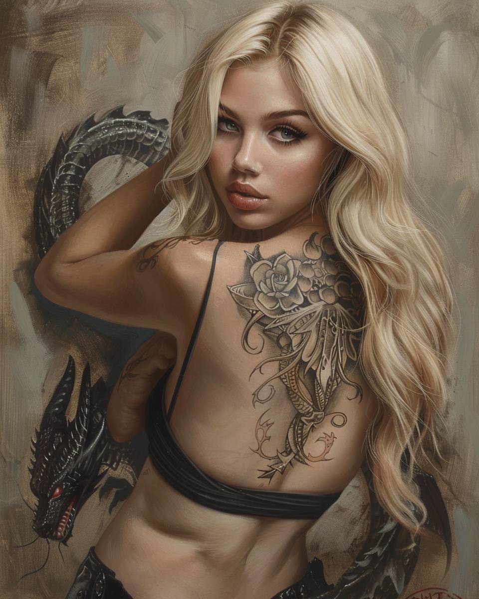 Hyperrealism pose of a blonde-haired, kawaii anime beautiful woman with a black dragon tattoo on her back in the style of light gray and light brown, with a Chicano-inspired aesthetic, shot with a Fujifilm XT4, featuring a voluminous mass, handsome, and luminous quality --ar 4:5 --style raw --v 6.0