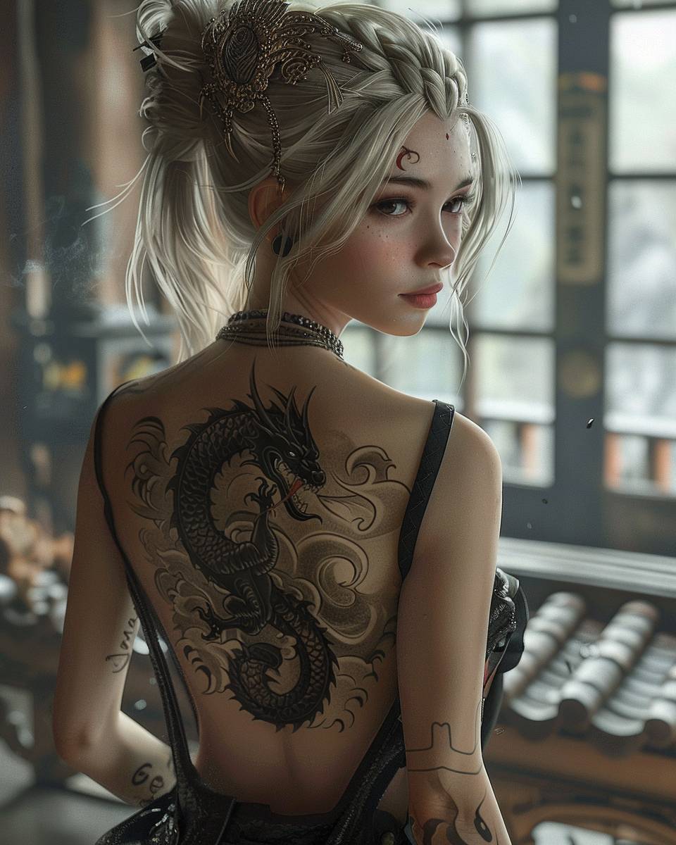 Femme anime kawaii hyperréaliste avec un tatouage de dragon