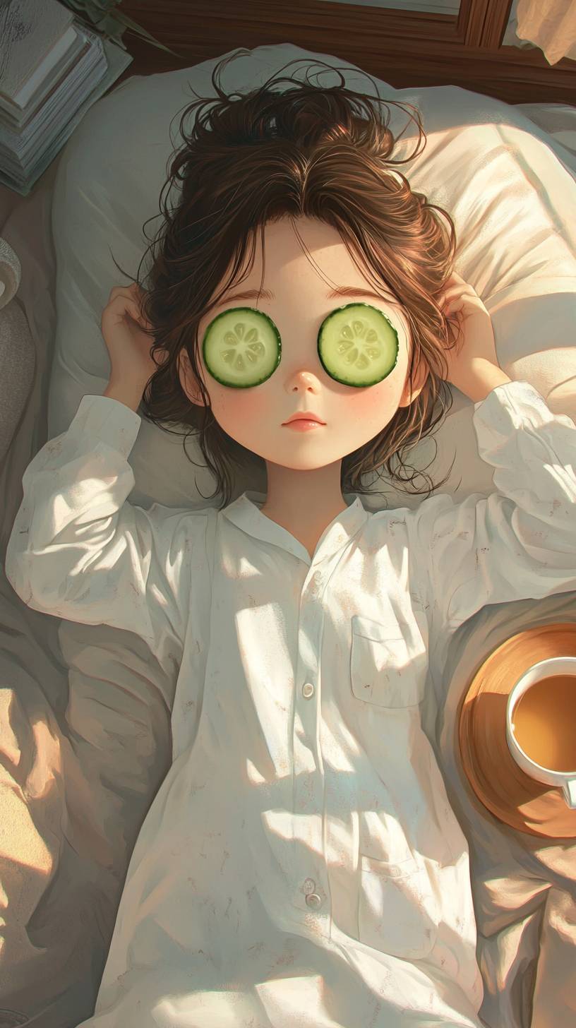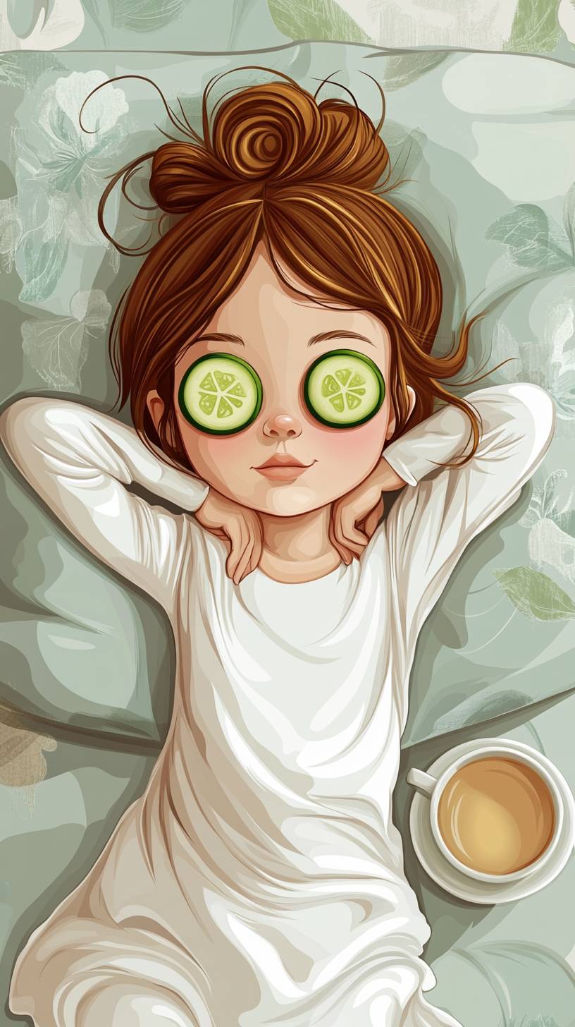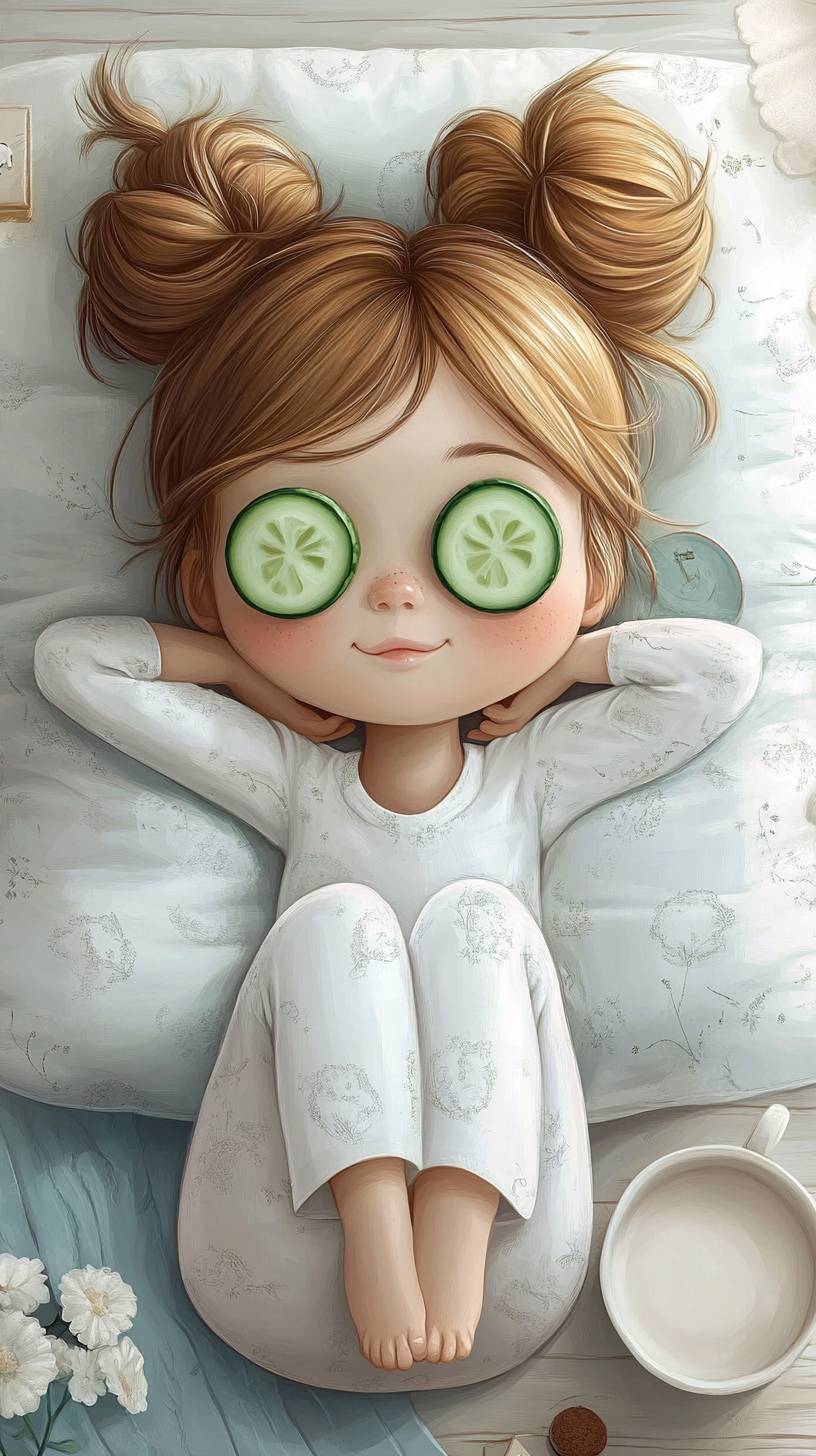 Little girl in white pajamas with two cucumber slices on her eyes, lying on a cushion with a cup of milk tea next to her, cartoon image, cute style --ar 9:16 --v 6.1