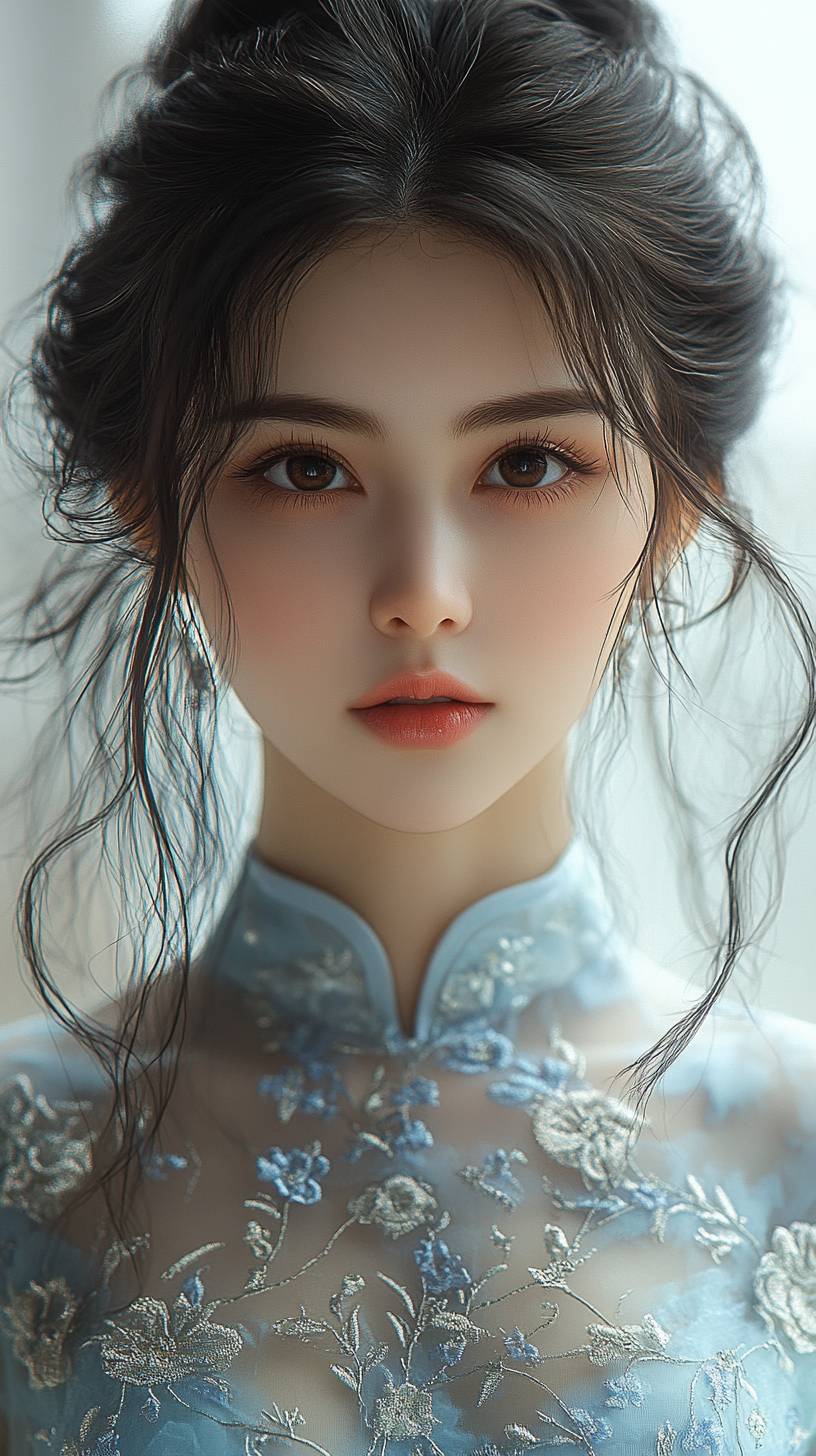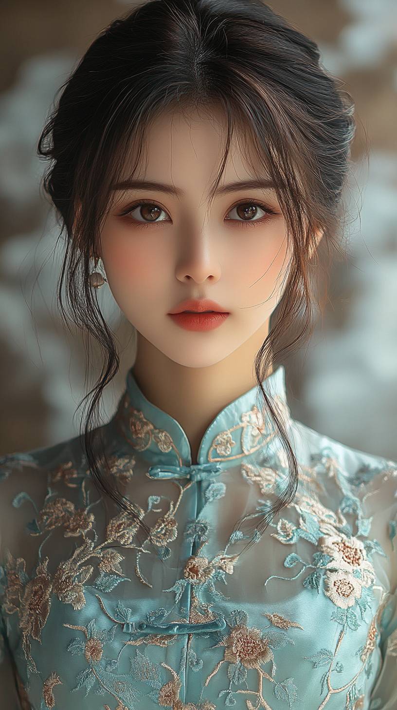 Une belle fille chinoise avec des traits délicats, des cheveux noirs et des yeux marron portant un cheongsam en cyan clair brodé, regardant le spectateur sur fond de nuages éthérés, dans un gros plan de face avec un éclairage doux et une palette de couleurs rêveuses, en haute définition et haute résolution dans un style photographique hyper réaliste.