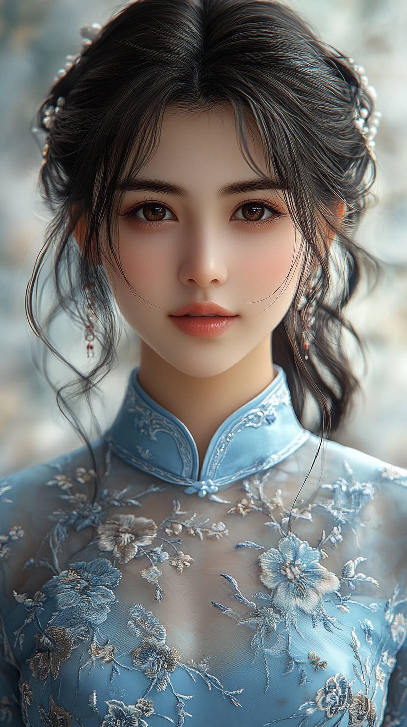 A beautiful Chinese girl with delicate facial features, black hair and brown eyes wearing an embroidered light cyan cheongsam in the style of digital art, looking at the viewer against an ethereal cloud background in a front view close-up shot with soft lighting and a dreamy color palette at high detail and high resolution in a super realistic photographic style.a light background, soft lighting, ultra-high definition details, and digital art that is realistic photography. --ar 9:16 --stylize 750 --v 6.1