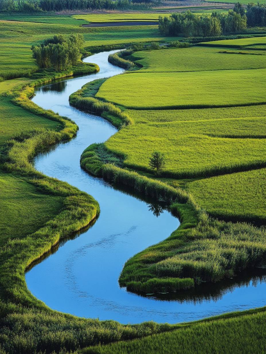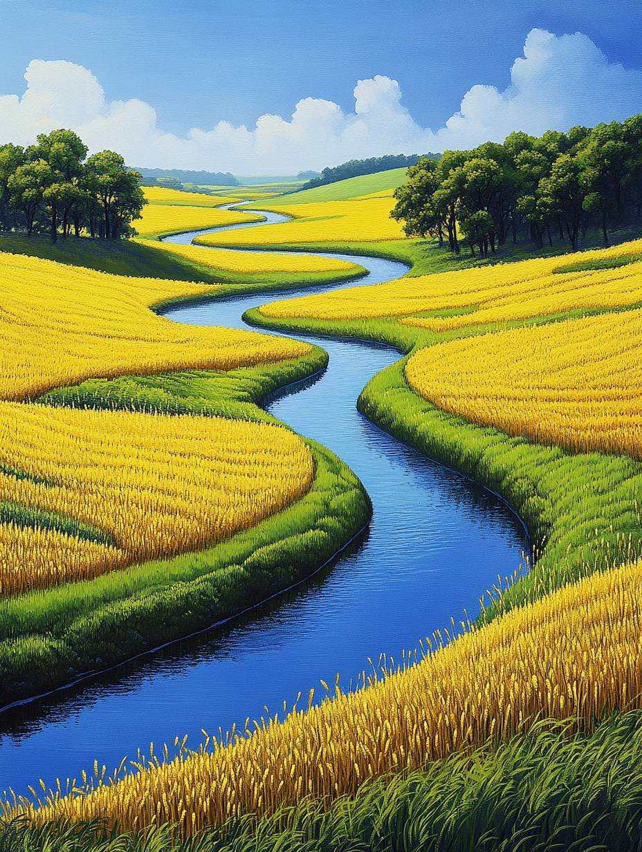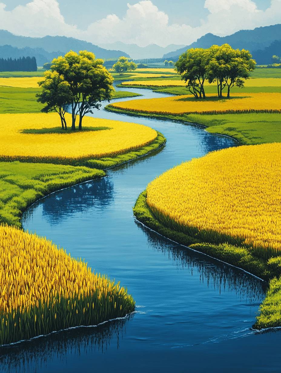 La rivière sinueuse coule à travers les champs verts, créant des paysages pittoresques. L'eau bleue reflète le ciel et les arbres dans son cours, tandis que les champs de blé dorés se balançant doucement en dessous créent une scène enchantée. C'est l'une de mes images préférées qui capture la beauté de la nature à son meilleur. La scène est représentée dans le style d'un artiste chinois connu pour ses paysages.