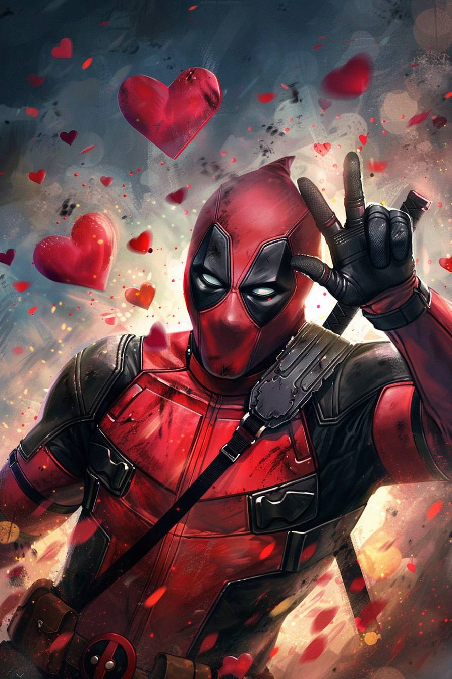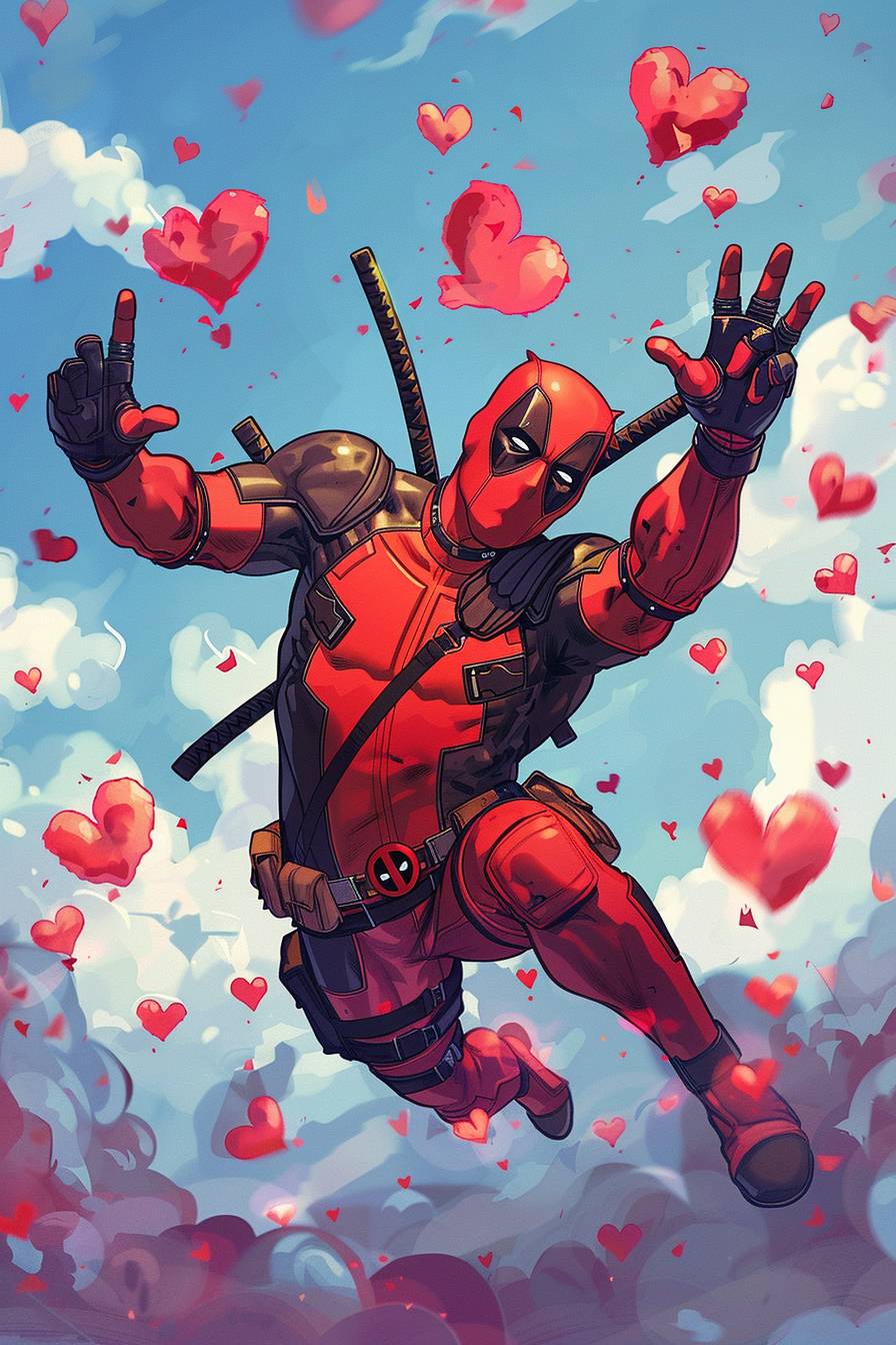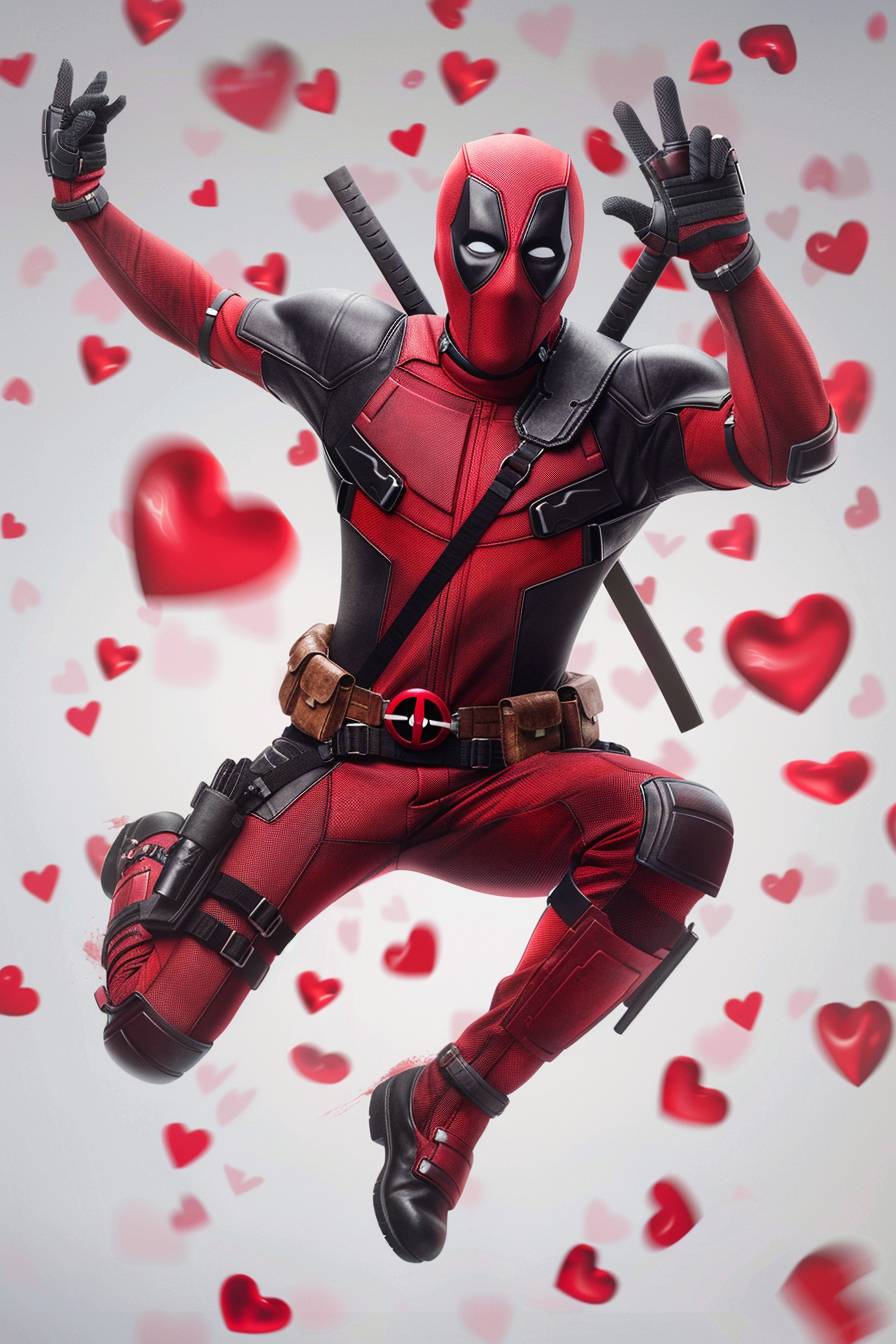 imagine Deadpool jumping half way on the air and doing a heart-shaped hand sign in a cute way with hearts fly around him --ar 2:3 --v 6.0