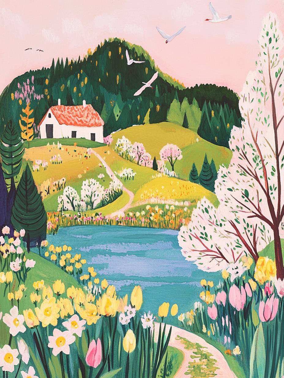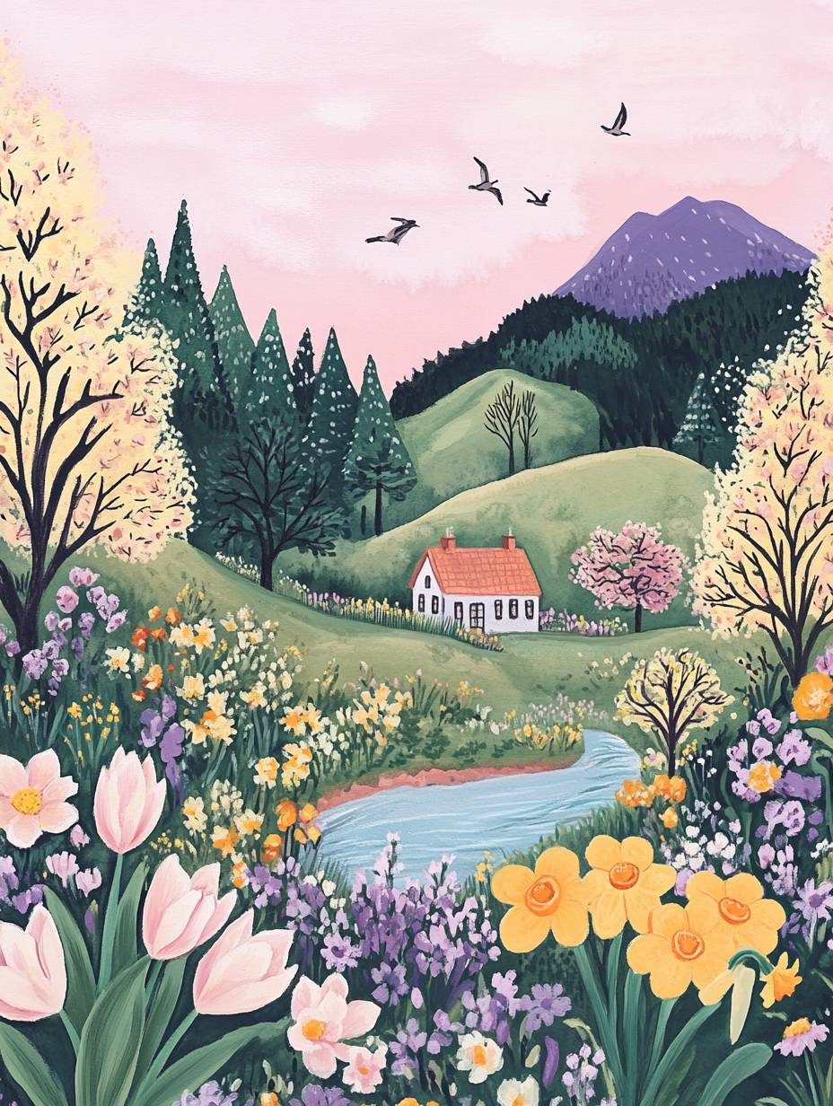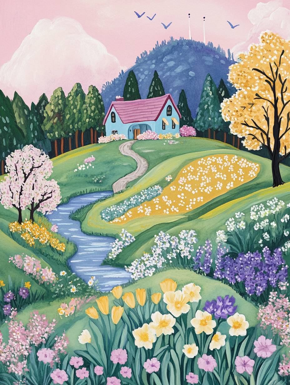 A whimsical gouache illustration of an animal in nature, inspired by the meticulous style and pastel colors of muumegu. The setting is adorned with spring flowers like daffodils and tulips, under a sky painted with soft pinks and purples. There's also a house nestled on top of lush green hills, reflecting wimmelbilder aesthetics. A gentle river flows beside it, flanked by trees that gently sway to music from distant cranes. In the background stands a small mountain covered in vibrant greens. --ar 3:4 --v 6.1
