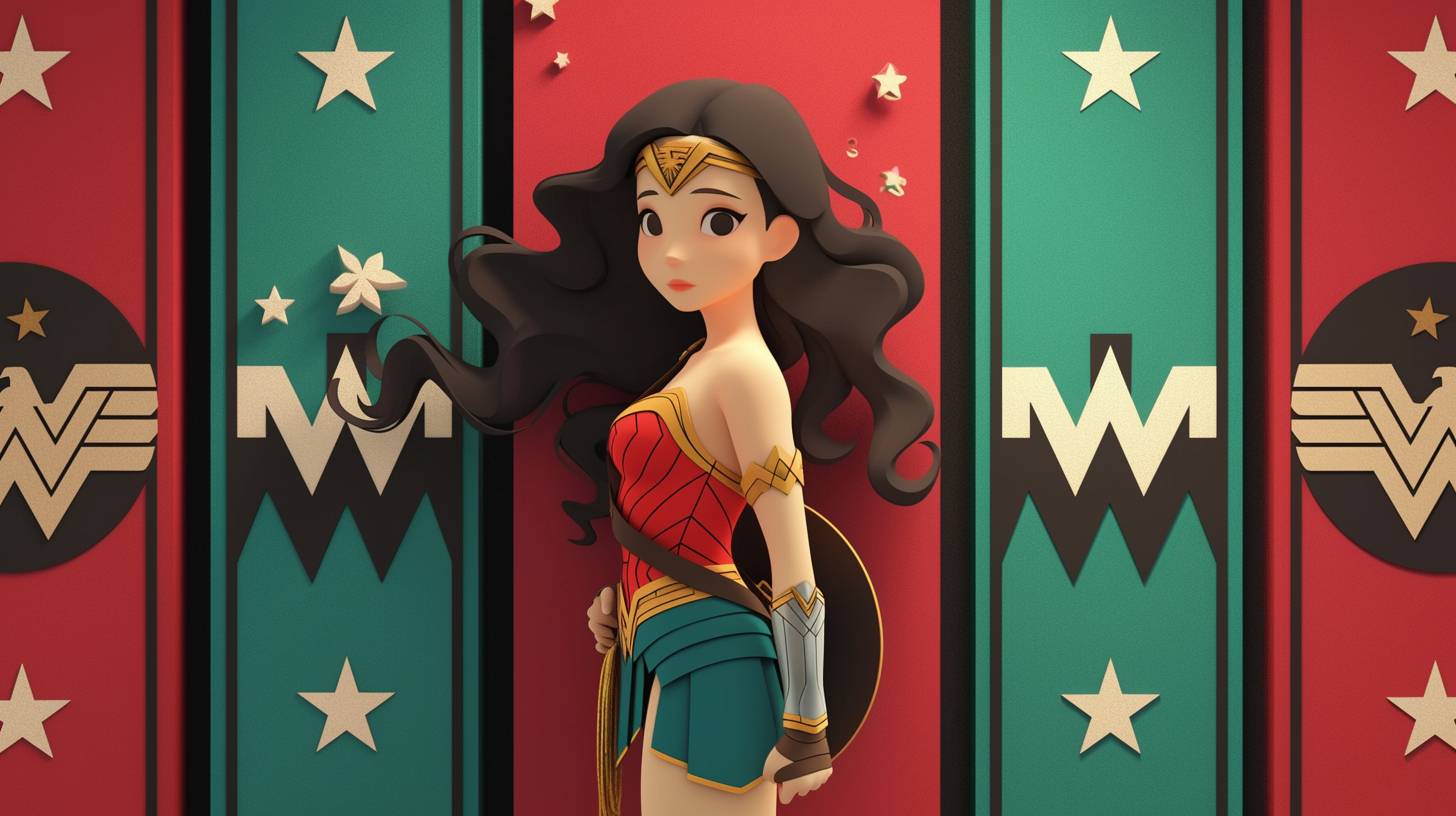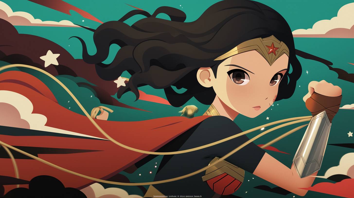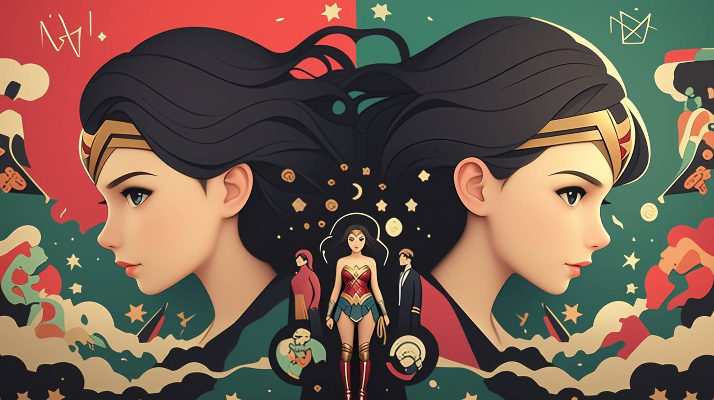 wonder woman, in the style of bold and graphic compositions, mosaic-like collages, pop culture mashup, multiple screens, light red and light bronze, magali villeneuve, macro zoom, outlandish energy, contemporary frescoes, chaotic academia, digital as manual --ar 16:9 --style raw --sref 2203230322 --niji 6