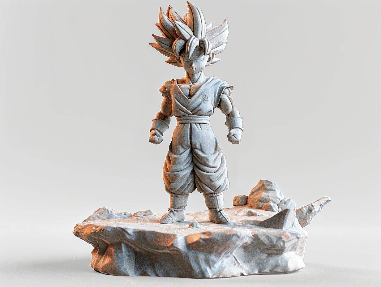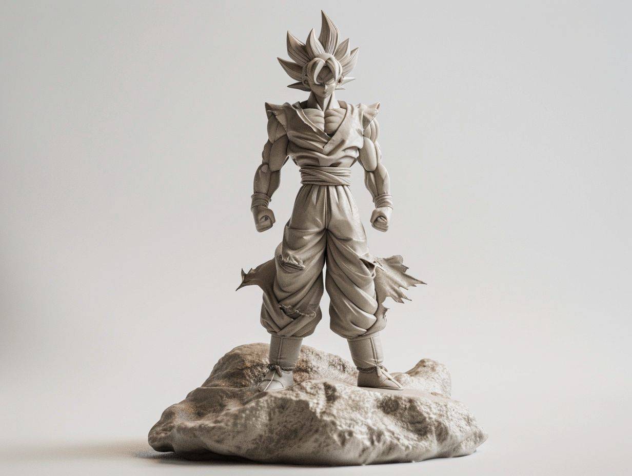 Modèle 3D de Goku, le personnage se tient sur un rocher dans une pose prête au combat. La texture est en argile blanche avec un fond blanc. Objectif de 50 mm, avec des ombres douces, un faible contraste et une mise au point nette.
