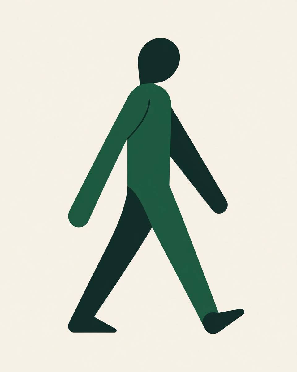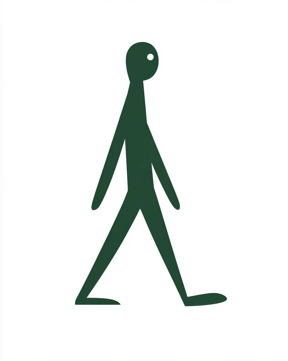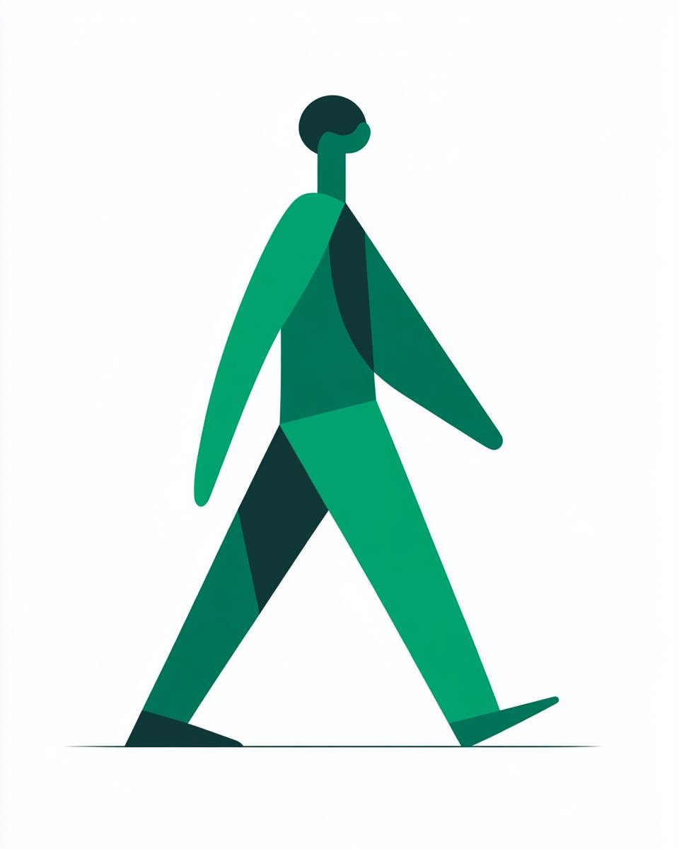 Un personnage vert marchant, lignes simples, formes audacieuses, style de design plat, dans le style de Paul Rand et Gerd Arntz, fond blanc, couleur émeraude avec des reflets brillants, détails simples, impression d'art minimaliste, pas de texte dans le cadre, vecteur haute résolution.