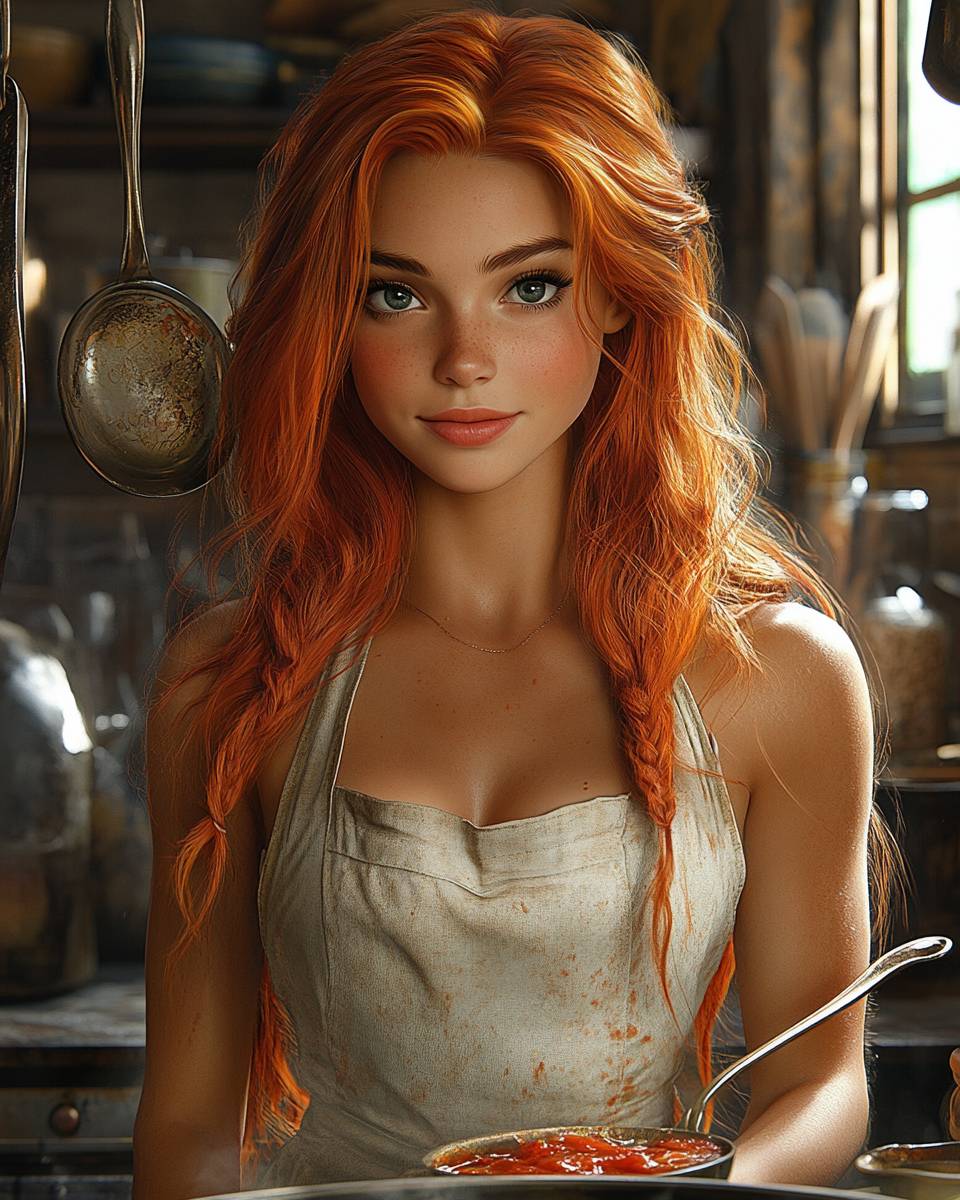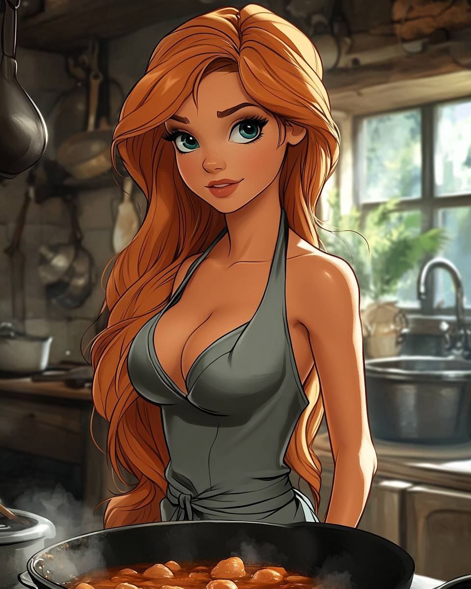 La petite sirène Ariel cuisine du bortsch dans la cuisine en portant un tablier.