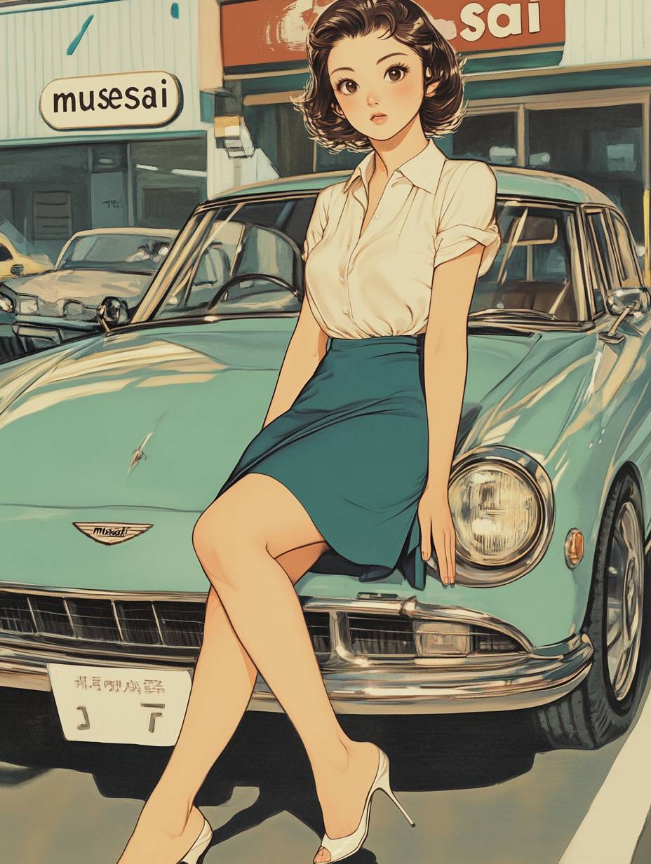 The comic, an Asian woman with short hair and blue skirt sitting on the hood of her car in front of it is "musesai", wearing white shirt and green mini skirt. She has delicate features, big eyes, slender legs, long legged girl body shape, high heels, barefoot. The background includes garages, parking laries, vintage cars, and Japanese animation style. Anime aesthetic. Manga art. Hayao Miyazaki anime style. High definition details. Fine lines. Colorful. High resolution. High quality --ar 3:4 --v 6.1