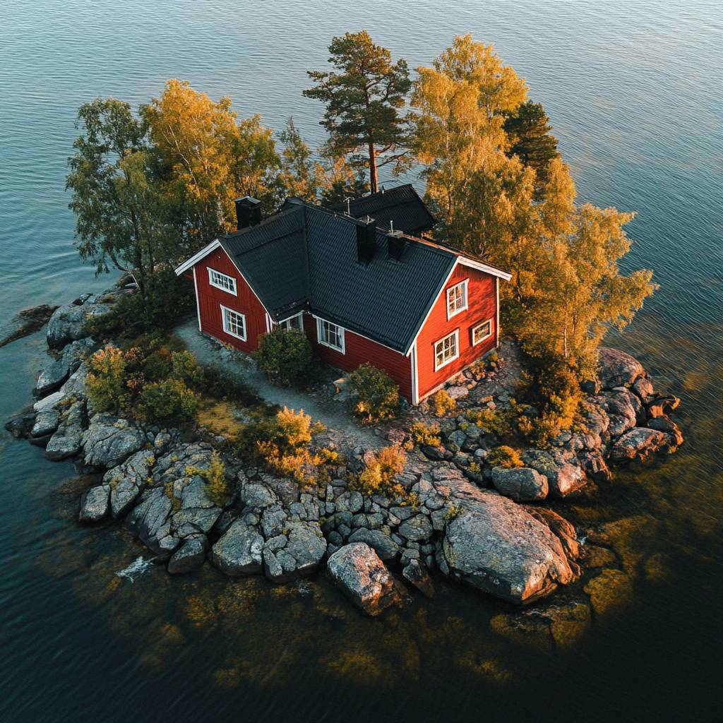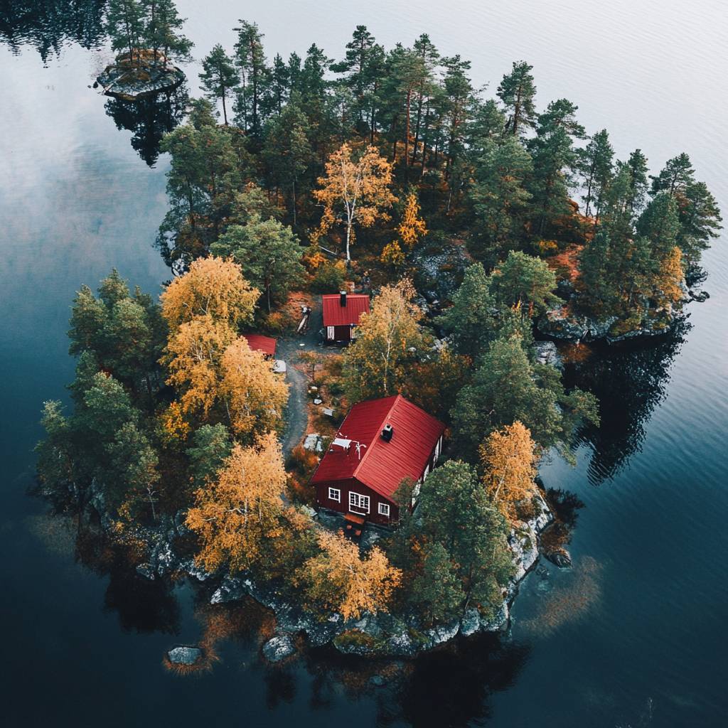 Photographer Captures The Changing Beauty Of Kotisaari Island In Finland from above, kitsch and camp charm, with red house